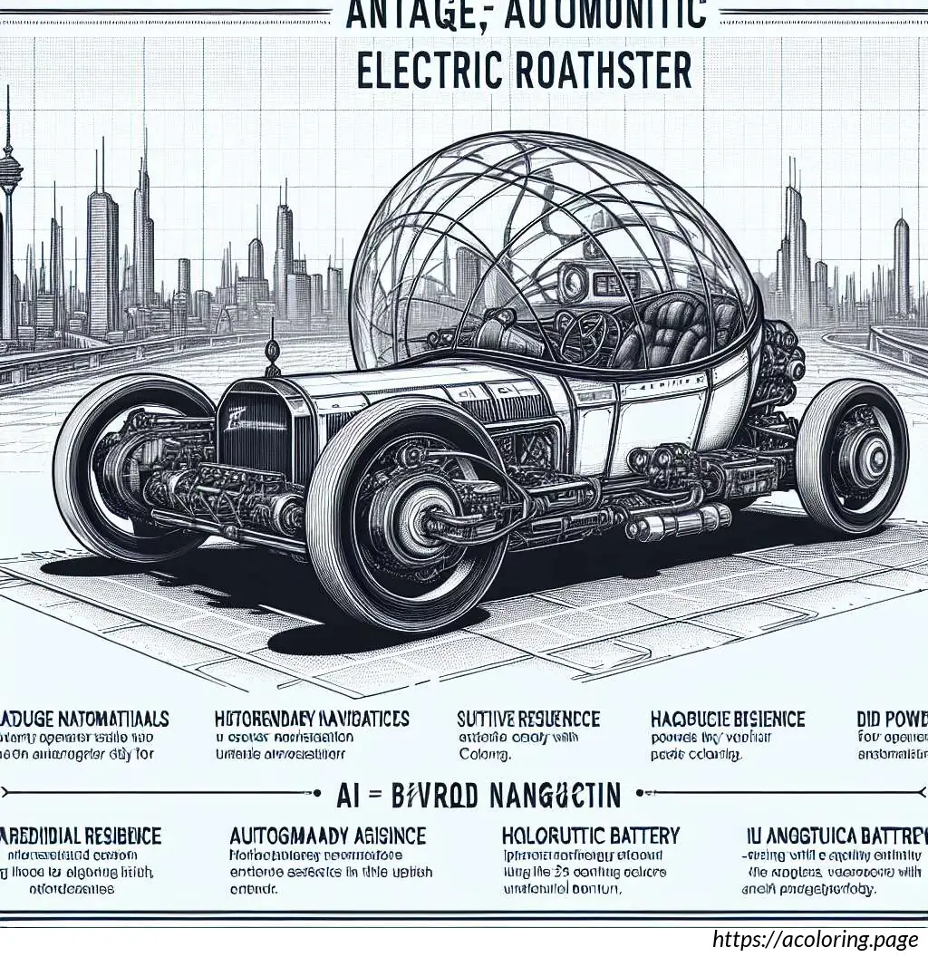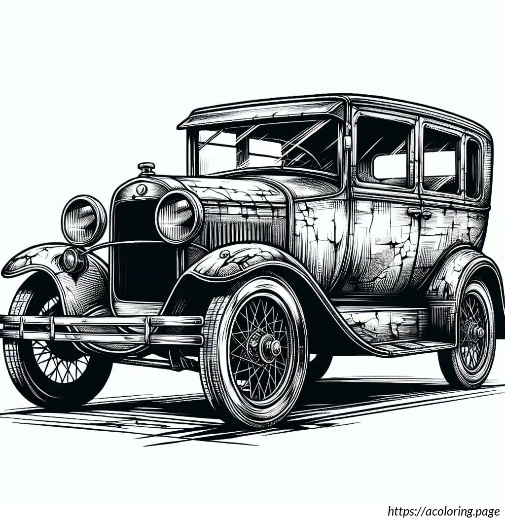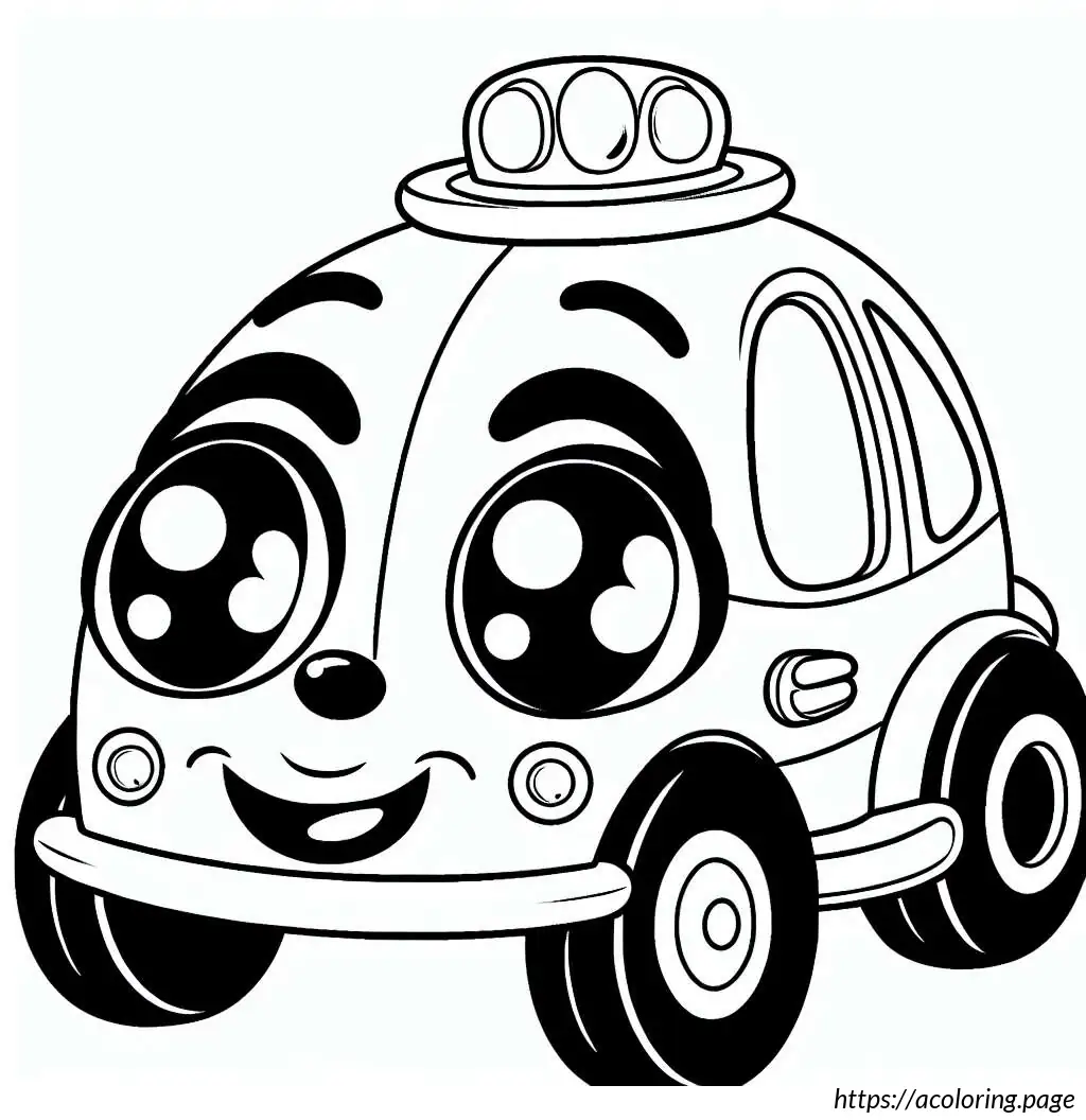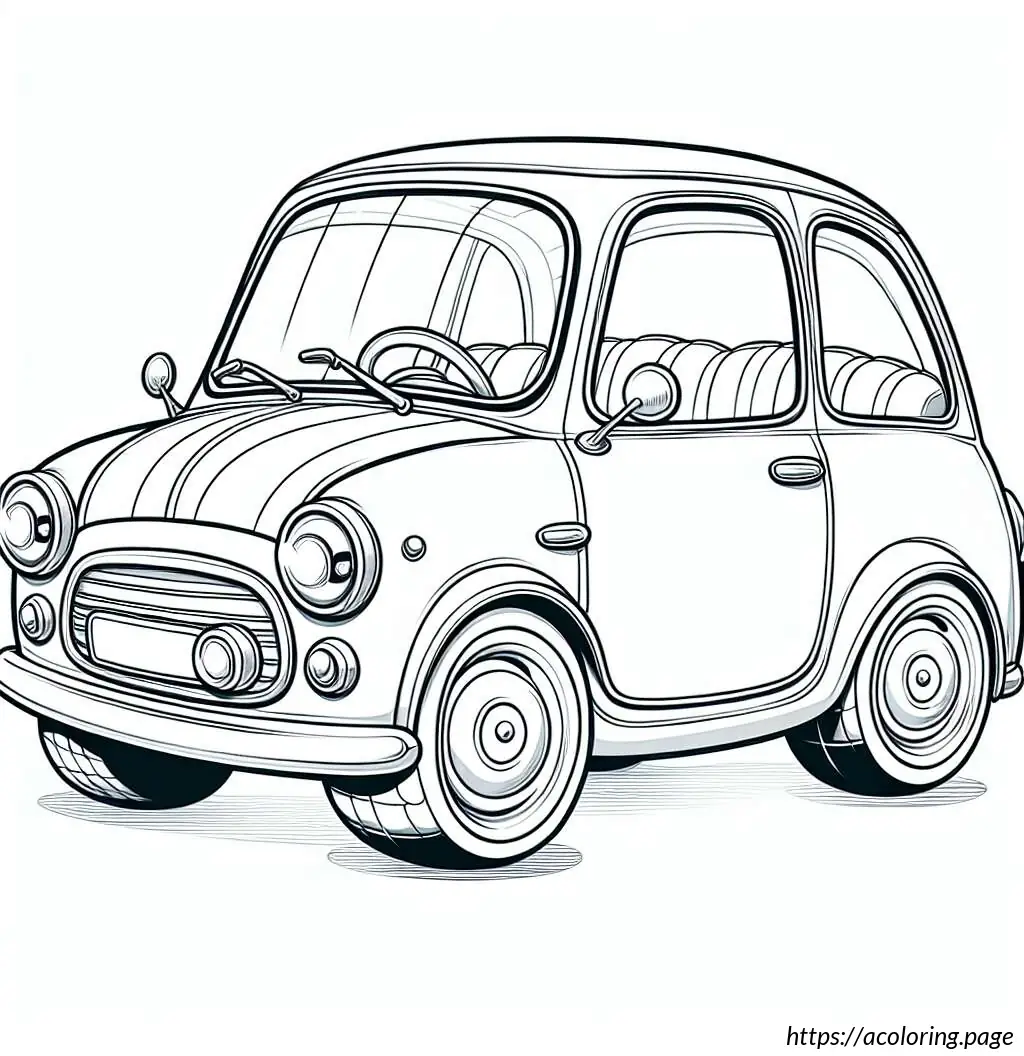 The image shows a cartoon-style line drawing of a classic car. The car is depicted with exaggerated, rounded features, giving it a whimsical, friendly appearance. It features large, rounded headlights and similarly styled wheels that are prominently displayed. The windows of the car are simple outlines without any intricate detail, adding to the childlike, playful design of the image. The car has a front bumper that curves around the bottom and separate fenders over the wheels that bulge outward. The overall look suggests that the image might be appealing for coloring activities, especially for children, due to its bold outlines and simple shapes.