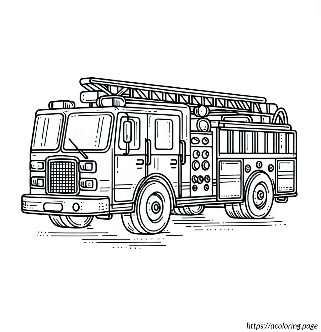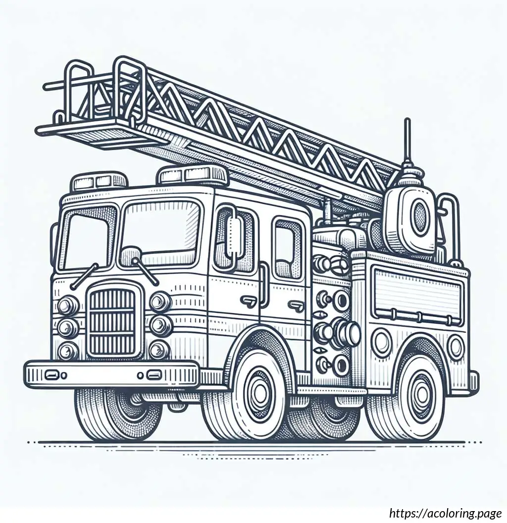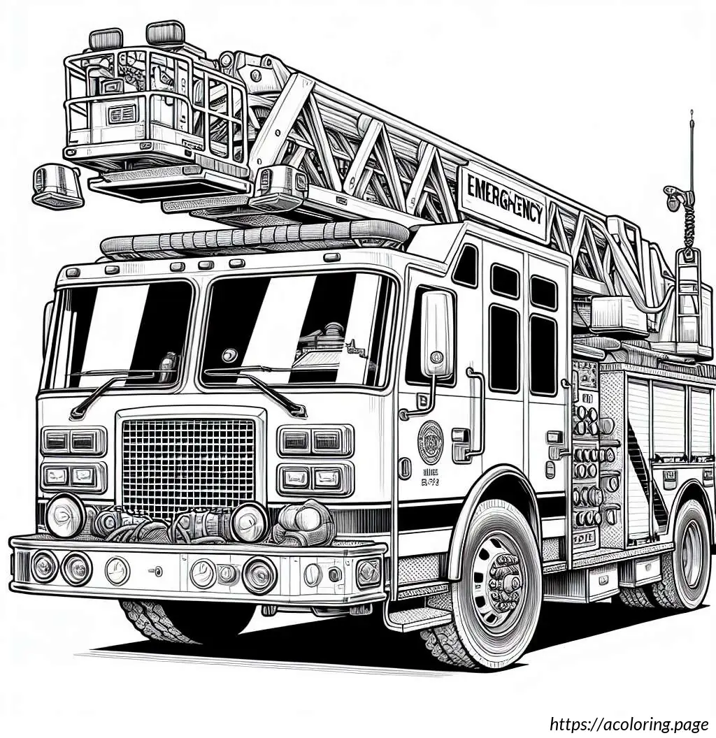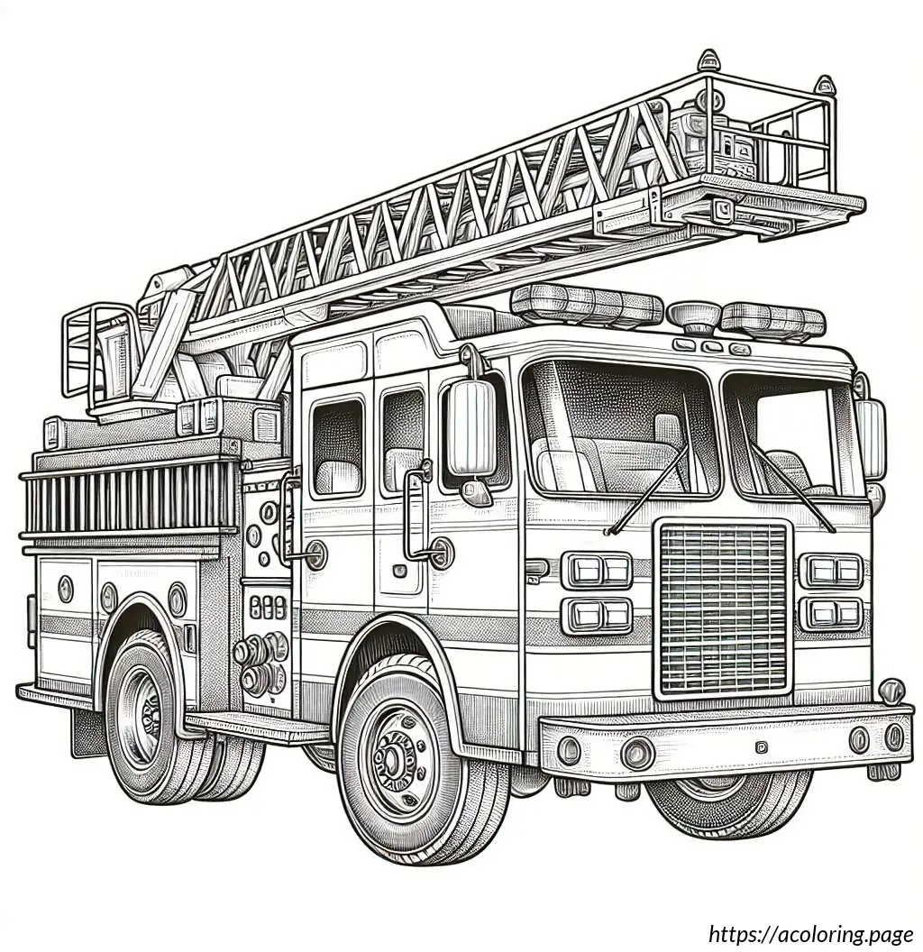 The image depicts a black and white line drawing of a fire truck. The vehicle is detailed with features indicating it”s a specialized emergency service truck, typically used by fire departments. The front of the truck has windows, headlights, and a grille. The main body of the truck shows several compartments, likely used for storing firefighting equipment and tools. Extending from the top of the truck is a large articulated ladder with a platform or basket, which is useful for reaching high places during firefighting operations. The truck is also mounted on wheels, suggesting it”s ready for action. The design is simple, which makes it ideal for coloring activities.