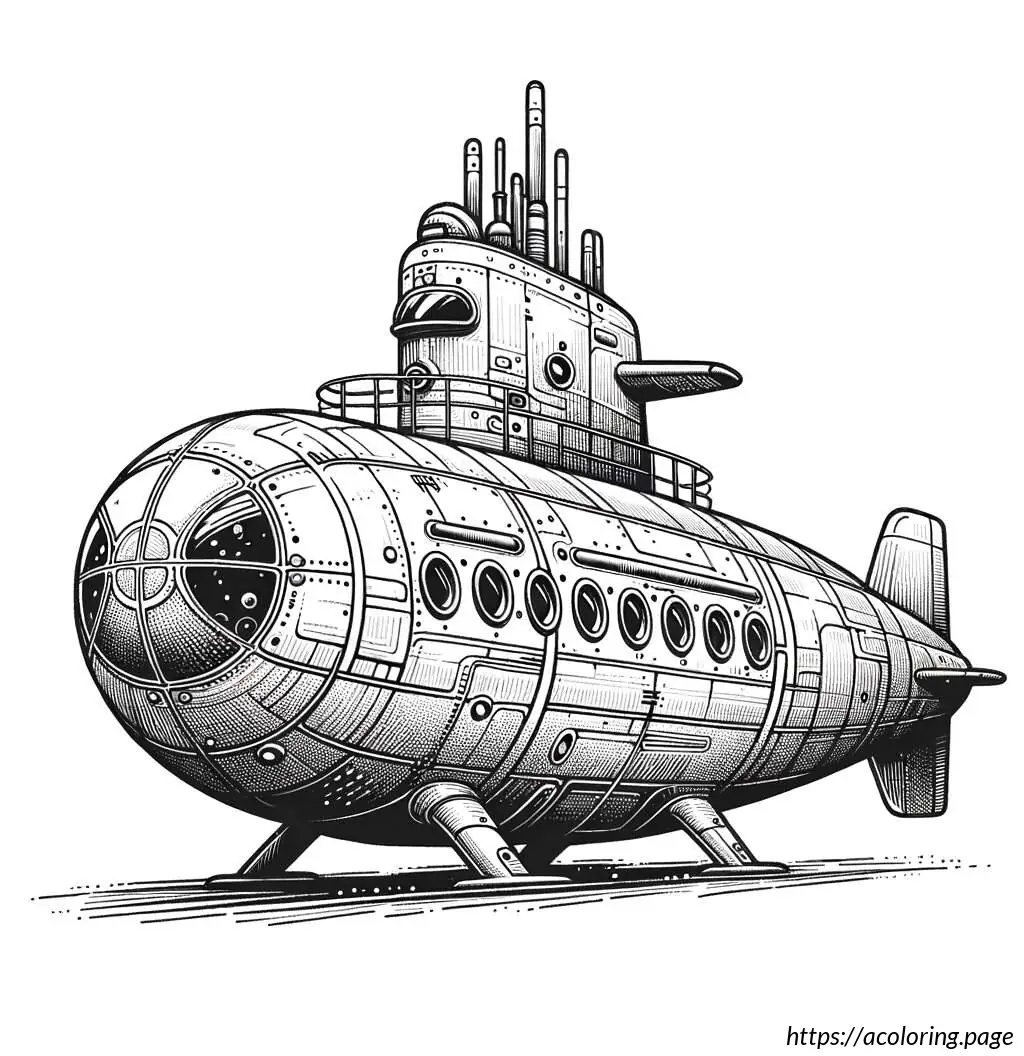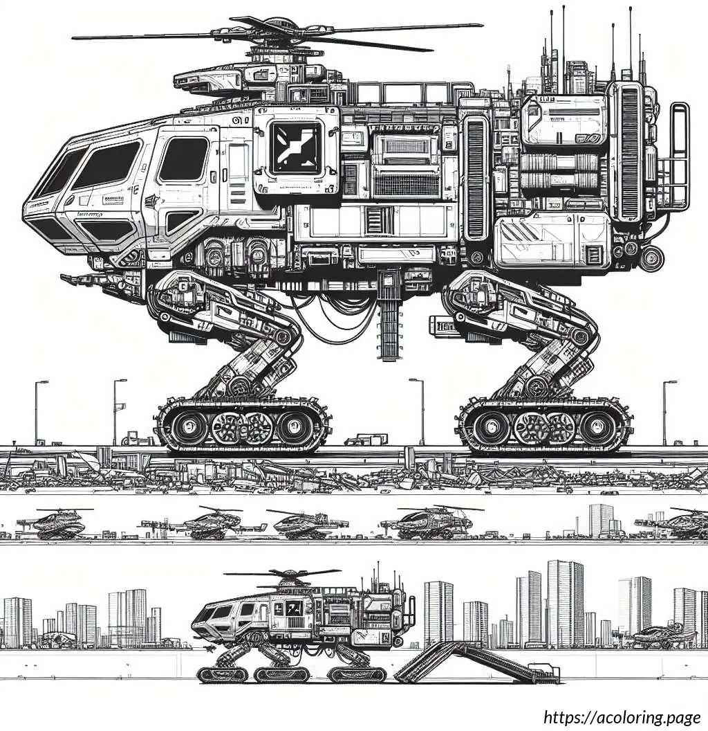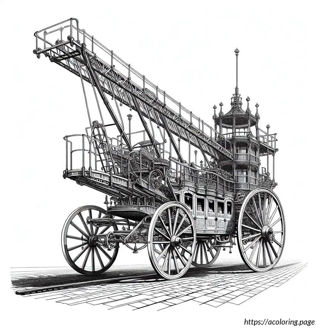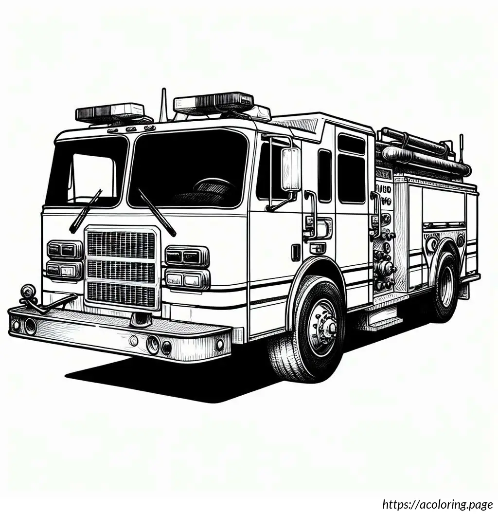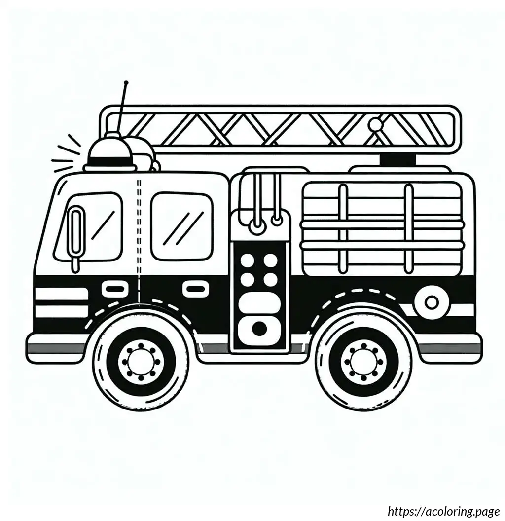 The image depicts a black and white line drawing of a fire truck. The vehicle is detailed with features indicating it”s a specialized emergency service truck, typically used by fire departments. The front of the truck has windows, headlights, and a grille. The main body of the truck shows several compartments, likely used for storing firefighting equipment and tools. Extending from the top of the truck is a large articulated ladder with a platform or basket, which is useful for reaching high places during firefighting operations. The truck is also mounted on wheels, suggesting it”s ready for action. The design is simple, which makes it ideal for coloring activities.