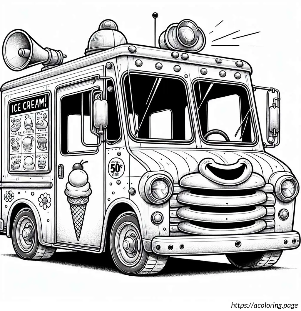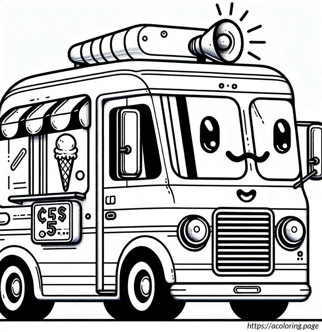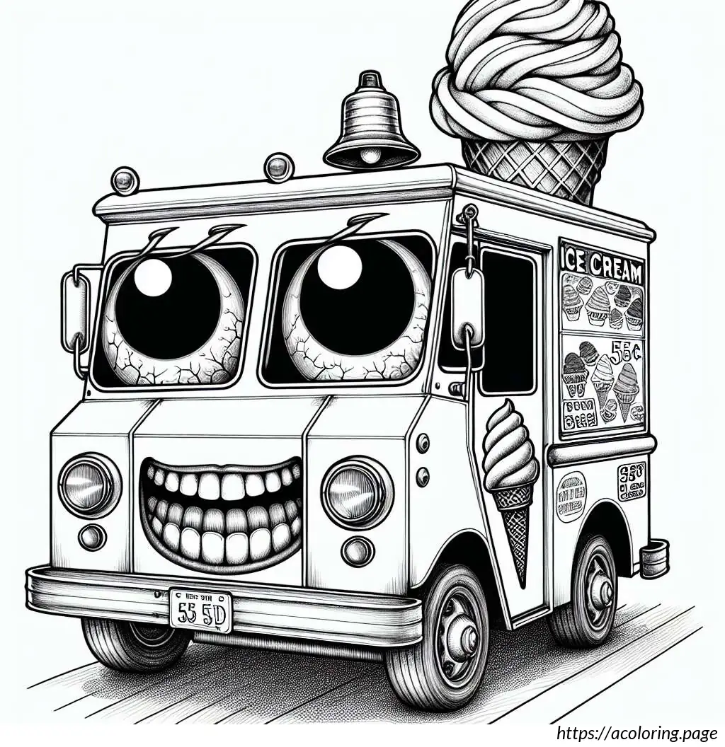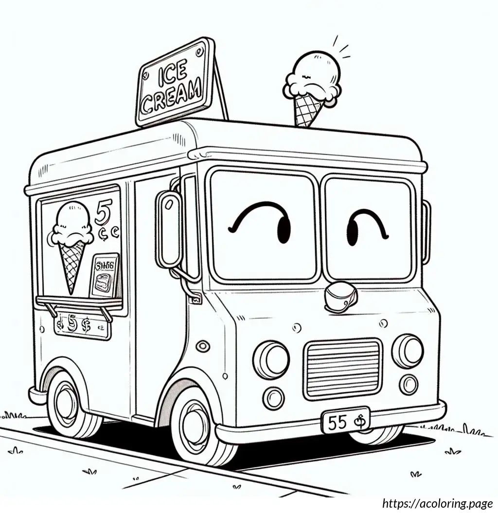 The image depicts a whimsical, cartoon-style ice cream truck. The truck has a rounded shape and a friendly face on its front, featuring big eyes, a nose, and a smiling mouth with visible teeth. One of its headlights is styled to look like a blinking eye, adding to its animated character. The body of the truck displays an image of an ice cream cone with a price tag of 55 cents.On the back half of the truck, there is a striped awning over a window presumably for serving customers. The vehicle is also equipped with a loudspeaker mounted on the top, which is typically used to play music to attract customers.The overall stylization is simplistic and playful, characteristic of illustrations aimed to appeal to children. The drawing is in black and white, using thick lines for outlines and thinner lines for details and textures.