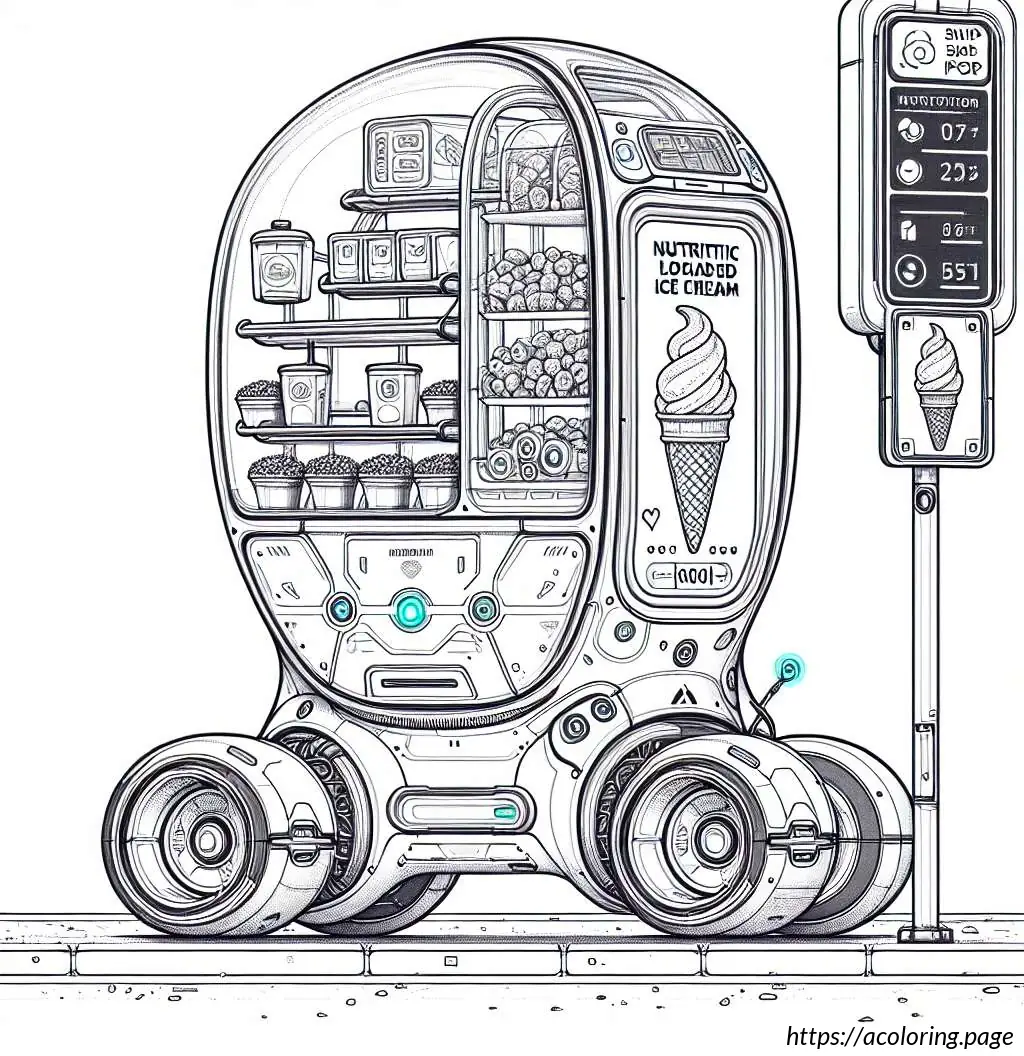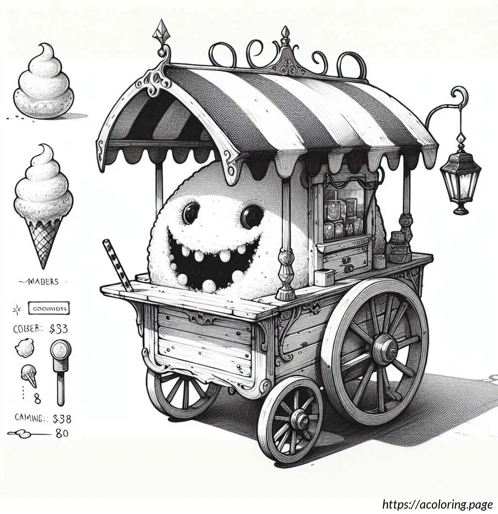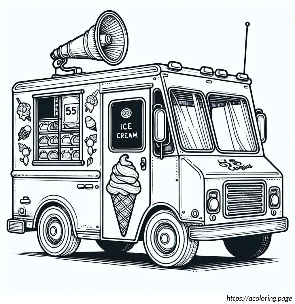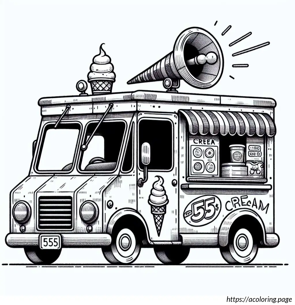 The image depicts a whimsical, cartoon-style ice cream truck. The truck has a rounded shape and a friendly face on its front, featuring big eyes, a nose, and a smiling mouth with visible teeth. One of its headlights is styled to look like a blinking eye, adding to its animated character. The body of the truck displays an image of an ice cream cone with a price tag of 55 cents.On the back half of the truck, there is a striped awning over a window presumably for serving customers. The vehicle is also equipped with a loudspeaker mounted on the top, which is typically used to play music to attract customers.The overall stylization is simplistic and playful, characteristic of illustrations aimed to appeal to children. The drawing is in black and white, using thick lines for outlines and thinner lines for details and textures.