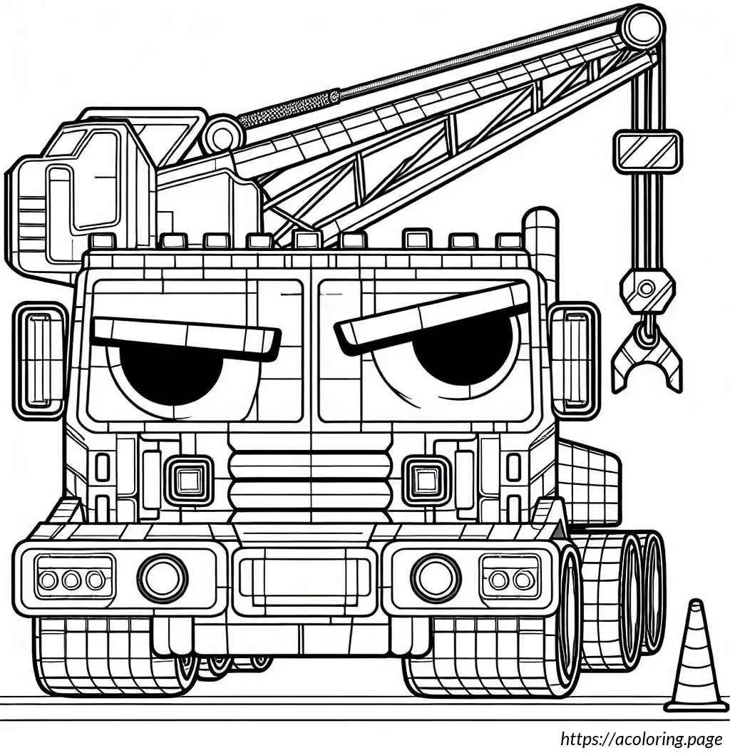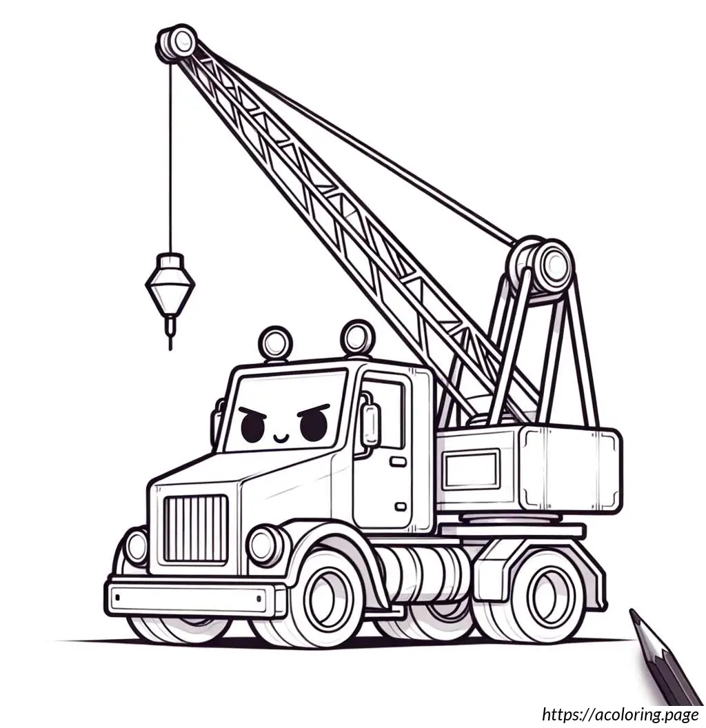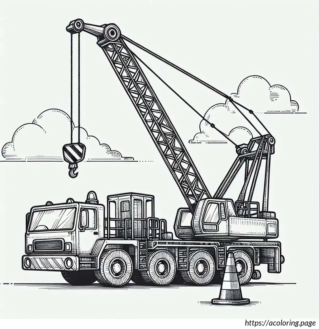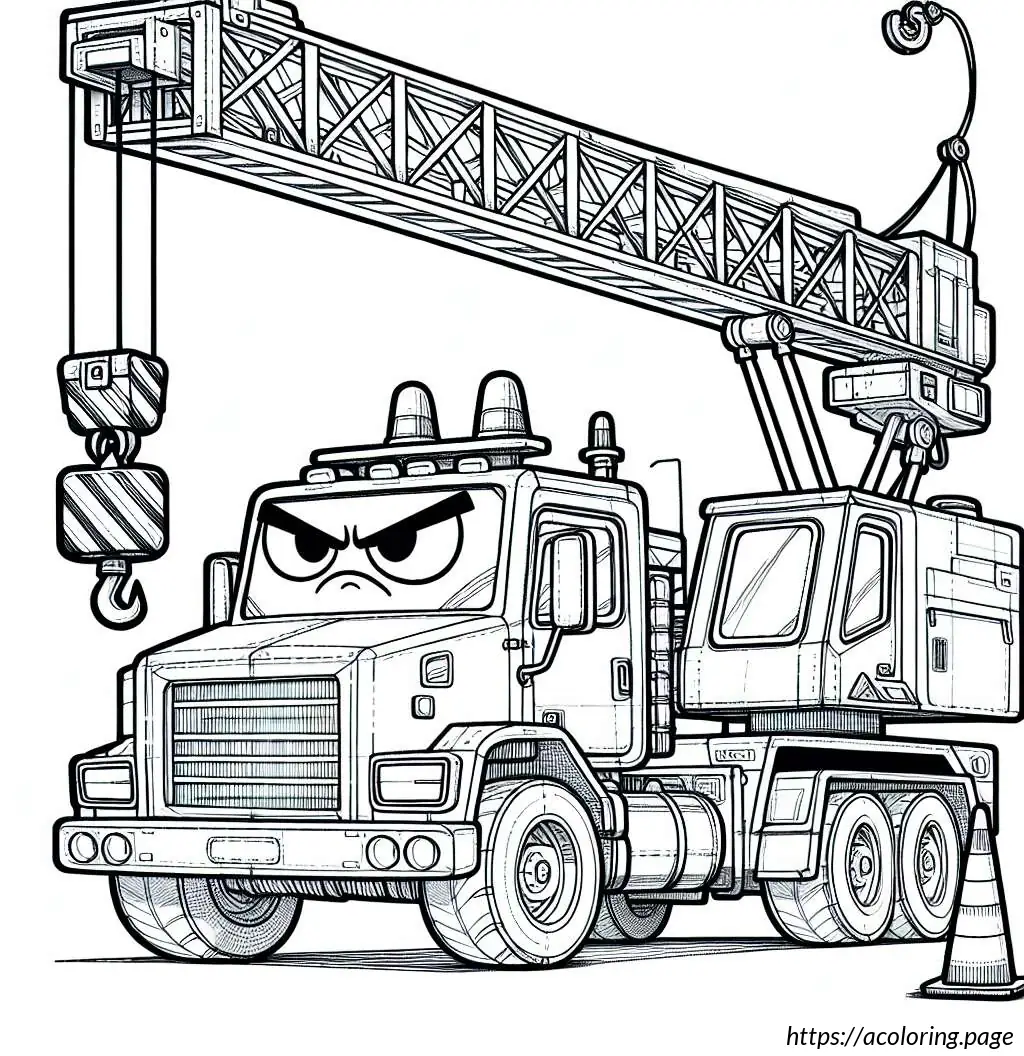 This image features a cartoon-style drawing of a truck-mounted crane. The crane has an anthropomorphic, somewhat angry or grumpy expression, with eyes and a mouth on the front of the cab, which makes it appear as if the truck itself is a character. The crane is equipped with a large telescoping boom which extends diagonally upward to the right, ending with a hook dangling from its cable. To the left of the vehicle, there is a single traffic cone, drawn in a simple style. The background is blank, emphasizing the crane and the cone in the foreground. The whole drawing uses bold black outlines and lacks color, resembling a coloring book page or a simple illustrative graphic.