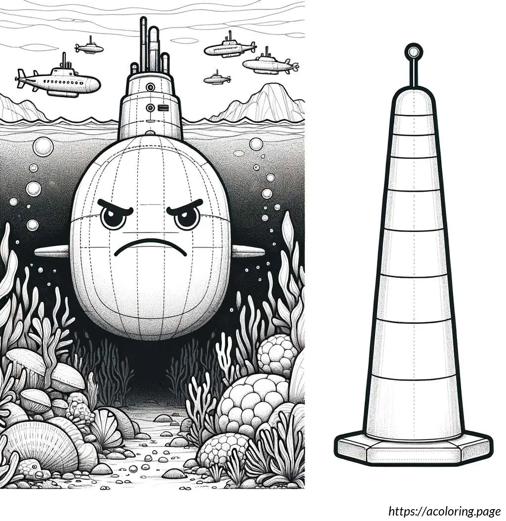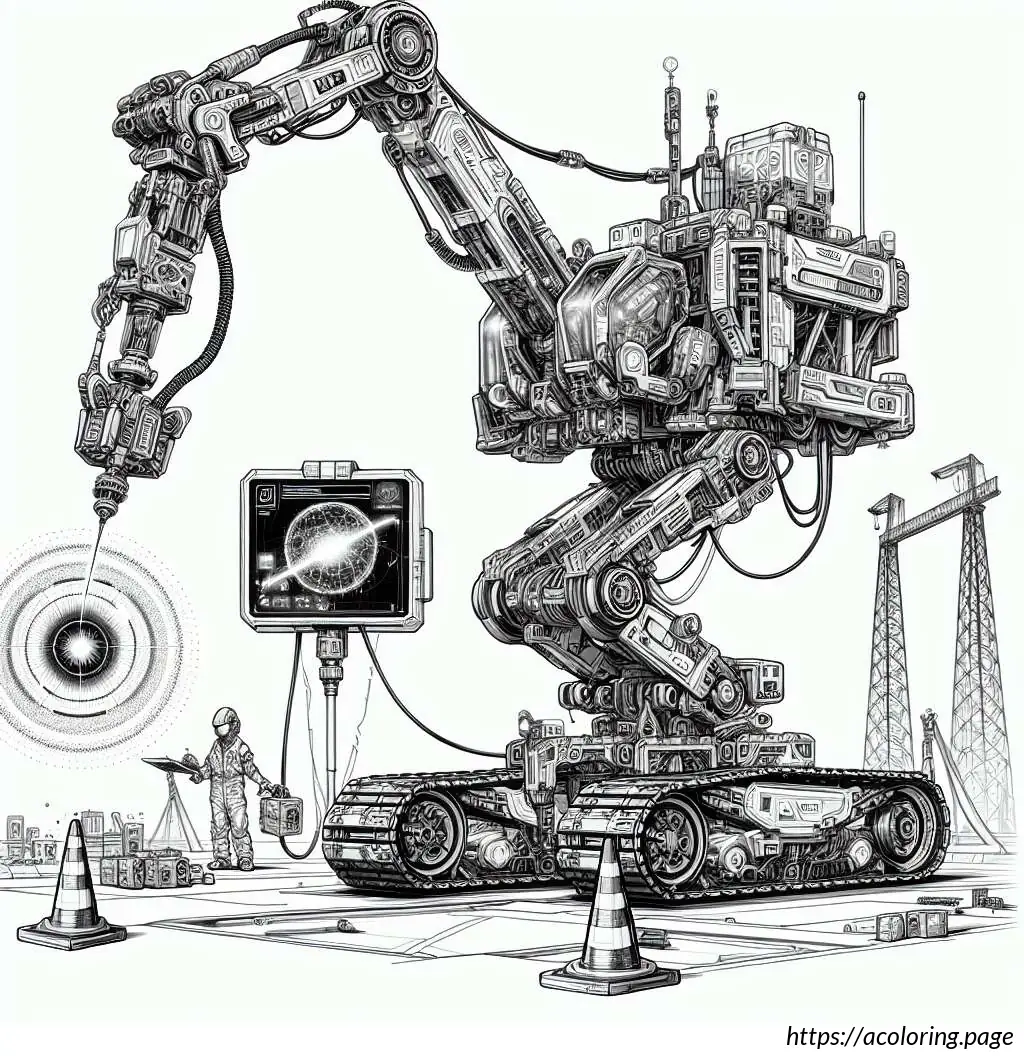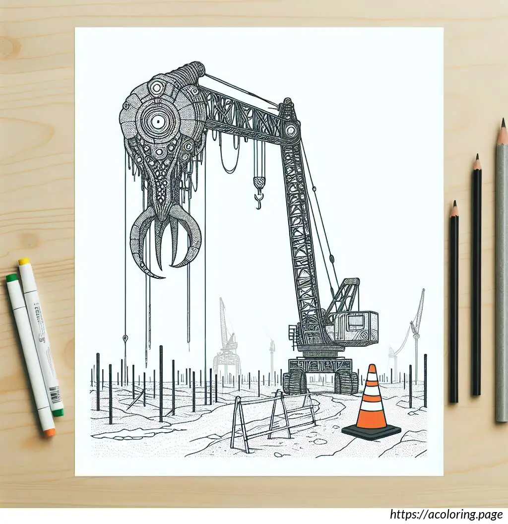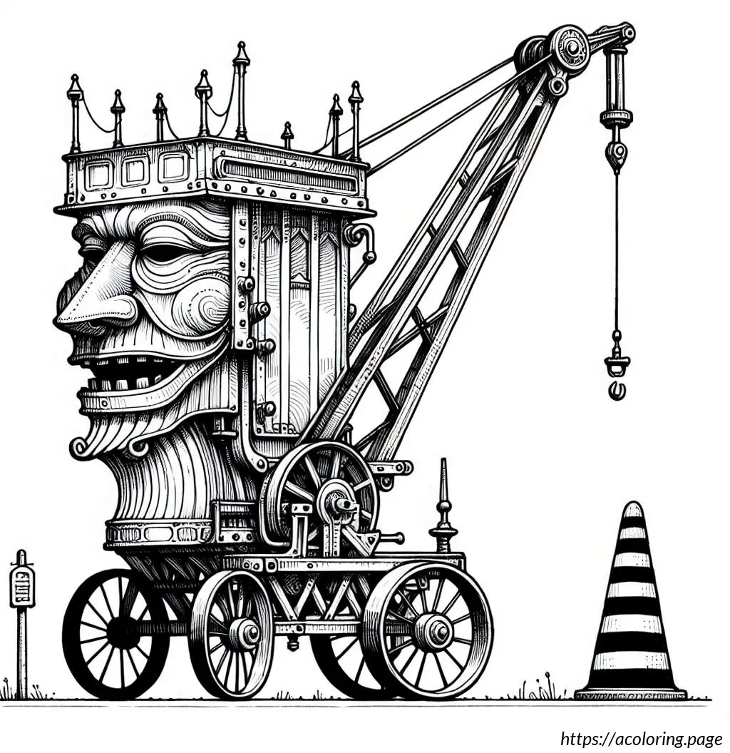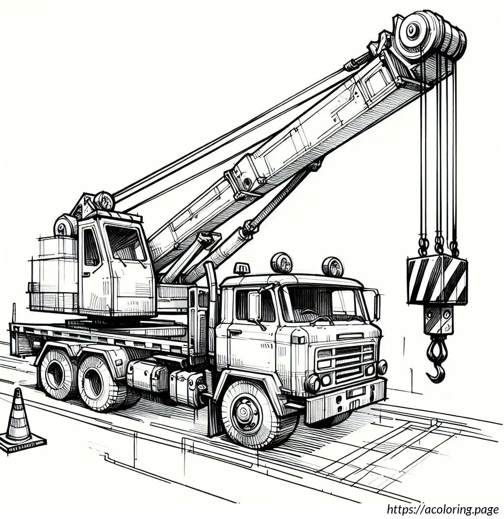 This image features a cartoon-style drawing of a truck-mounted crane. The crane has an anthropomorphic, somewhat angry or grumpy expression, with eyes and a mouth on the front of the cab, which makes it appear as if the truck itself is a character. The crane is equipped with a large telescoping boom which extends diagonally upward to the right, ending with a hook dangling from its cable. To the left of the vehicle, there is a single traffic cone, drawn in a simple style. The background is blank, emphasizing the crane and the cone in the foreground. The whole drawing uses bold black outlines and lacks color, resembling a coloring book page or a simple illustrative graphic.