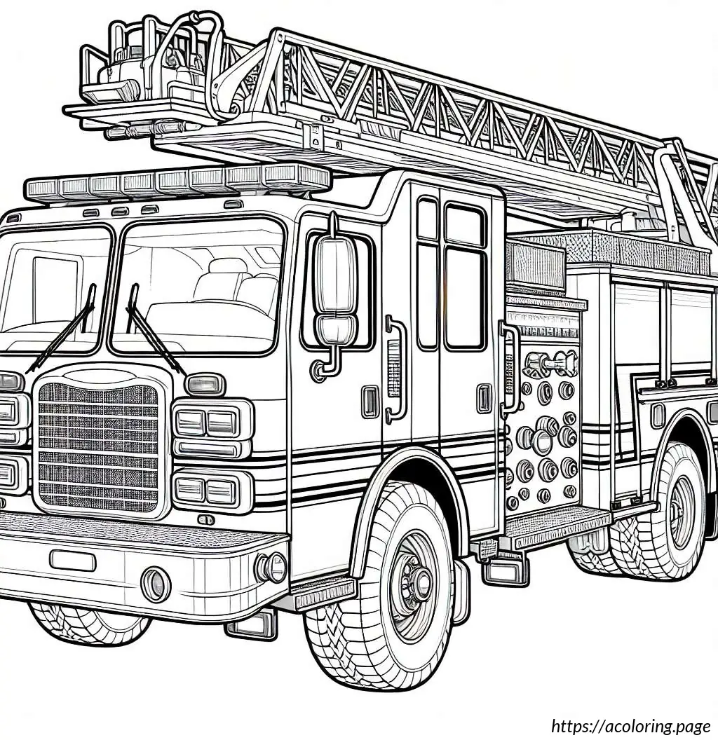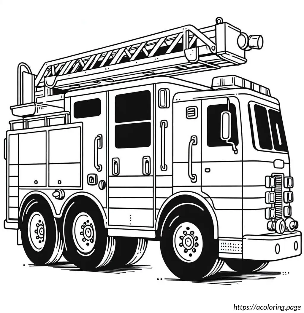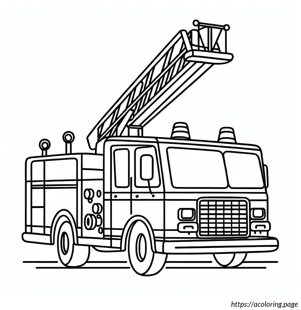 This image is a simple line drawing of a fire truck. The illustration shows the vehicle in a side view, prominently featuring its distinctive components designed for firefighting. Highlights include- A large, prominent front grill and rounded hood, representative of traditional fire truck designs.- Rounded fenders over the front and rear wheels.- The cabin area with visible windows and what appears to be a door handle.- On top of the truck is an extended ladder with triangular patterns on its sides, indicating the sections of the ladder.- Additional firefighting equipment can be seen on the side of the truck, such as an ax.- The truck has rounded, bulky tires that signify its capability to handle different terrains.The simplicity of the design, with clear, bold lines without any shading or color, suggests that this might be intended for coloring activities or educational purposes for children.