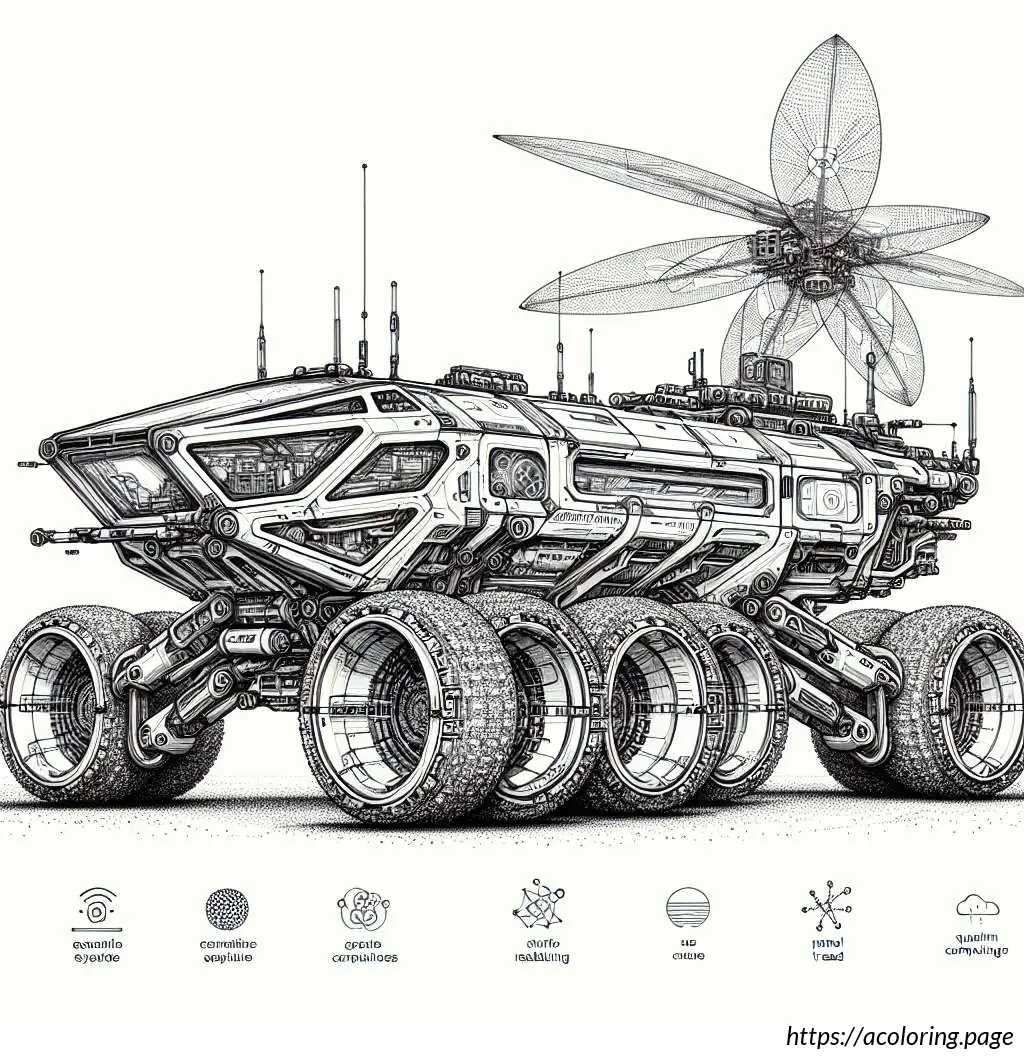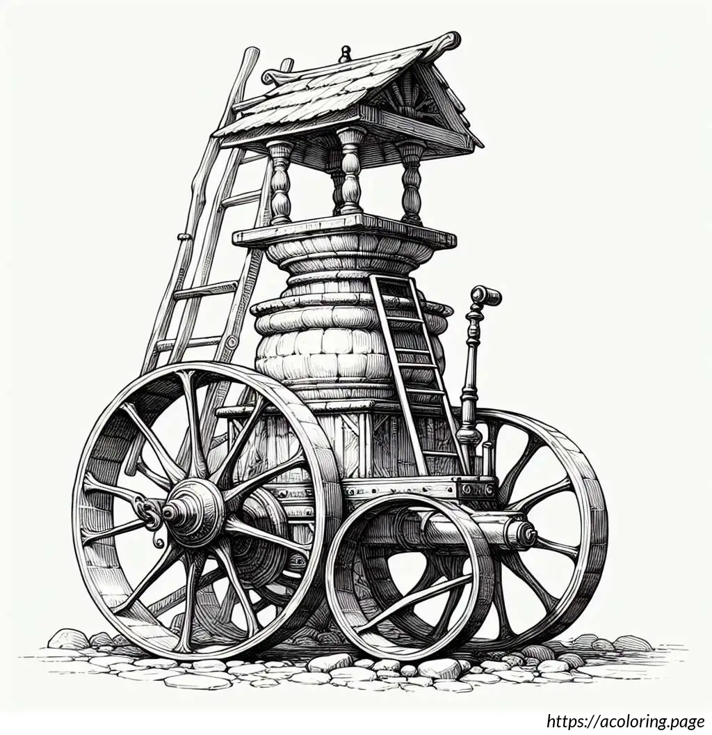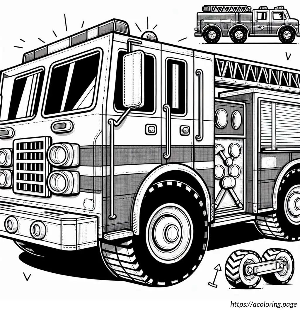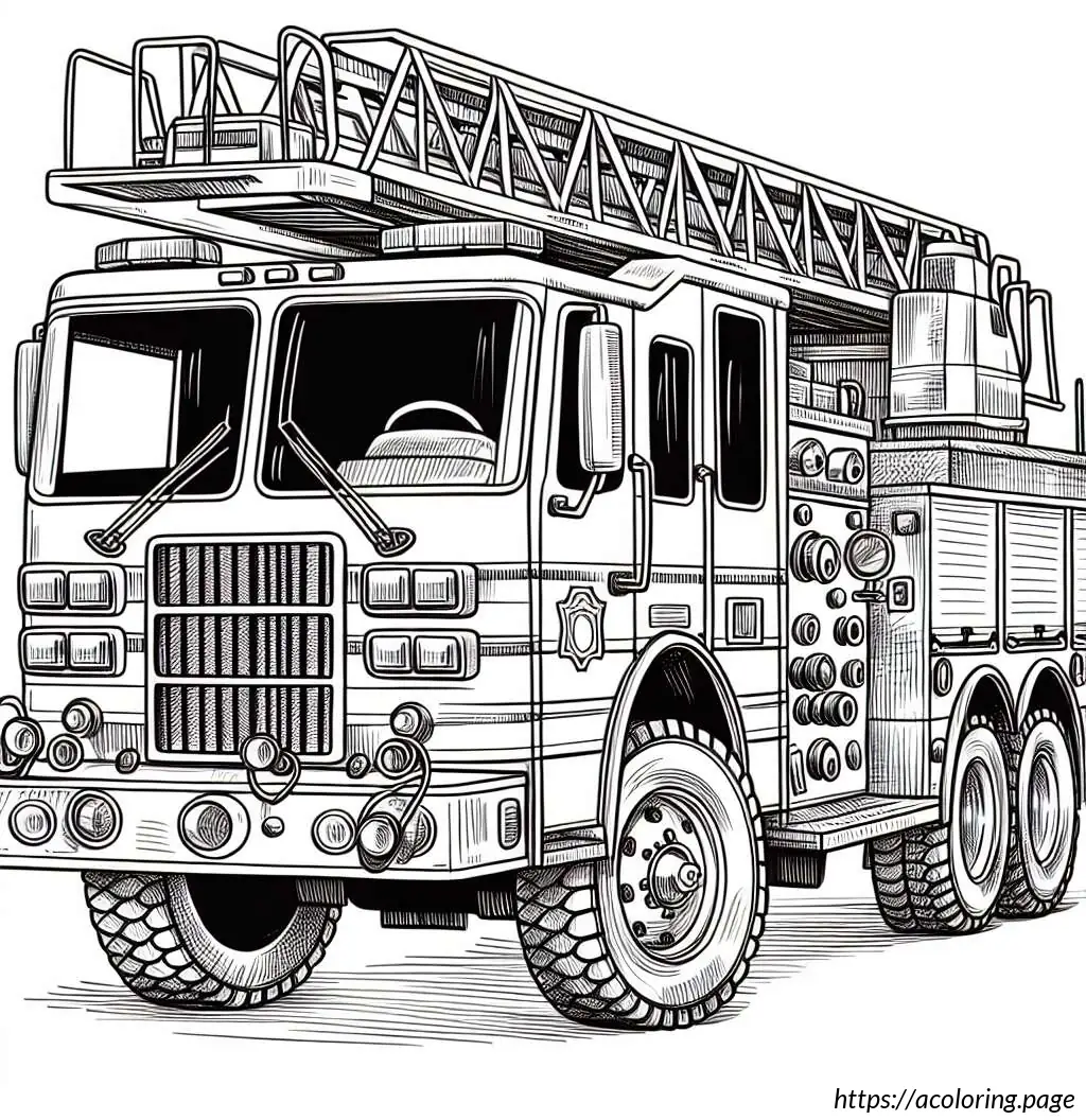 This image is a simple line drawing of a fire truck. The illustration shows the vehicle in a side view, prominently featuring its distinctive components designed for firefighting. Highlights include- A large, prominent front grill and rounded hood, representative of traditional fire truck designs.- Rounded fenders over the front and rear wheels.- The cabin area with visible windows and what appears to be a door handle.- On top of the truck is an extended ladder with triangular patterns on its sides, indicating the sections of the ladder.- Additional firefighting equipment can be seen on the side of the truck, such as an ax.- The truck has rounded, bulky tires that signify its capability to handle different terrains.The simplicity of the design, with clear, bold lines without any shading or color, suggests that this might be intended for coloring activities or educational purposes for children.