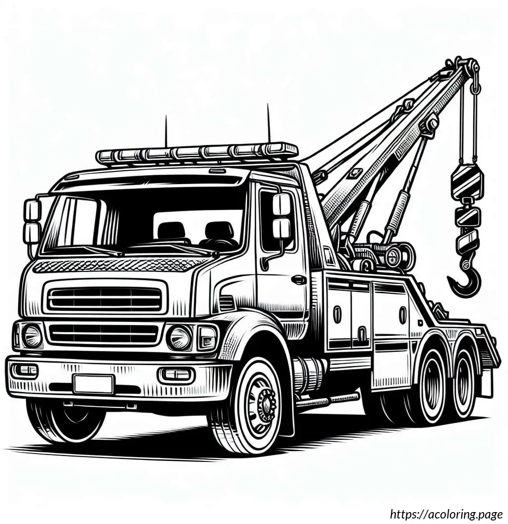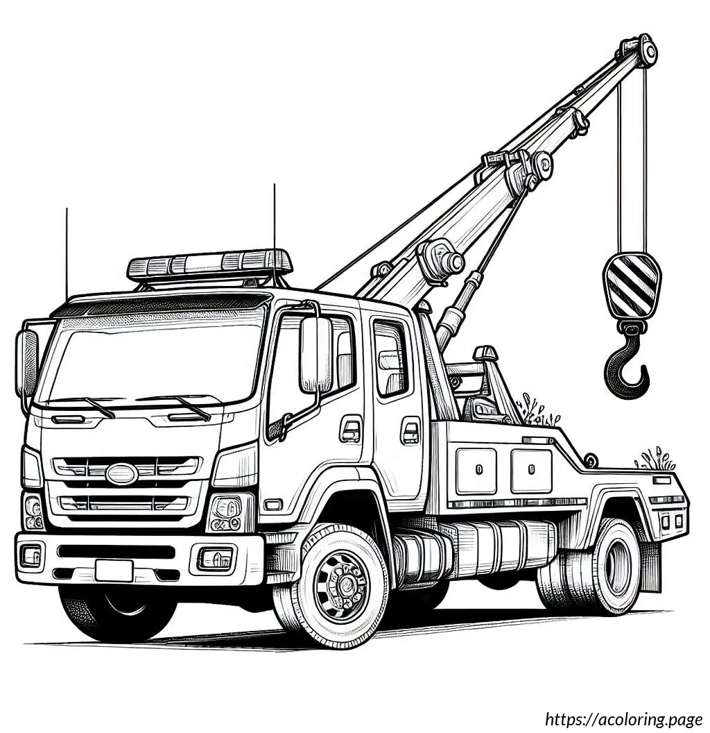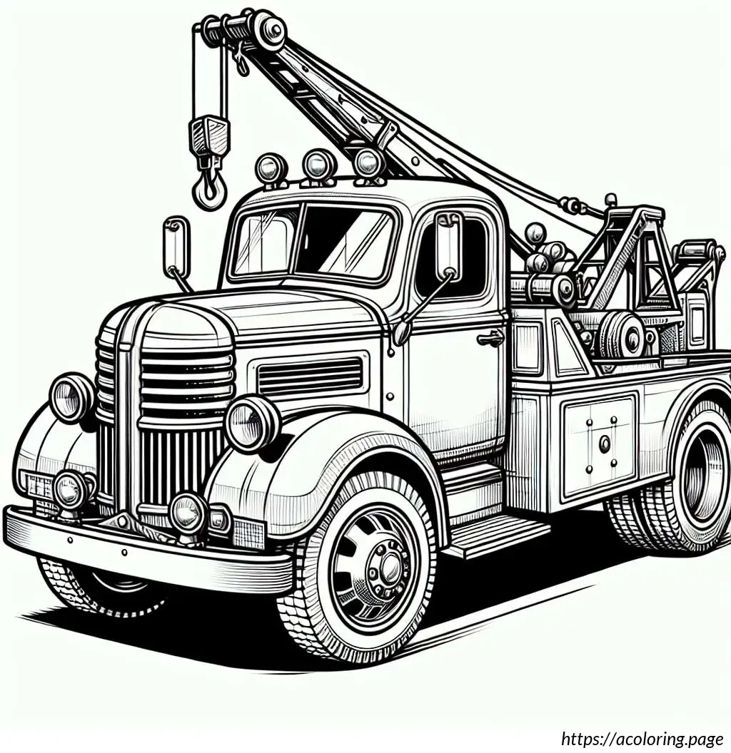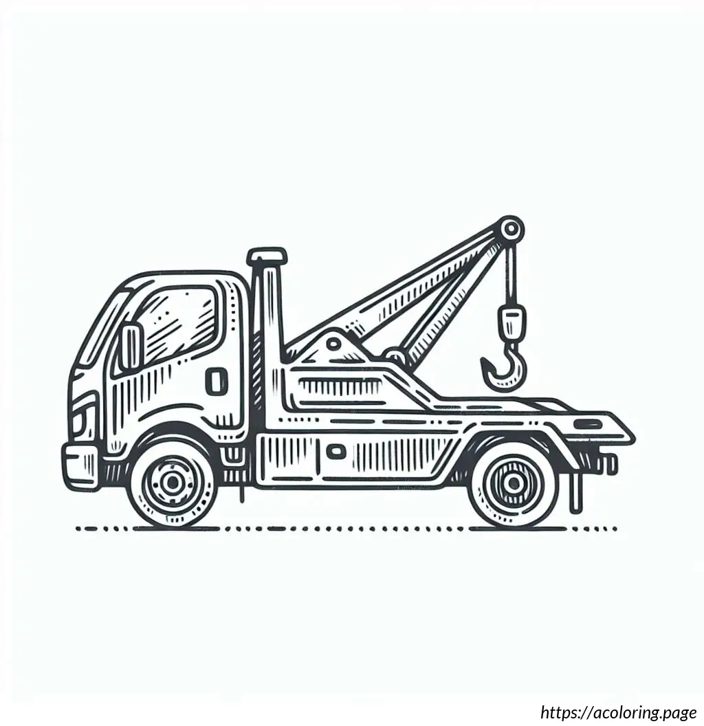 The image depicts a simple line drawing of a tow truck. The truck has a classic, somewhat rounded body style with a prominent front grille and round headlights. The cab of the truck has a single door visible and a window, and there”s a side mirror attached to the cab. The bed of the truck is relatively flat and long, housing a large, articulated crane-like mechanism at the back. This mechanism includes a boom with triangular supports and a hook at the end of a line, suggesting its function for towing. The vehicle has two visible wheels with basic rims. Overall, the image has a cartoonish, simple style, likely designed for easy coloring or educational purposes.