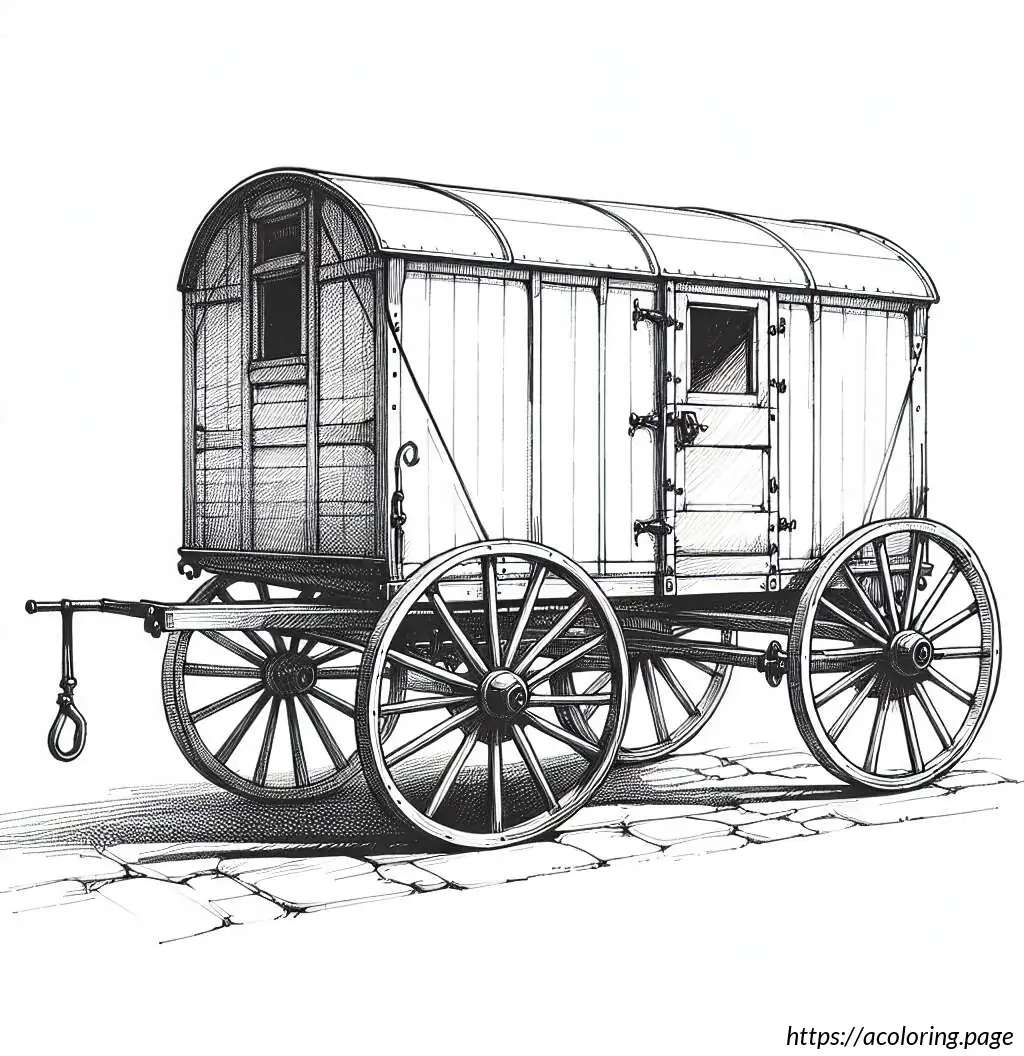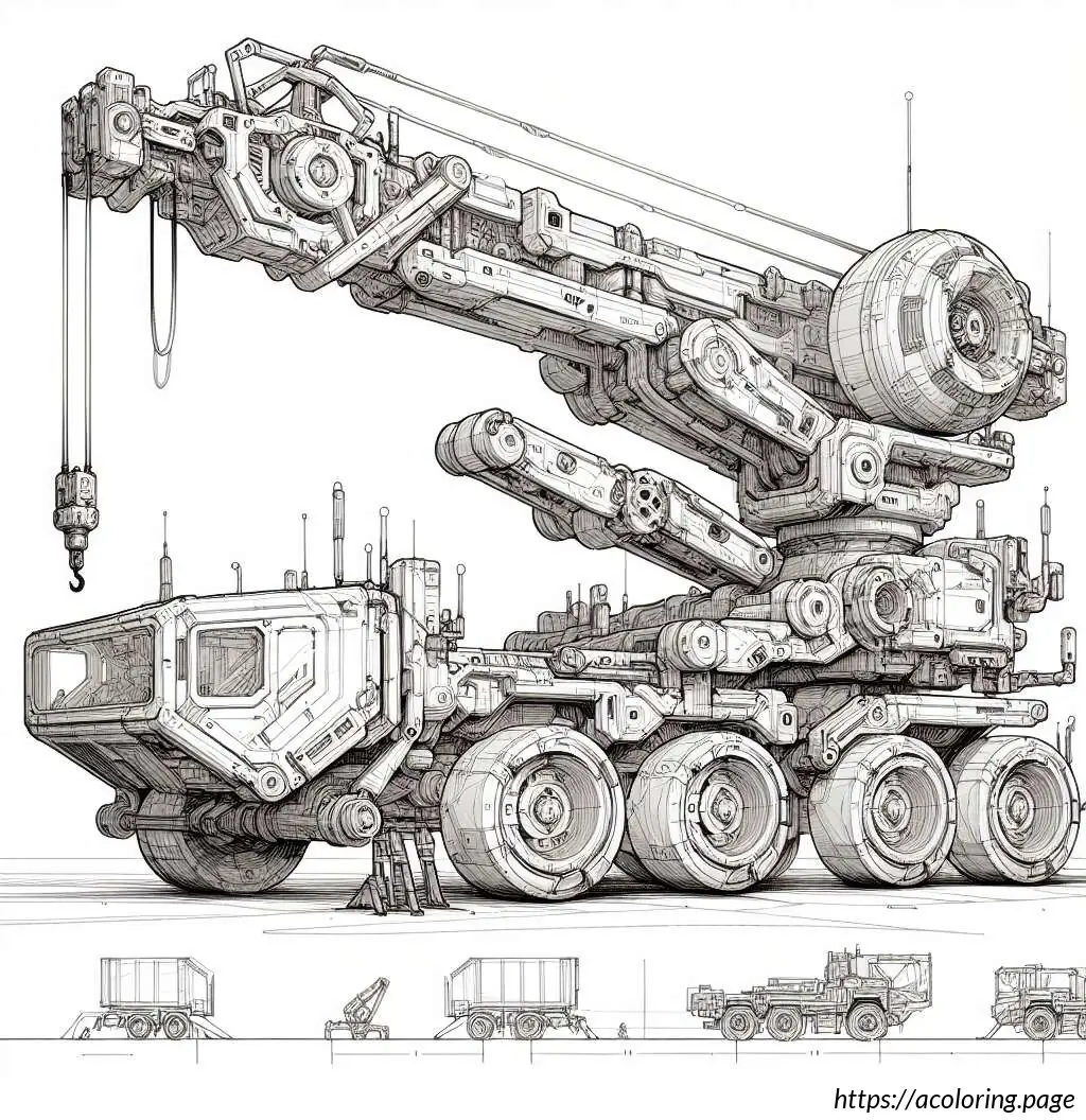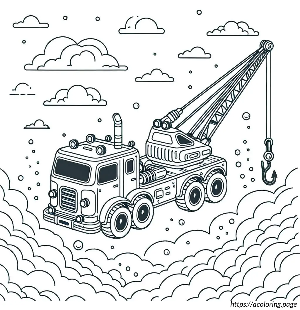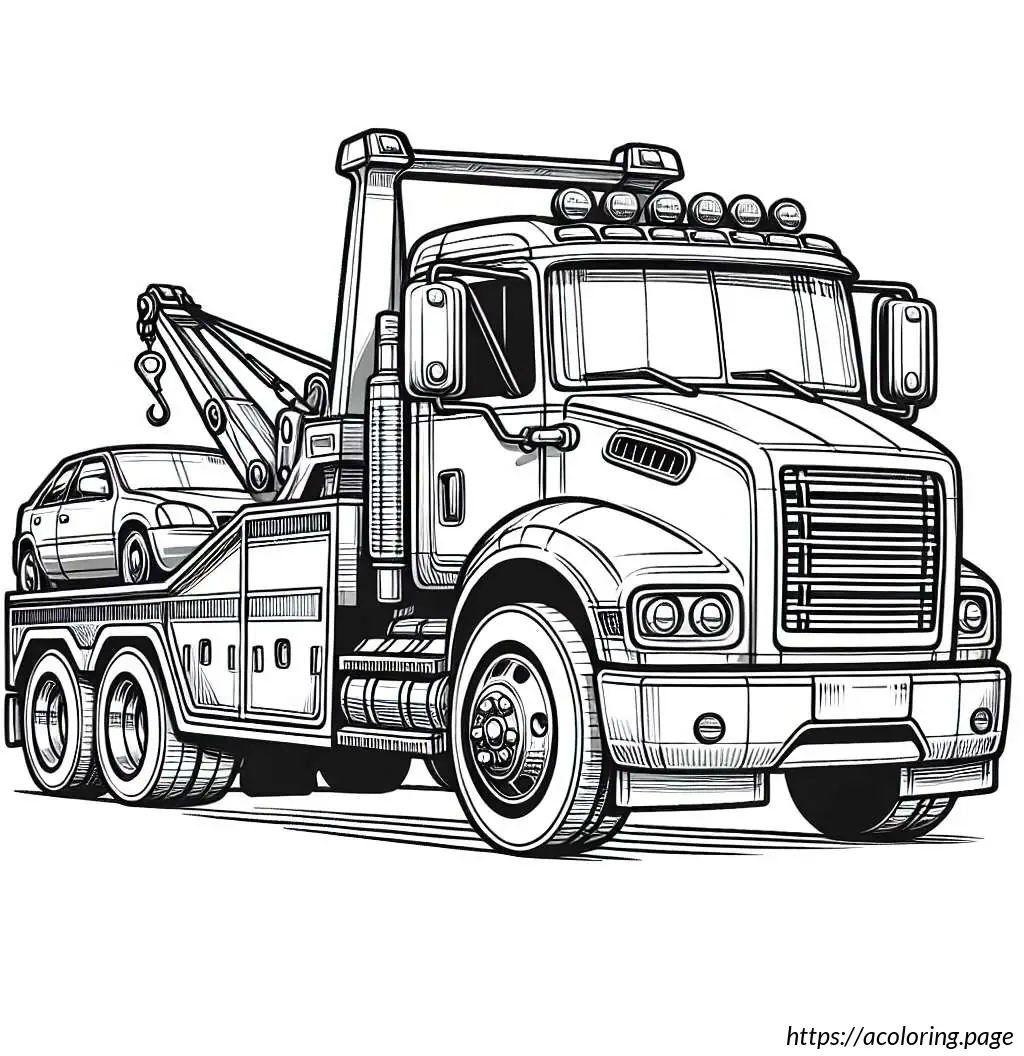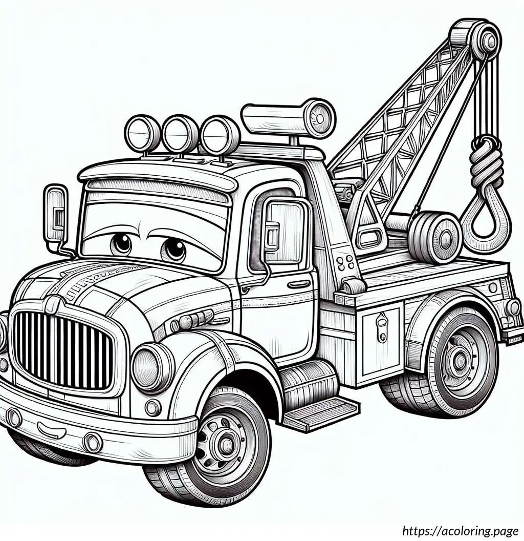 The image depicts a simple line drawing of a tow truck. The truck has a classic, somewhat rounded body style with a prominent front grille and round headlights. The cab of the truck has a single door visible and a window, and there”s a side mirror attached to the cab. The bed of the truck is relatively flat and long, housing a large, articulated crane-like mechanism at the back. This mechanism includes a boom with triangular supports and a hook at the end of a line, suggesting its function for towing. The vehicle has two visible wheels with basic rims. Overall, the image has a cartoonish, simple style, likely designed for easy coloring or educational purposes.