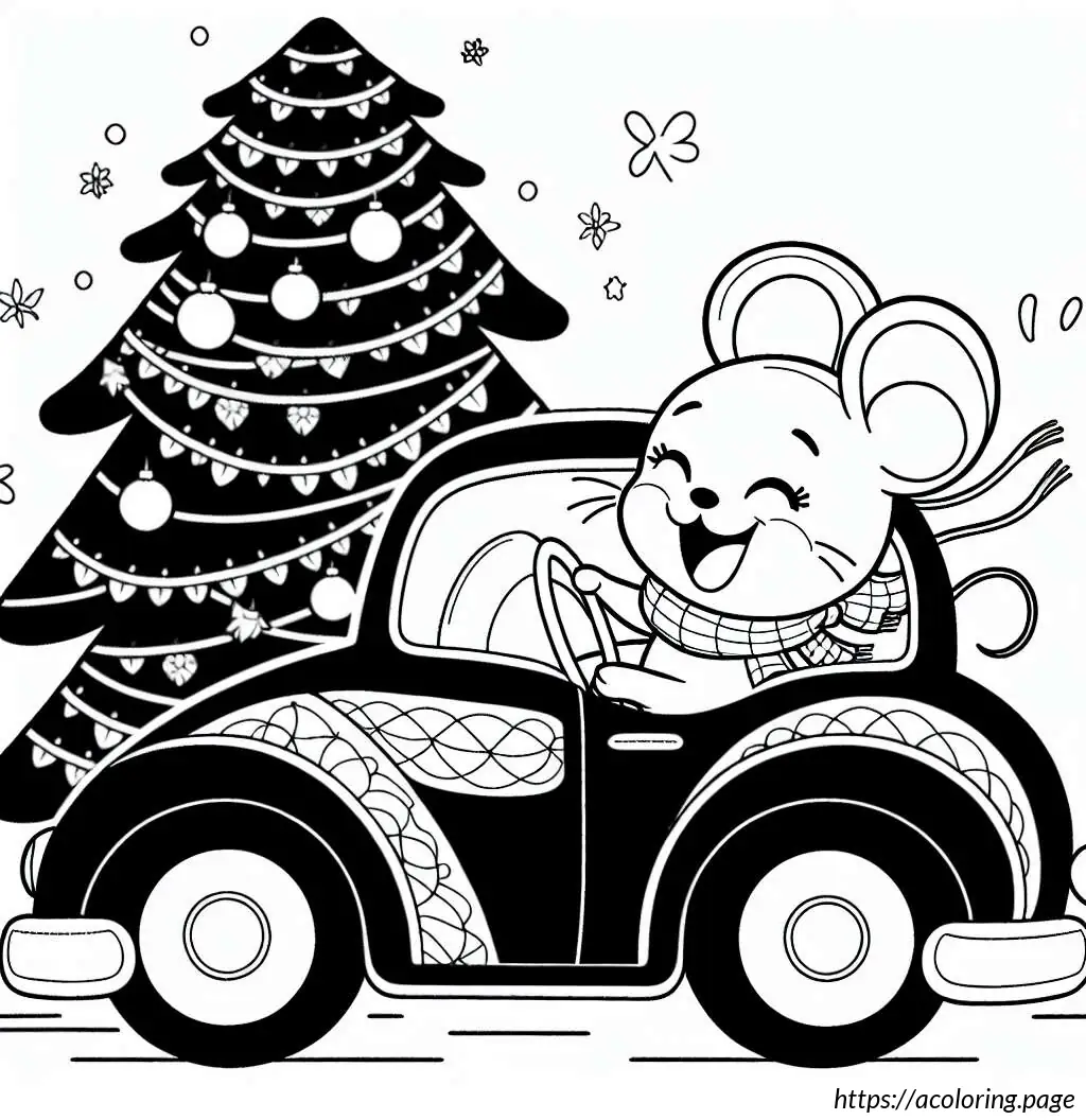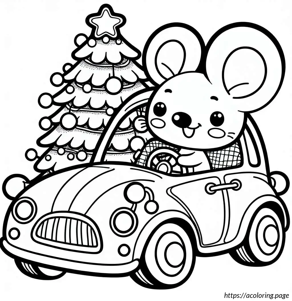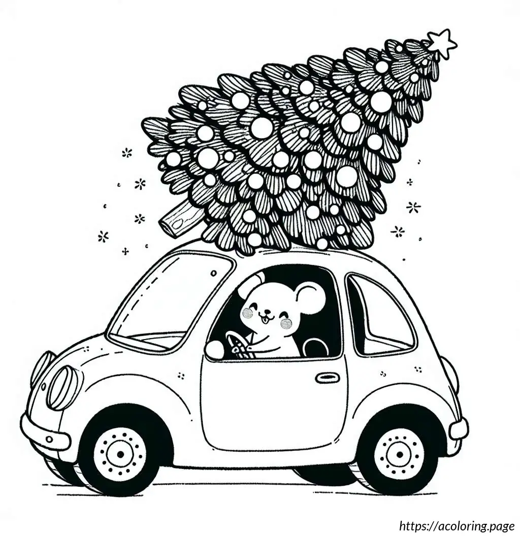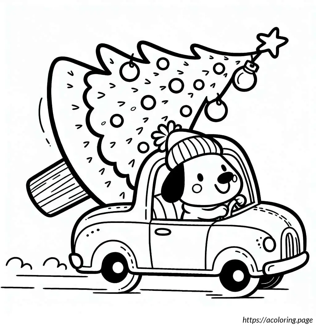 This image provides a charming and simple line drawing suitable for coloring activities. It depicts a cartoon-style car with a smiling creature, which resembles a dog, driving it. In the car”s rear seat, a large Christmas tree is lodged, sticking out from the top, and decorated with spots that resemble ornaments. The representation is basic and playful, capturing a moment of holiday cheer as the character brings home a Christmas tree. The overall style is whimsical and well-suited for children”s coloring books or holiday-themed activities.