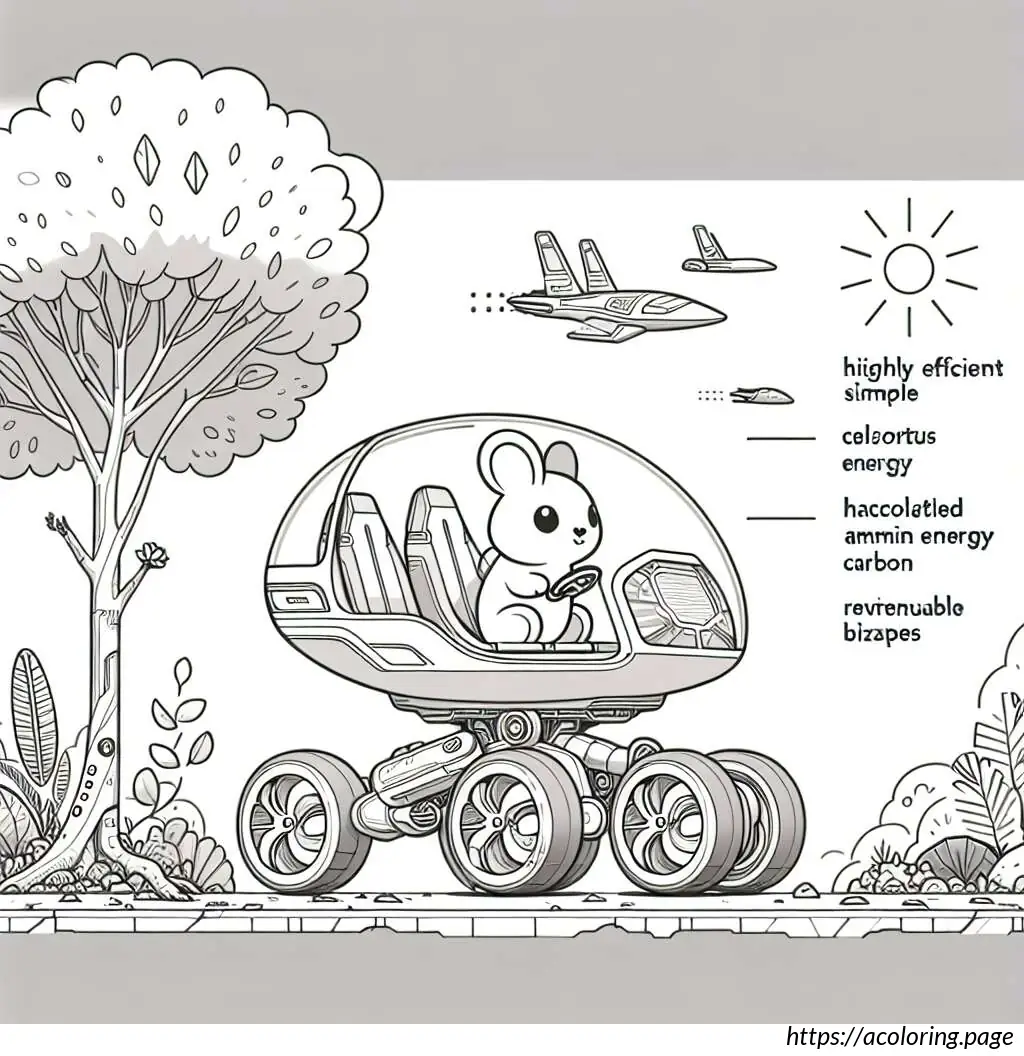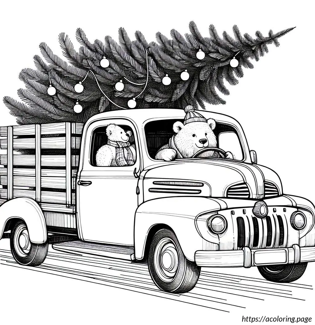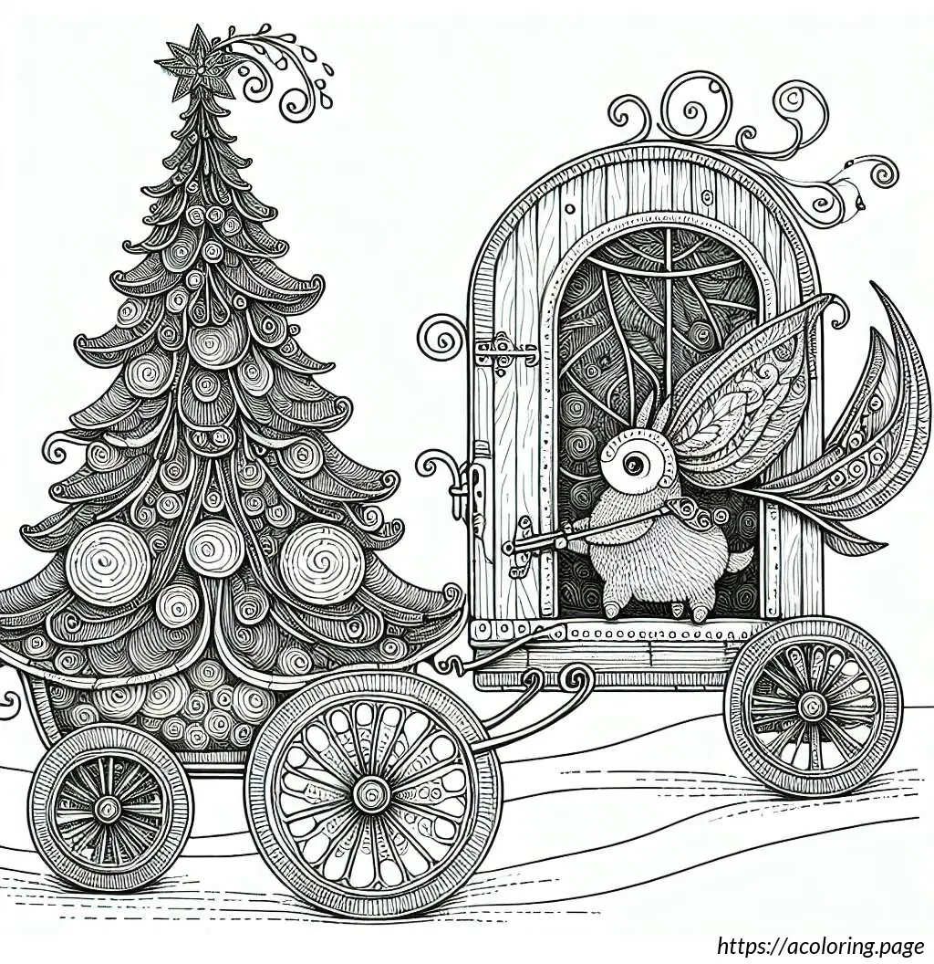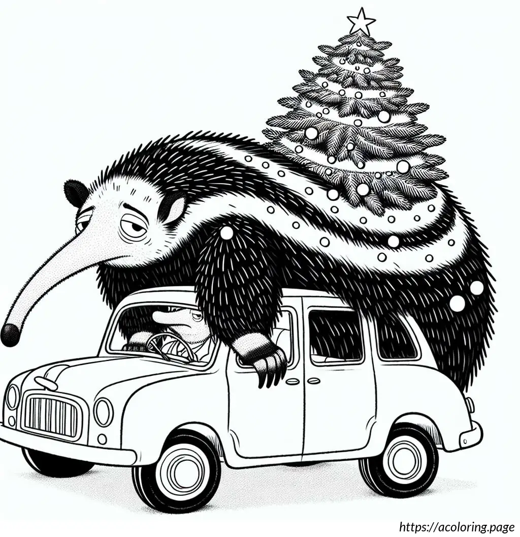This image provides a charming and simple line drawing suitable for coloring activities. It depicts a cartoon-style car with a smiling creature, which resembles a dog, driving it. In the car”s rear seat, a large Christmas tree is lodged, sticking out from the top, and decorated with spots that resemble ornaments. The representation is basic and playful, capturing a moment of holiday cheer as the character brings home a Christmas tree. The overall style is whimsical and well-suited for children”s coloring books or holiday-themed activities.