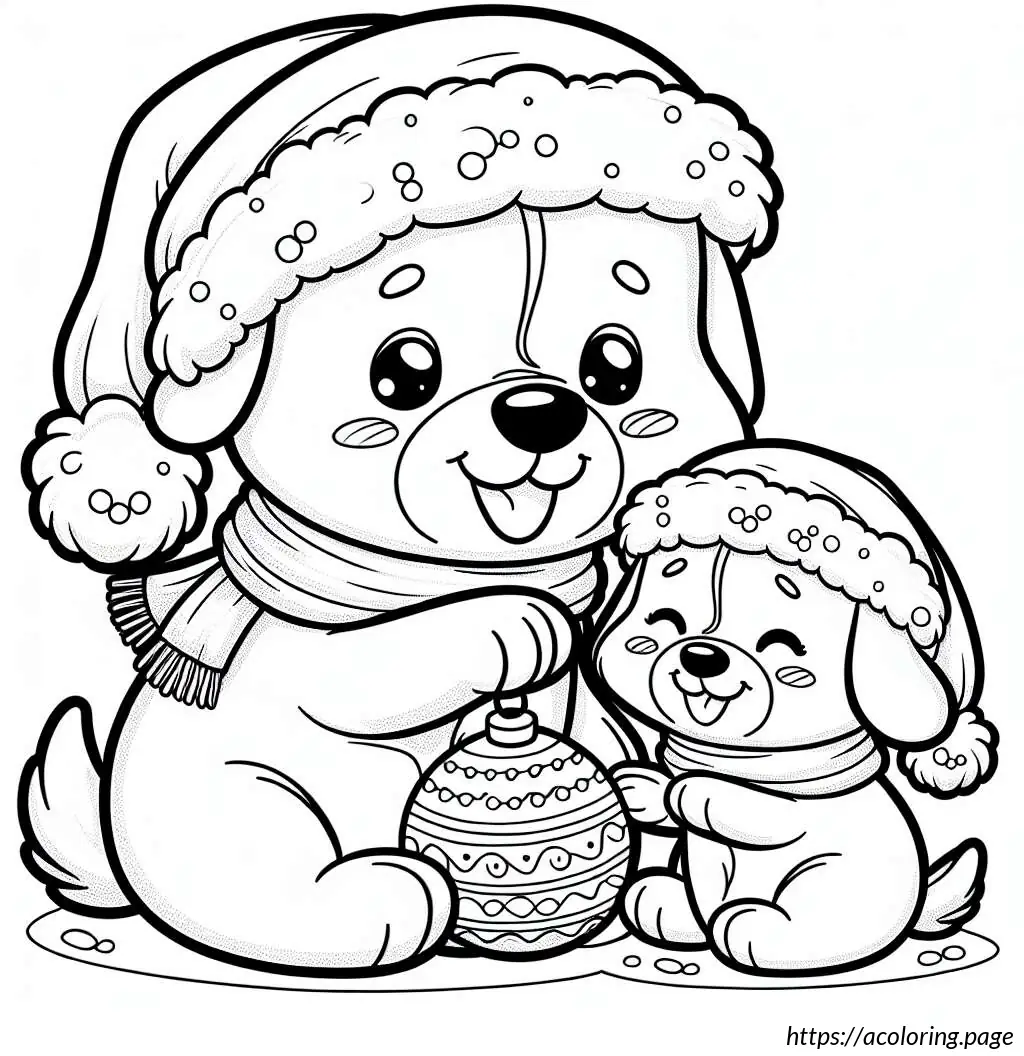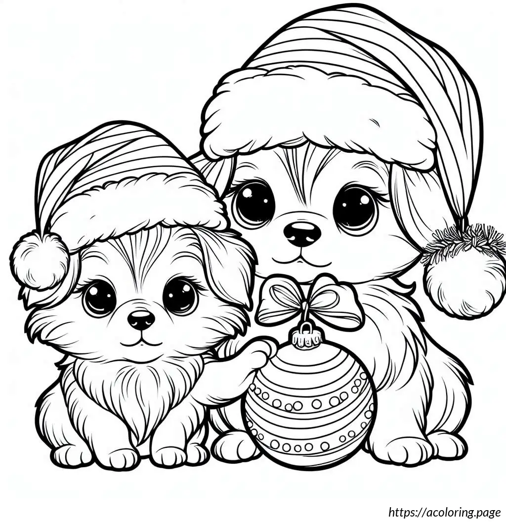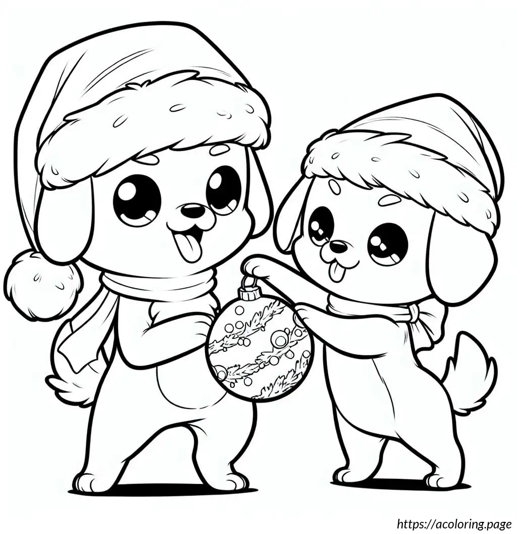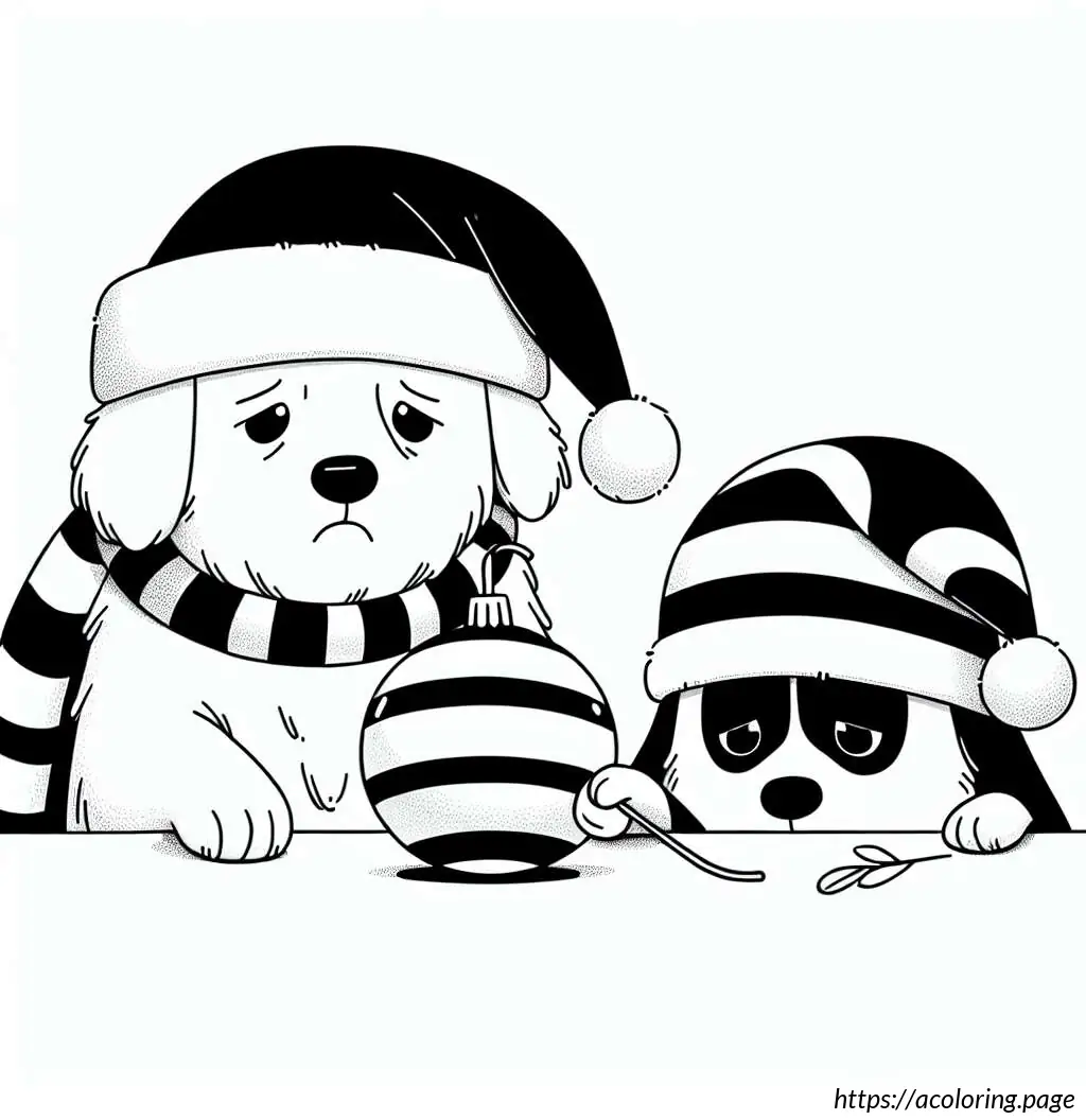 The image features a black and white line drawing of two cartoon-style dogs wearing Christmas hats. The larger dog on the left is holding a round, striped Christmas ornament, which is hanging by its hook from the dog’s hand. Both dogs have dots for noses and simple, round eyes with pupils looking directly at the viewer. The hats are typical Santa-style with a fluffy rim and a pompom at the end. The facial expressions on the dogs are cheerful. The smaller dog on the right has its arm around the larger dog, creating a friendly and affectionate scene. This image appears to be designed for coloring, given its clear, simple lines and lack of color.