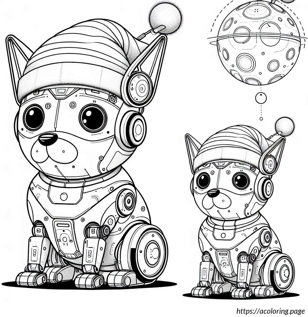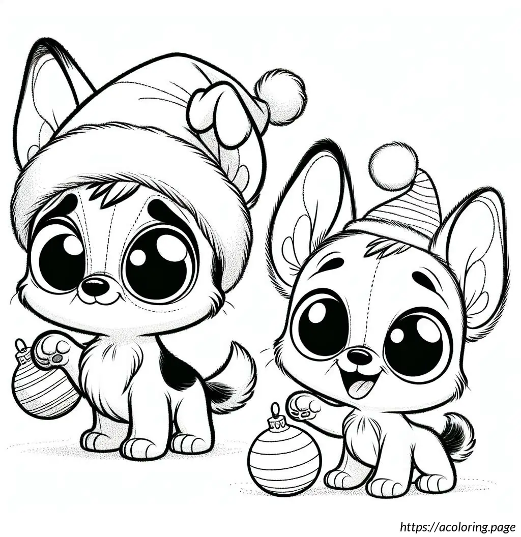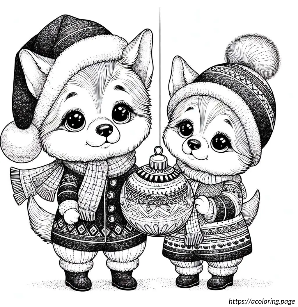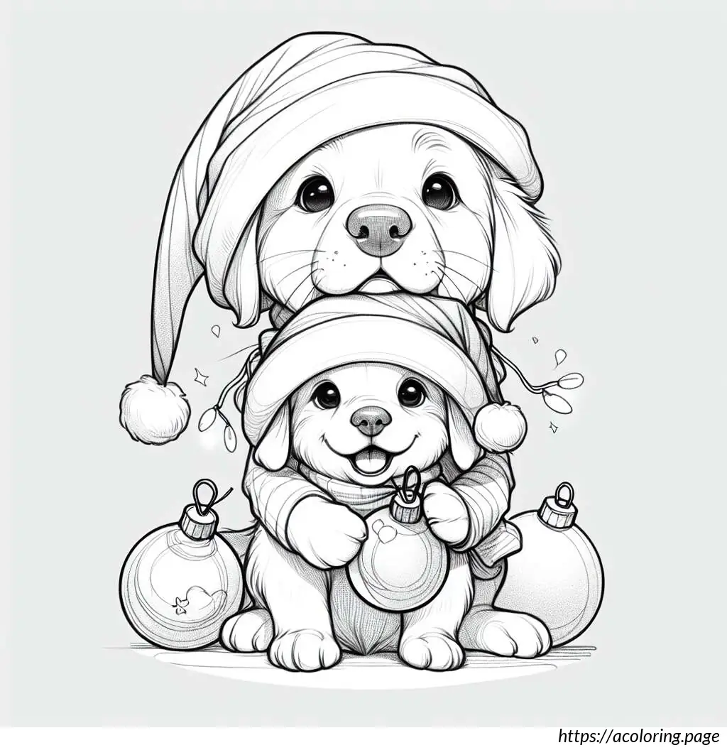 The image features a black and white line drawing of two cartoon-style dogs wearing Christmas hats. The larger dog on the left is holding a round, striped Christmas ornament, which is hanging by its hook from the dog’s hand. Both dogs have dots for noses and simple, round eyes with pupils looking directly at the viewer. The hats are typical Santa-style with a fluffy rim and a pompom at the end. The facial expressions on the dogs are cheerful. The smaller dog on the right has its arm around the larger dog, creating a friendly and affectionate scene. This image appears to be designed for coloring, given its clear, simple lines and lack of color.