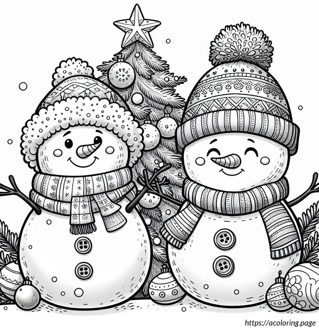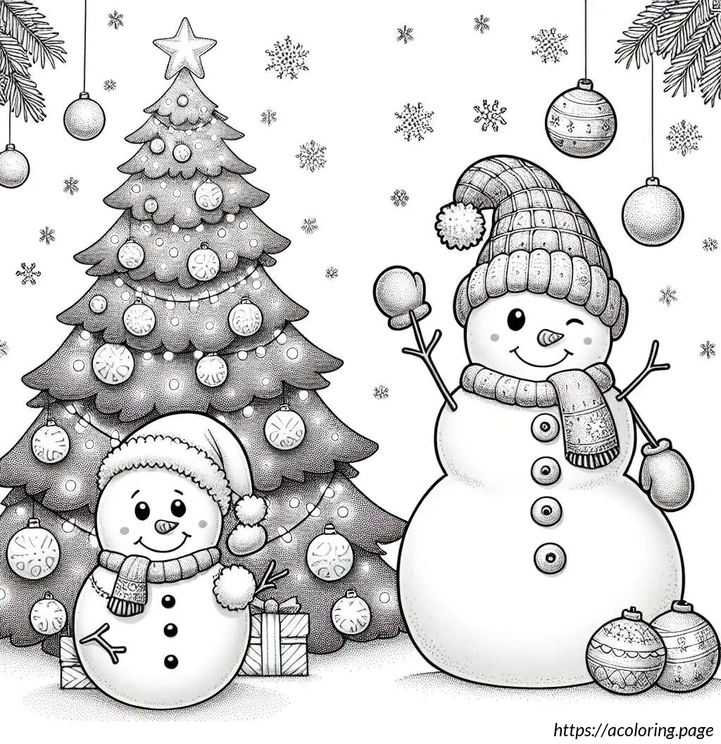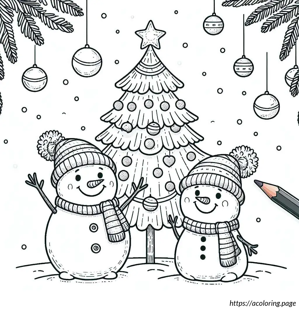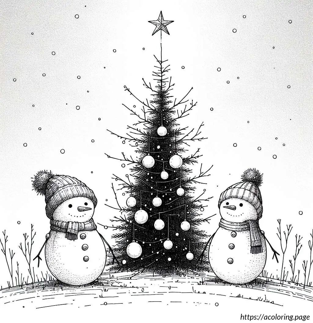 This image features a simple, black and white line drawing suitable for coloring activities. It depicts a festive scene with two snowmen in front of a large, decorated Christmas tree. The Christmas tree, positioned in the background, is adorned with circular ornaments and a star on top. Its branches are styled in a typical, drooping manner associated with conifers.The two snowmen in the foreground display cheerful expressions and are dressed in winter hats. The snowman on the left wears a Santa Claus hat, has a large round nose, and a scarf around its neck. The one on the right wears a winter cap with a pom-pom and also features a scarf. Both snowmen exhibit round bodies with three buttons each and are slightly waving.Overall, the drawing conveys a joyful and cozy winter holiday atmosphere, making it appealing for festive decoration or activities like coloring for both children and adults.