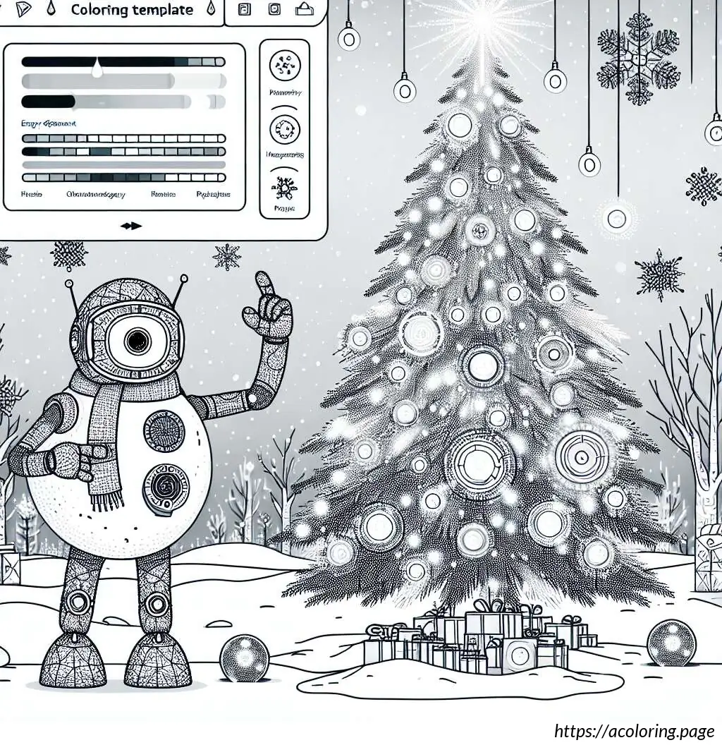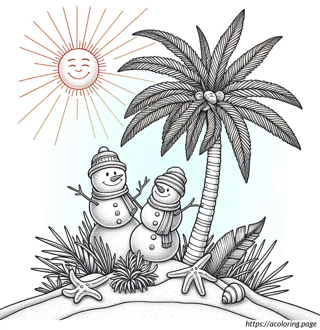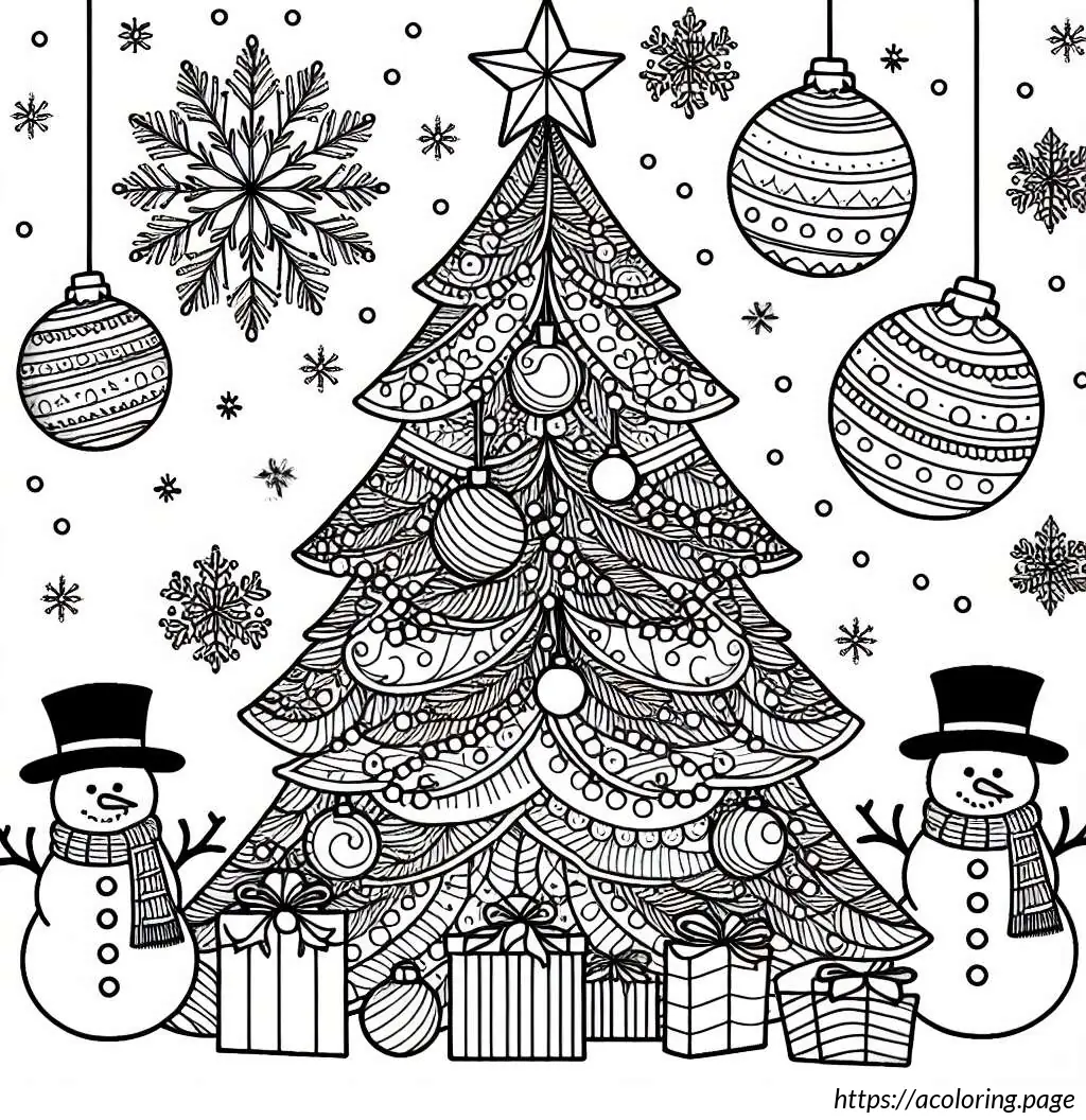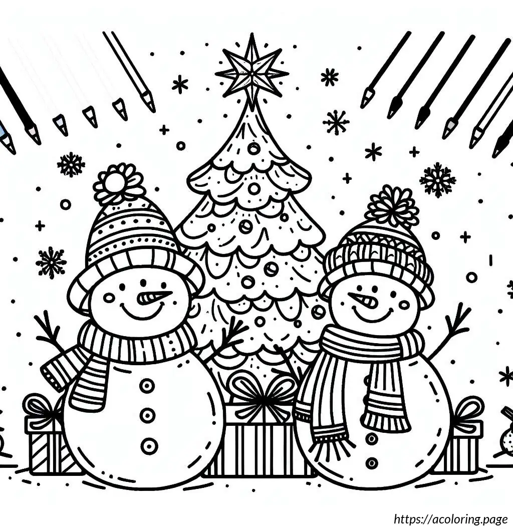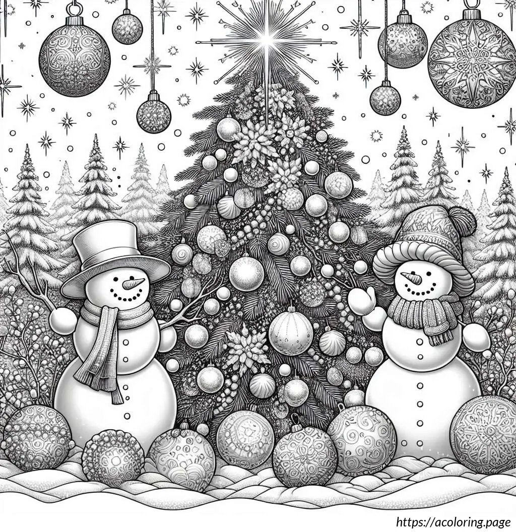 This image features a simple, black and white line drawing suitable for coloring activities. It depicts a festive scene with two snowmen in front of a large, decorated Christmas tree. The Christmas tree, positioned in the background, is adorned with circular ornaments and a star on top. Its branches are styled in a typical, drooping manner associated with conifers.The two snowmen in the foreground display cheerful expressions and are dressed in winter hats. The snowman on the left wears a Santa Claus hat, has a large round nose, and a scarf around its neck. The one on the right wears a winter cap with a pom-pom and also features a scarf. Both snowmen exhibit round bodies with three buttons each and are slightly waving.Overall, the drawing conveys a joyful and cozy winter holiday atmosphere, making it appealing for festive decoration or activities like coloring for both children and adults.