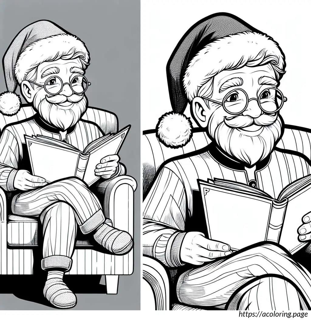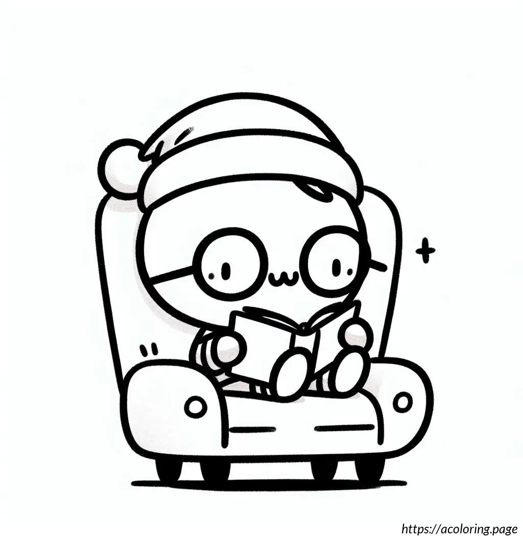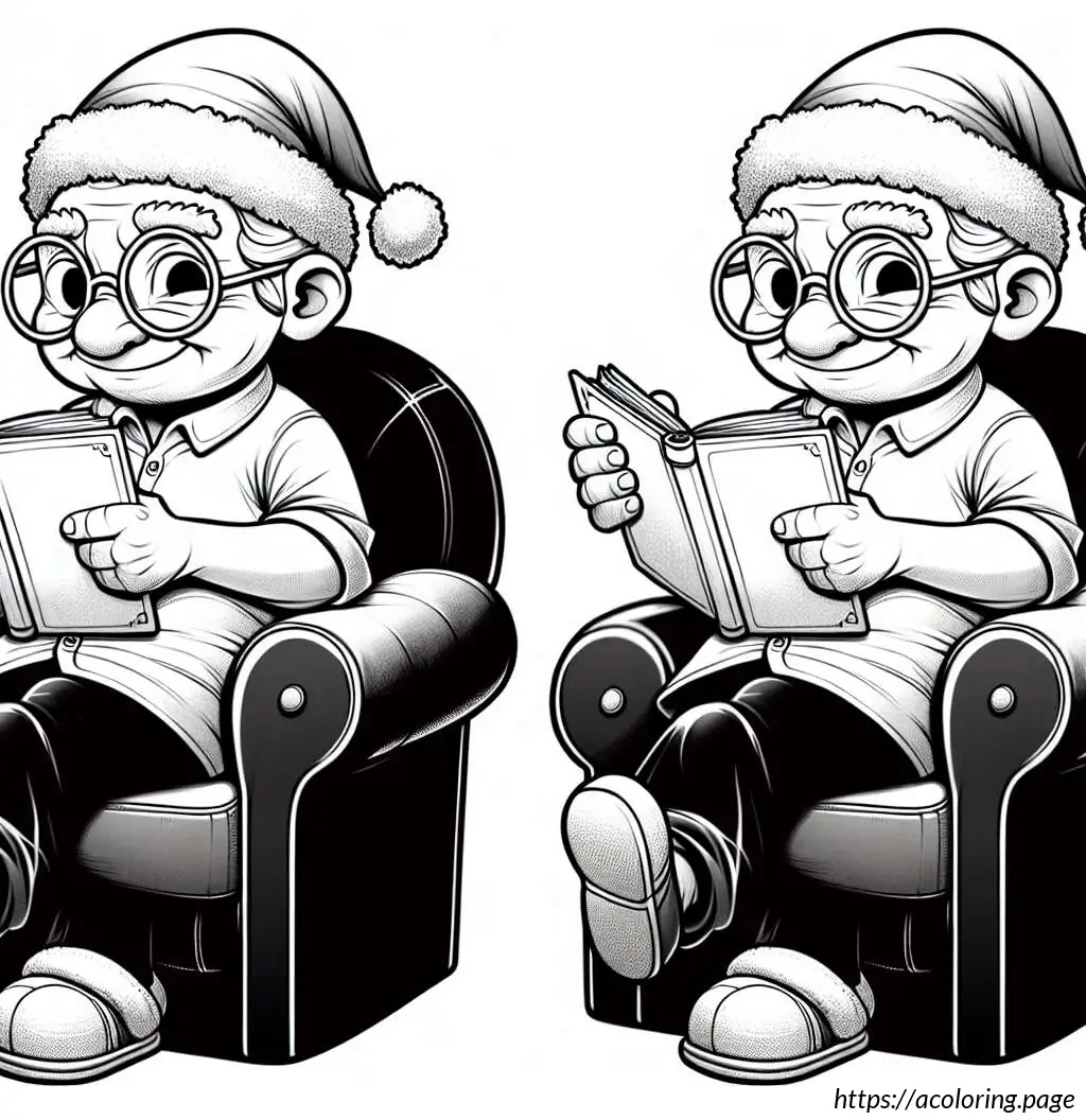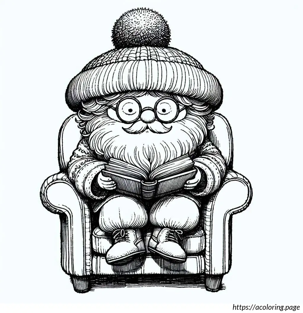 This image is a black and white line drawing of a cute, cartoon style elderly man sitting comfortably in an armchair. He is wearing round glasses, and his facial expression is cheerful with a gentle smile. He has a round face, a small tuft of hair under his chin, and is wearing a Santa hat, indicating a holiday theme. The character is reading a book, holding it open with both hands. His attire includes a simple long-sleeve shirt and pants, and he is wearing slippers. The overall appearance gives an impression of a cozy, content individual, likely enjoying a quiet moment. This type of image could be appealing to children and is suitable for coloring activities.