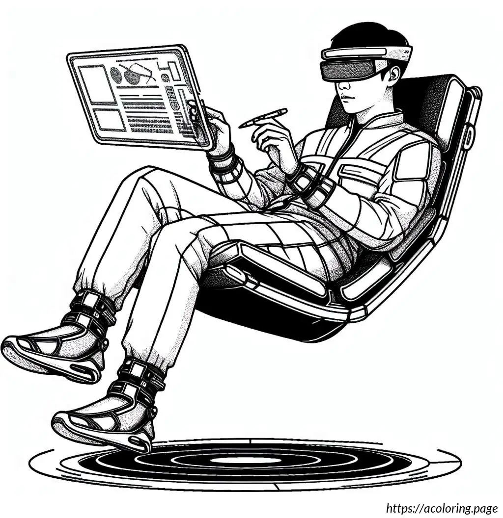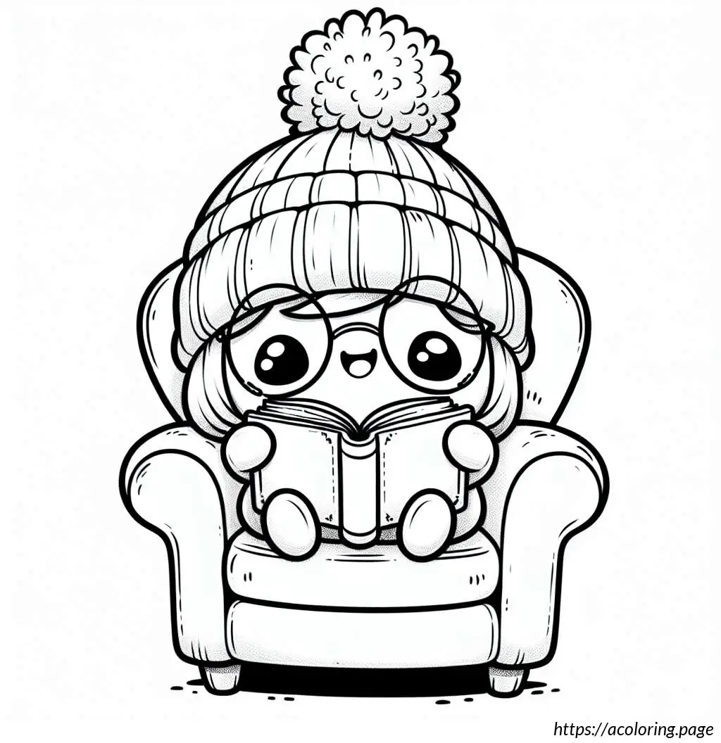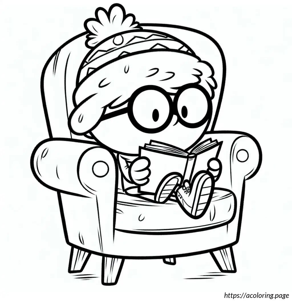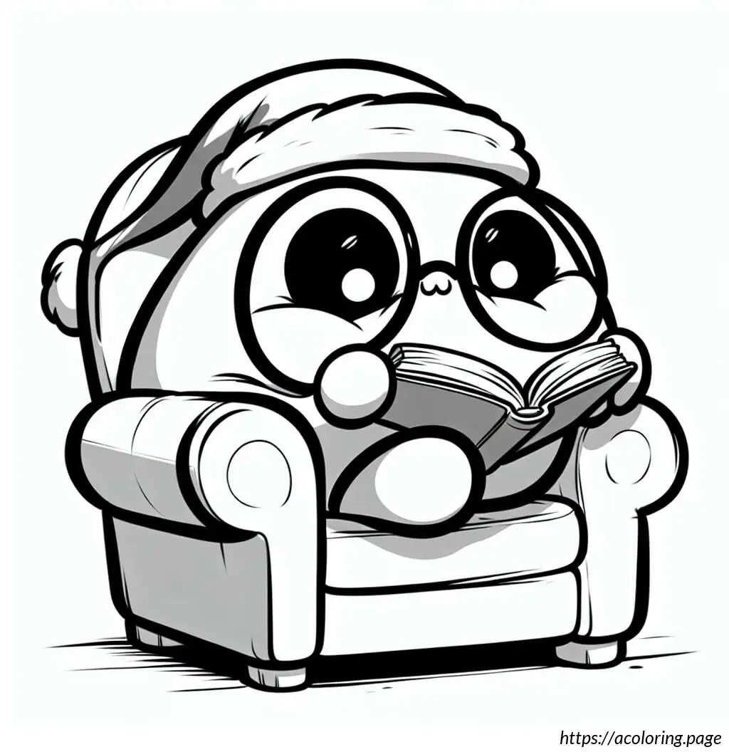 This image is a black and white line drawing of a cute, cartoon style elderly man sitting comfortably in an armchair. He is wearing round glasses, and his facial expression is cheerful with a gentle smile. He has a round face, a small tuft of hair under his chin, and is wearing a Santa hat, indicating a holiday theme. The character is reading a book, holding it open with both hands. His attire includes a simple long-sleeve shirt and pants, and he is wearing slippers. The overall appearance gives an impression of a cozy, content individual, likely enjoying a quiet moment. This type of image could be appealing to children and is suitable for coloring activities.