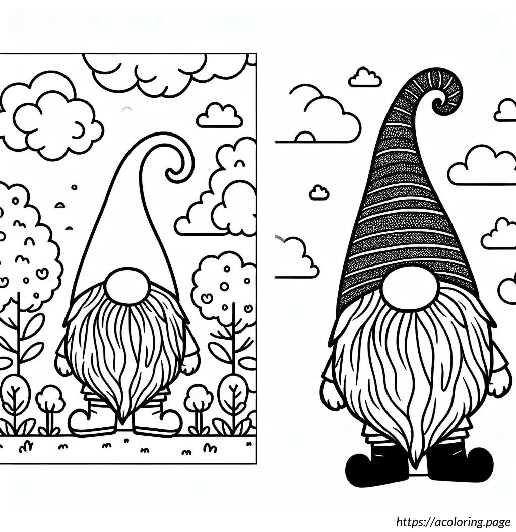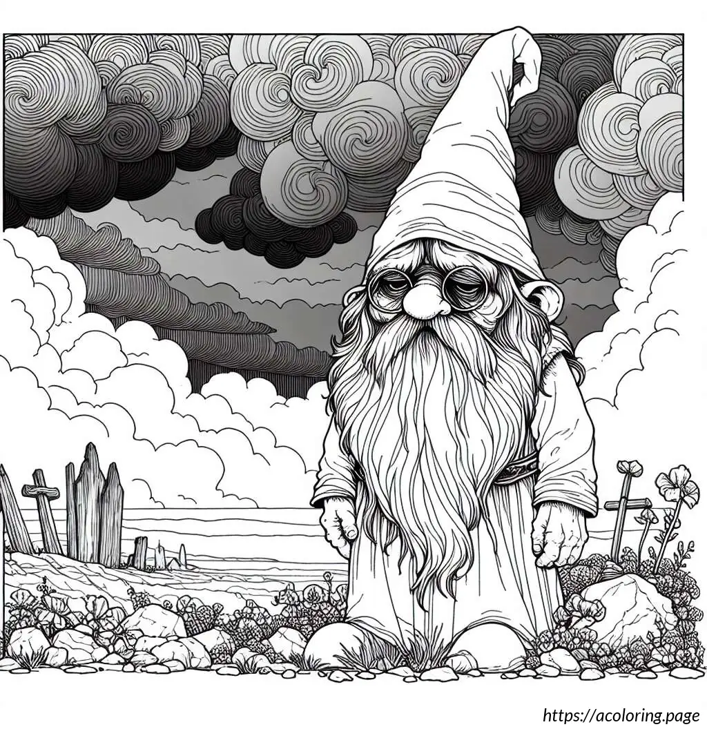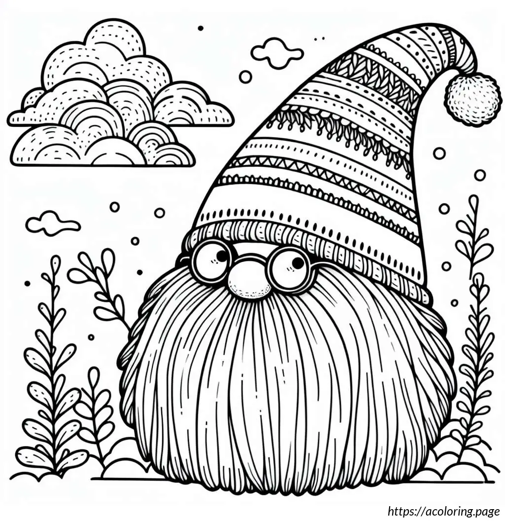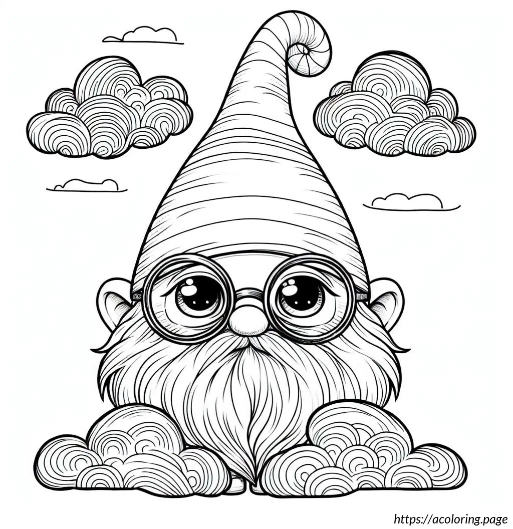 This image features a cartoon drawing of a gnome standing in the center. The gnome has a pointed hat, round glasses, a full beard, and is wearing a long coat. It appears in a simple and clean line art style without color. Above the gnome, there are clouds lined with detailed fringe to suggest texture, possibly representing snowy clouds given the presence of the winter-appropriate attire of the gnome. The composition is symmetric and visually balanced, primarily done in black outlines against a white background.