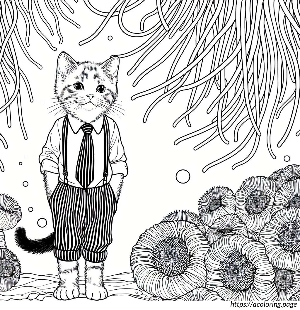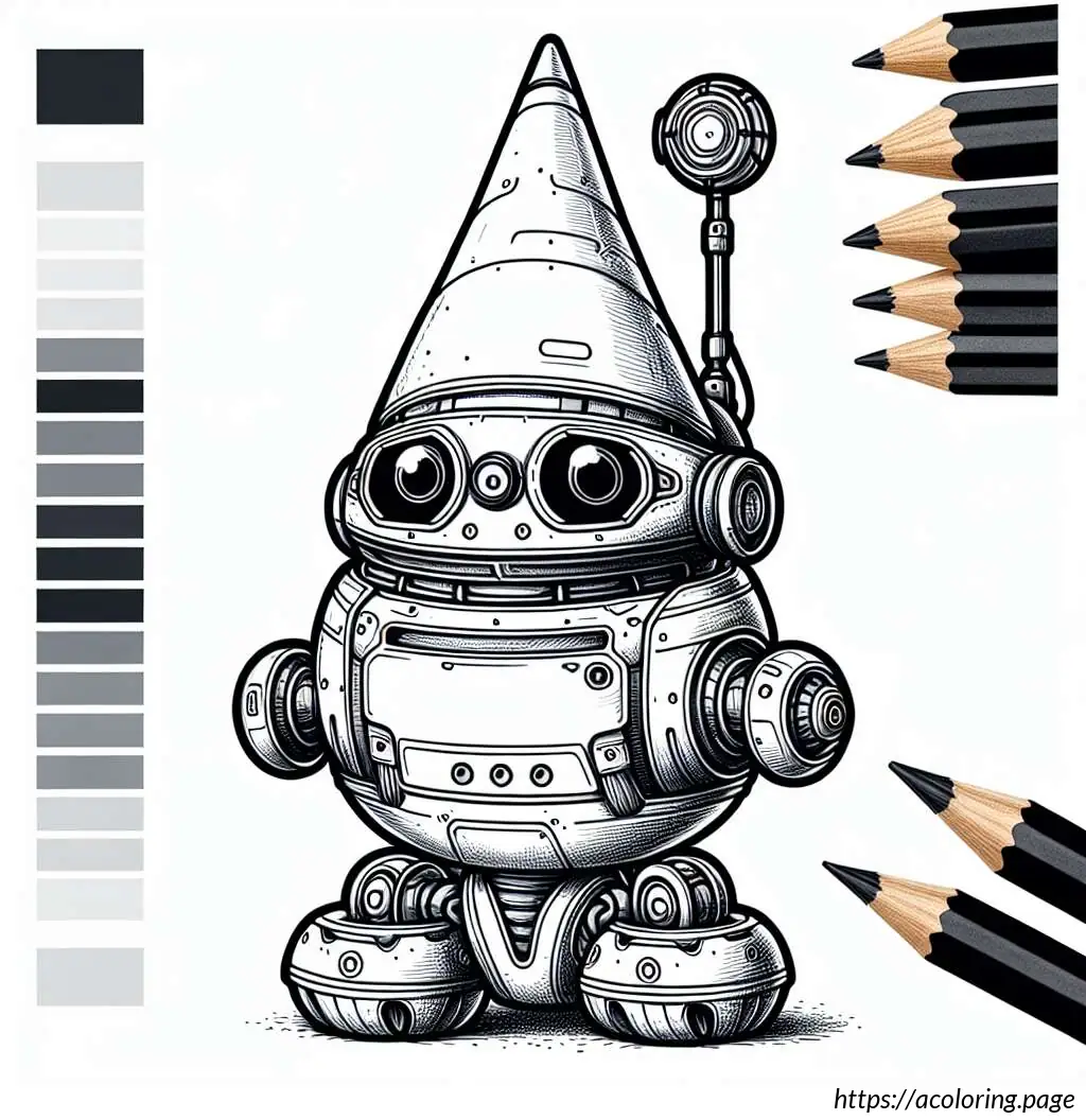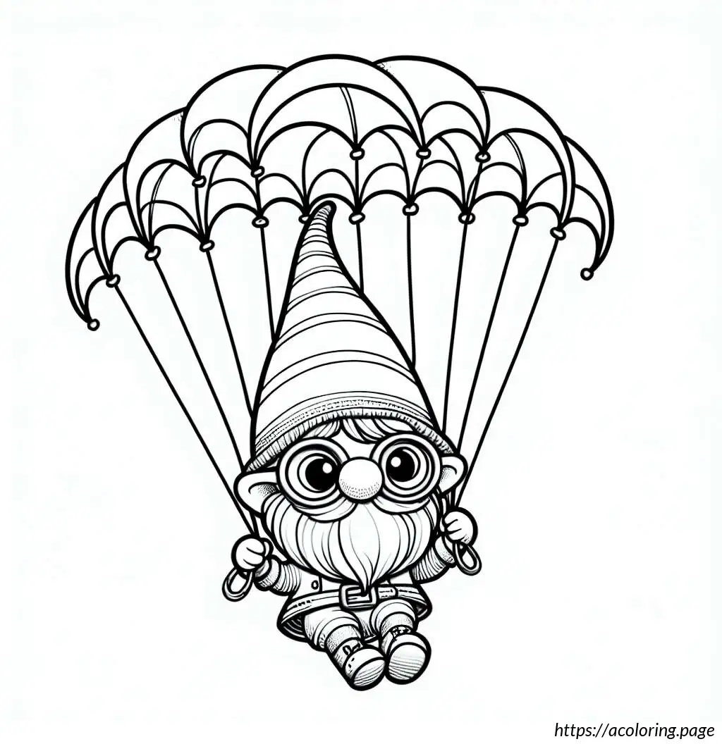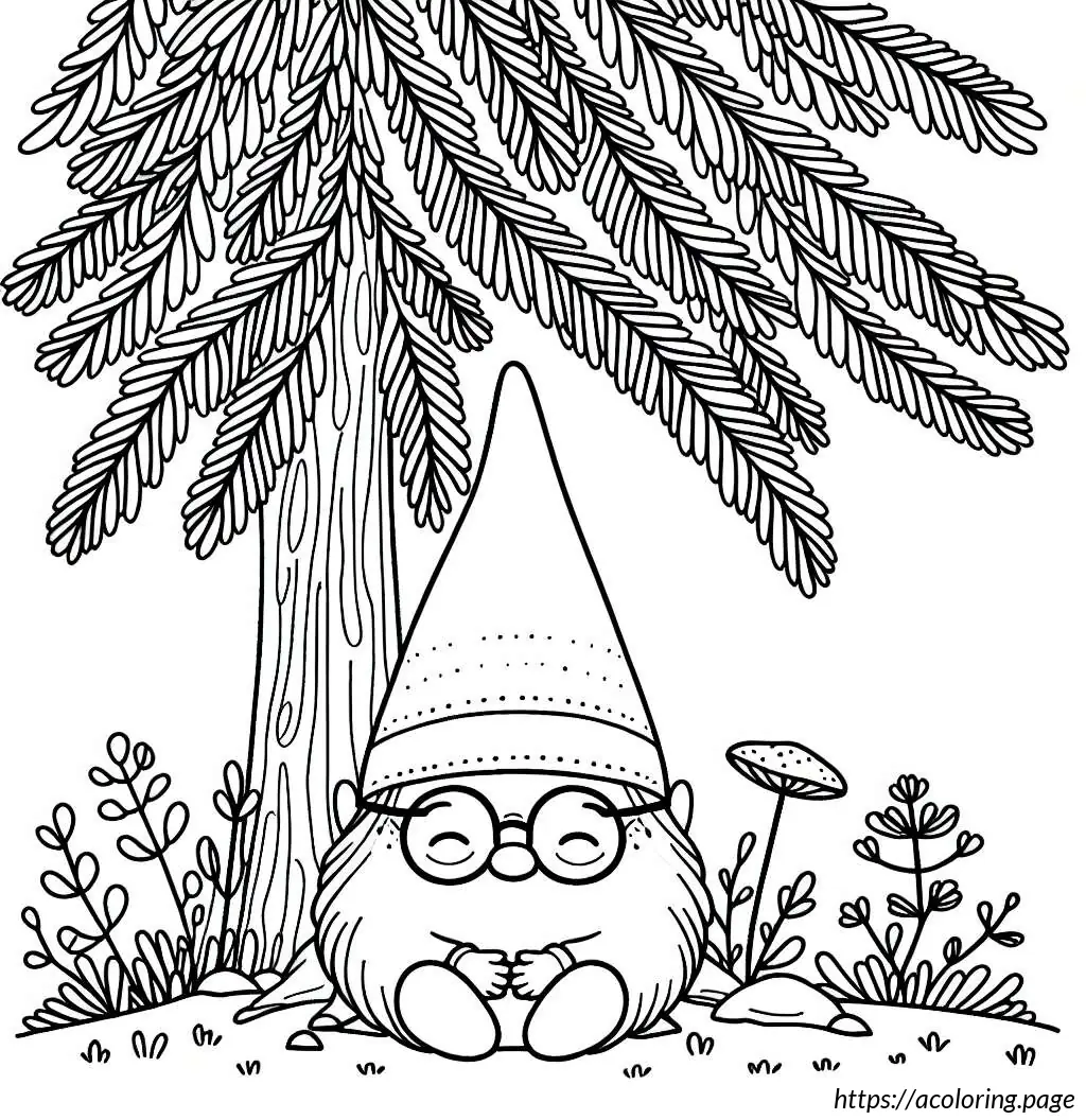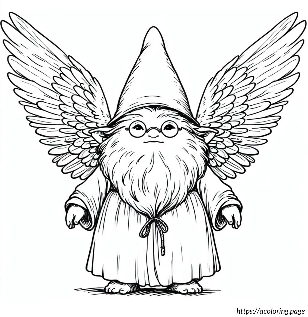 This image features a cartoon drawing of a gnome standing in the center. The gnome has a pointed hat, round glasses, a full beard, and is wearing a long coat. It appears in a simple and clean line art style without color. Above the gnome, there are clouds lined with detailed fringe to suggest texture, possibly representing snowy clouds given the presence of the winter-appropriate attire of the gnome. The composition is symmetric and visually balanced, primarily done in black outlines against a white background.