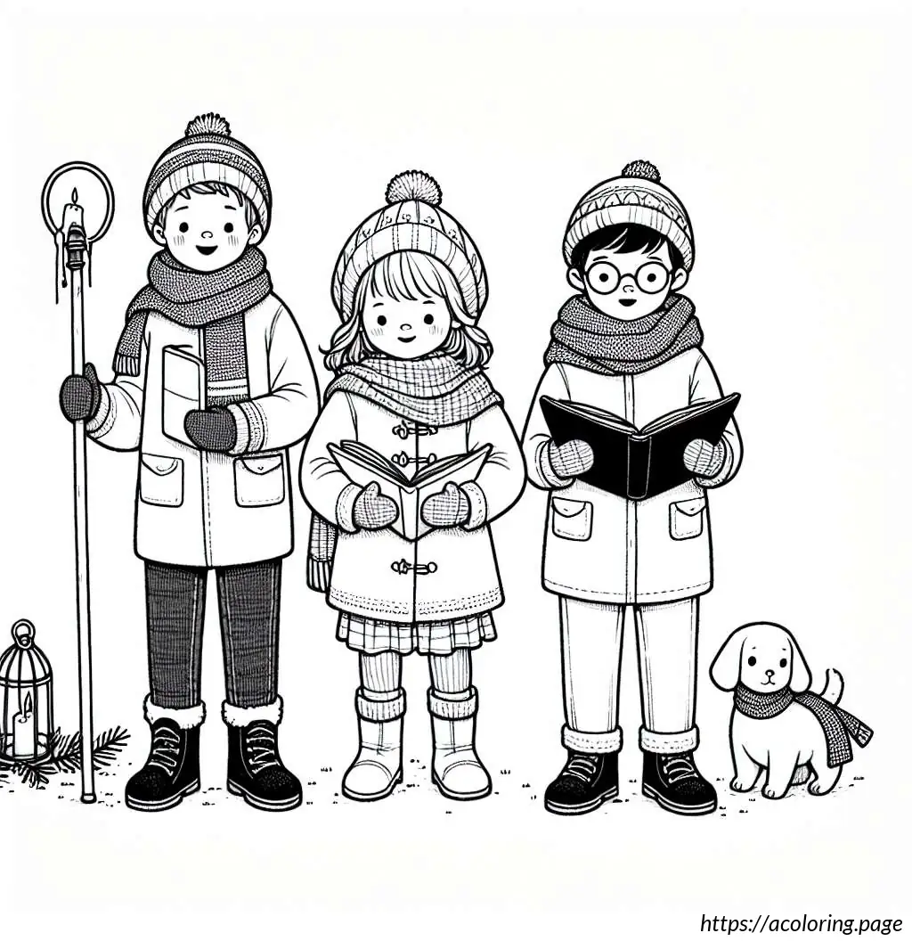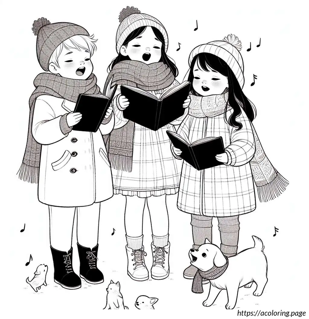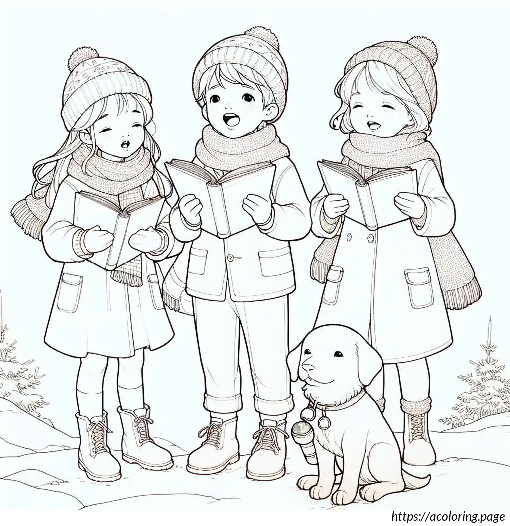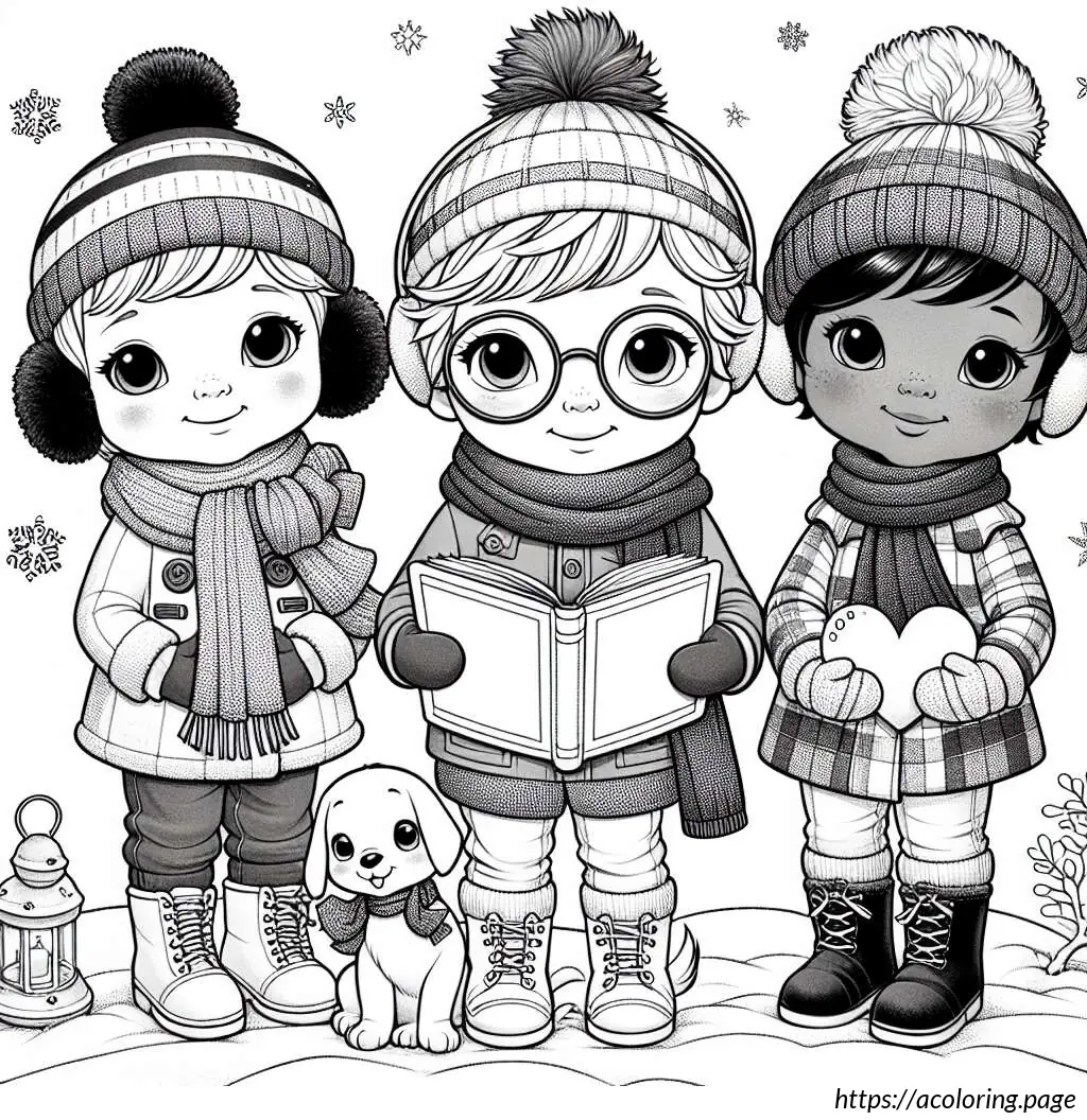 The image depicts a black and white illustration of three children and a dog. The children appear to be dressed in warm winter clothing, suitable for cold weather, and each is holding a booklet, suggesting that they might be singing carols. They are each wearing a different style of winter hat one with a basic beanie, one with a hat topped with a bobble, and another with a hat possibly resembling a Santa hat. Their expressions vary but they look focused, possibly singing or preparing to sing. Each child”s coat has a heart-shaped design element on it, adding to the festive or loving theme. The dog on the right side of the frame appears joyful and possibly in motion, with its tail up and ears back. The scene likely portrays a wintertime or holiday activity, such as caroling, in a charming, cartoon-like style.