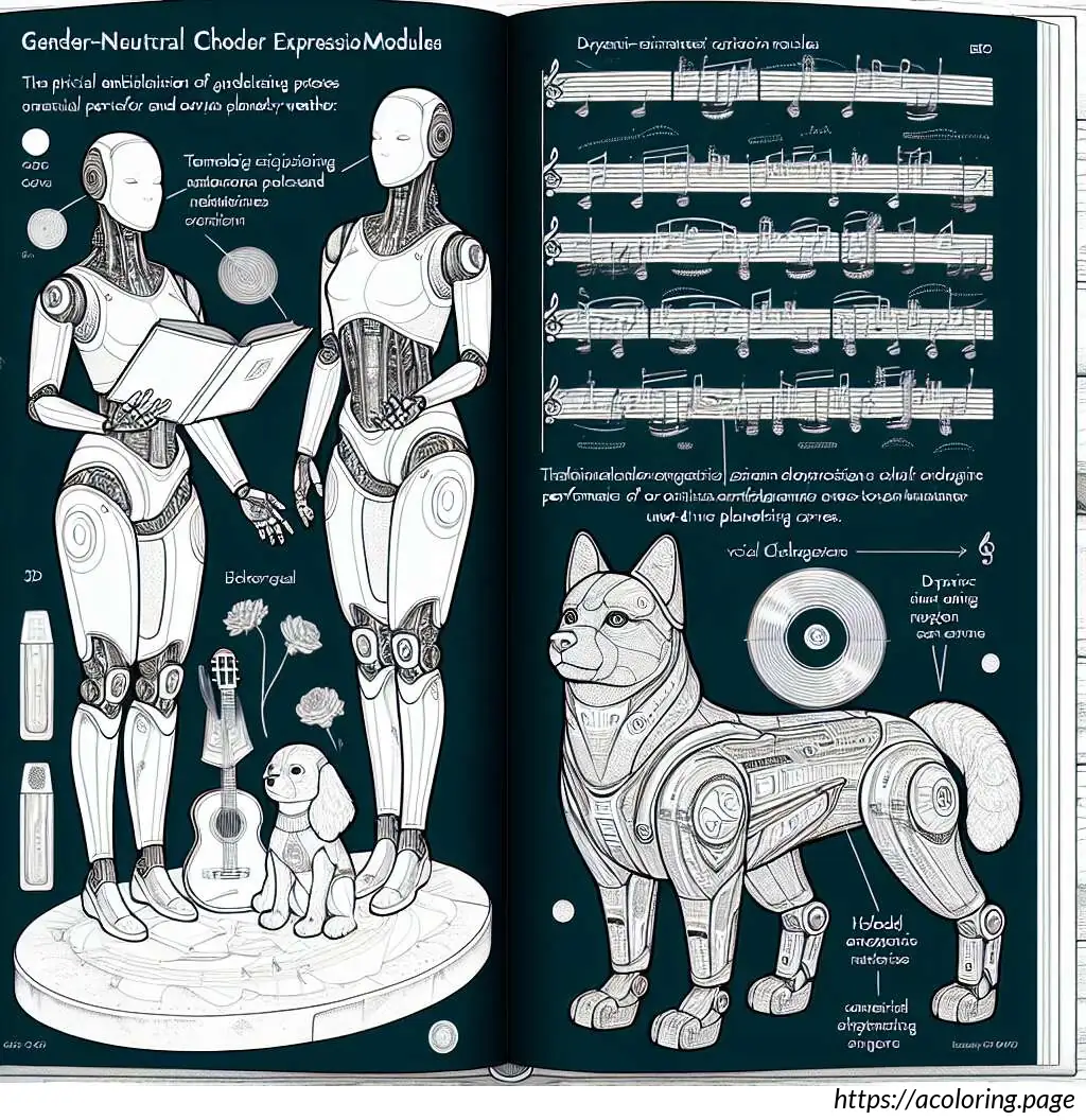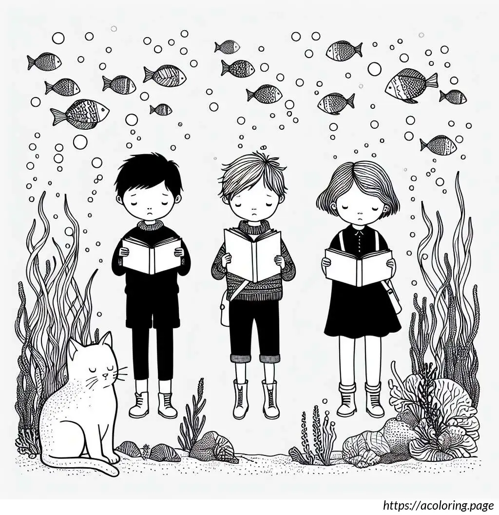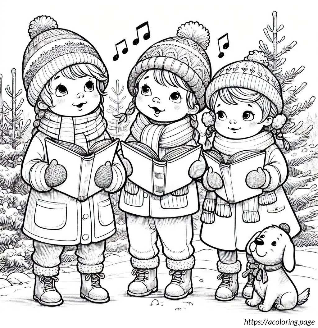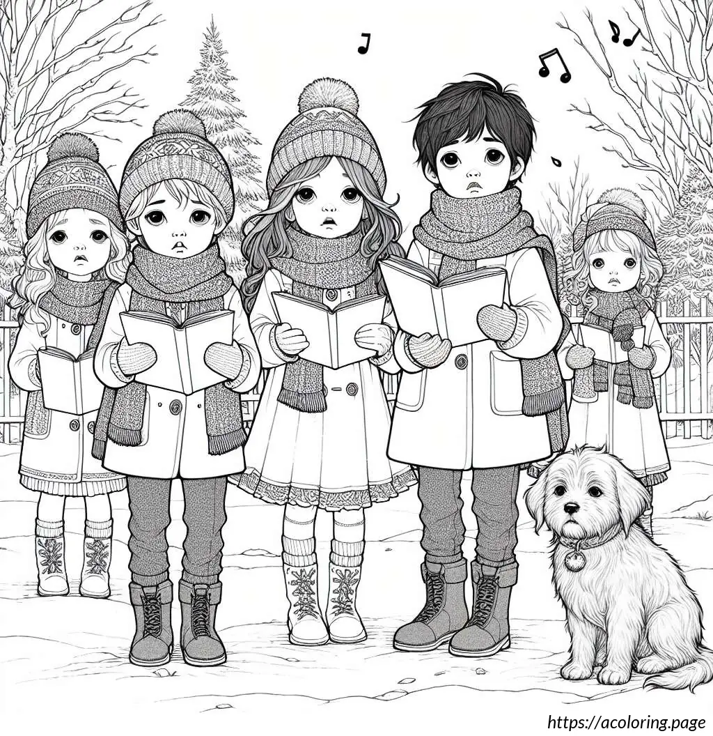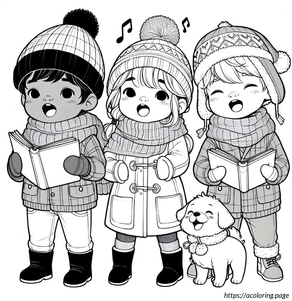 The image depicts a black and white illustration of three children and a dog. The children appear to be dressed in warm winter clothing, suitable for cold weather, and each is holding a booklet, suggesting that they might be singing carols. They are each wearing a different style of winter hat one with a basic beanie, one with a hat topped with a bobble, and another with a hat possibly resembling a Santa hat. Their expressions vary but they look focused, possibly singing or preparing to sing. Each child”s coat has a heart-shaped design element on it, adding to the festive or loving theme. The dog on the right side of the frame appears joyful and possibly in motion, with its tail up and ears back. The scene likely portrays a wintertime or holiday activity, such as caroling, in a charming, cartoon-like style.
