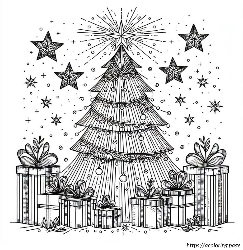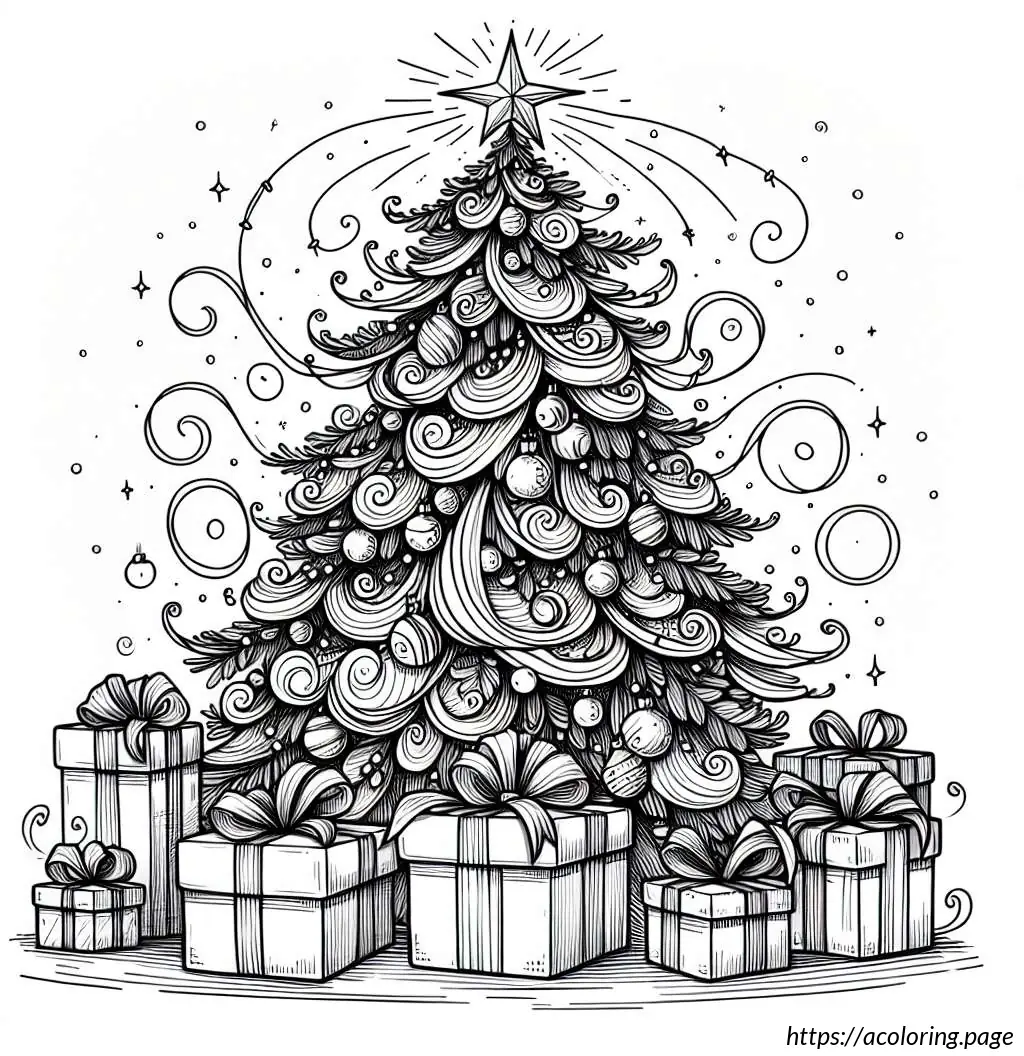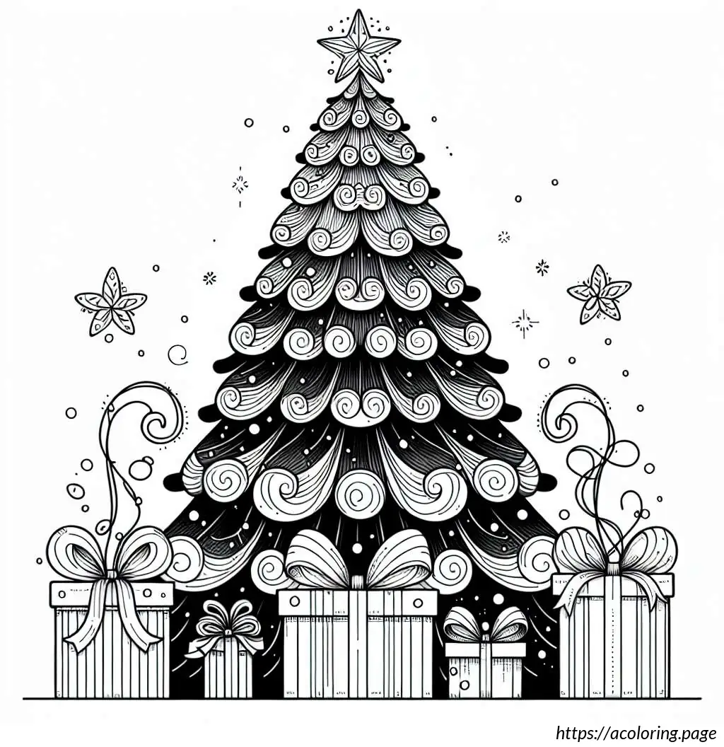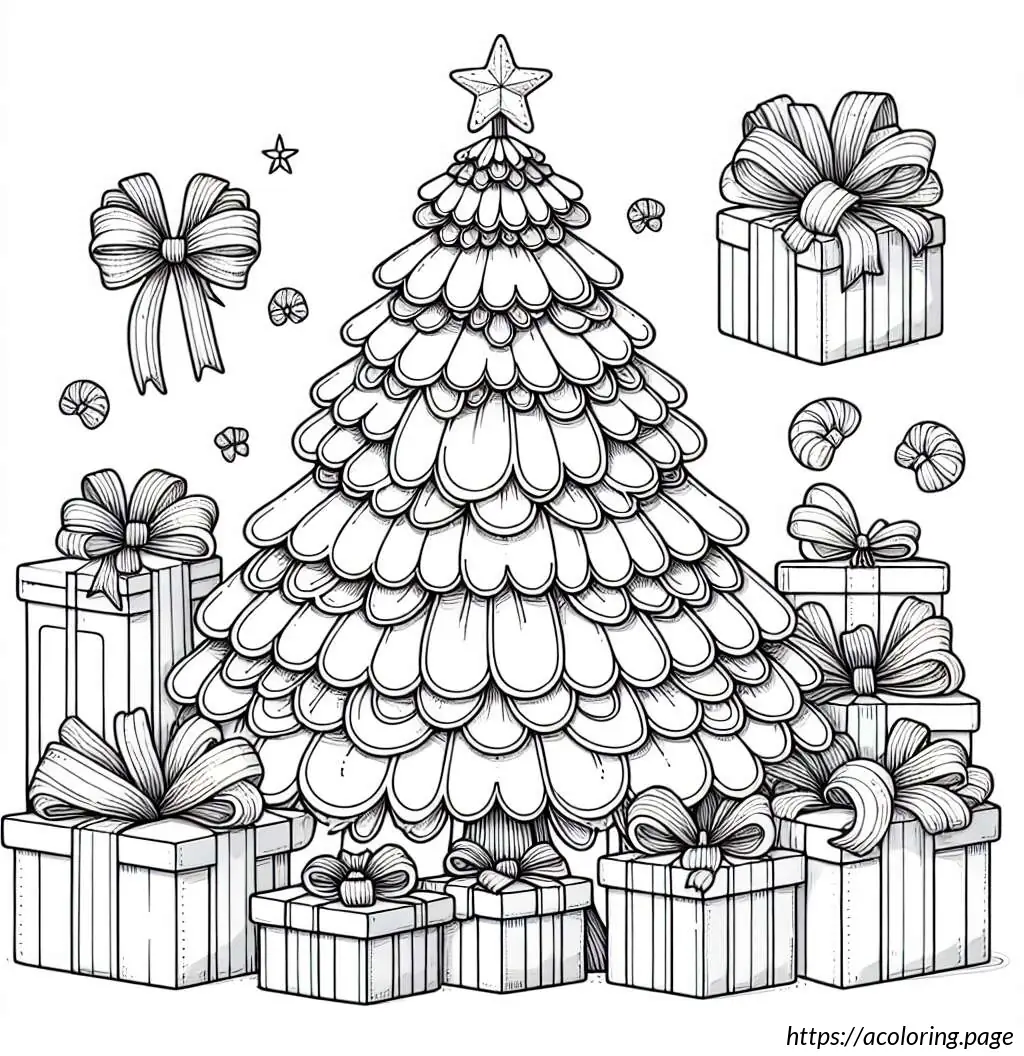 This image depicts a simple, stylized drawing of a Christmas tree with various gift boxes placed at its base. The Christmas tree is adorned with a star on the top and features tiered, curved branches that give it a full and lush appearance. Around the base of the tree, there are six gift boxes of varying sizes, each with a distinct ribbon tied neatly around it, suggesting the boxes are wrapped presents. The drawing is a black-and-white line art style, ideal for coloring activities.