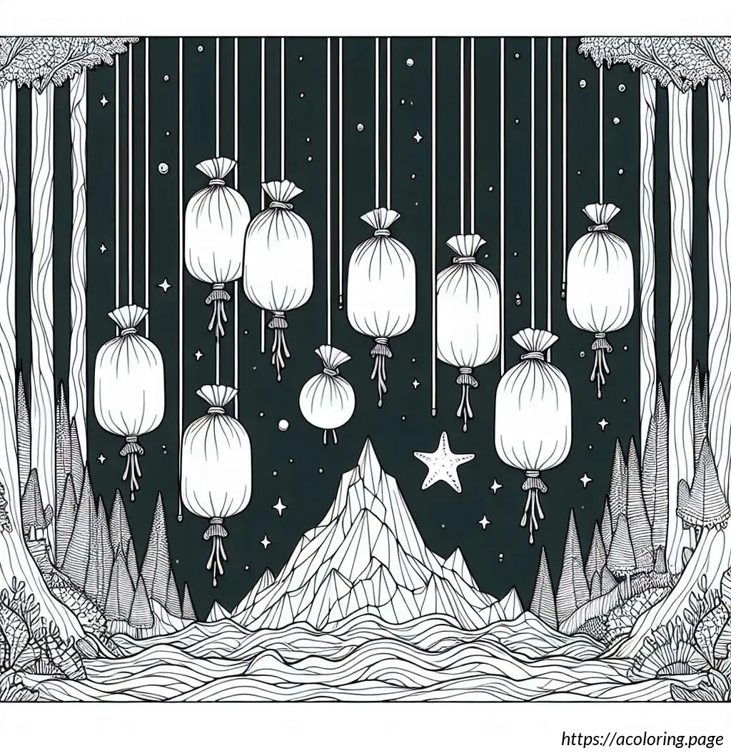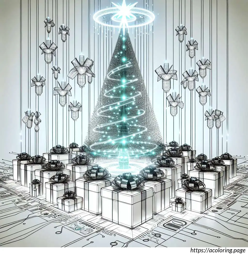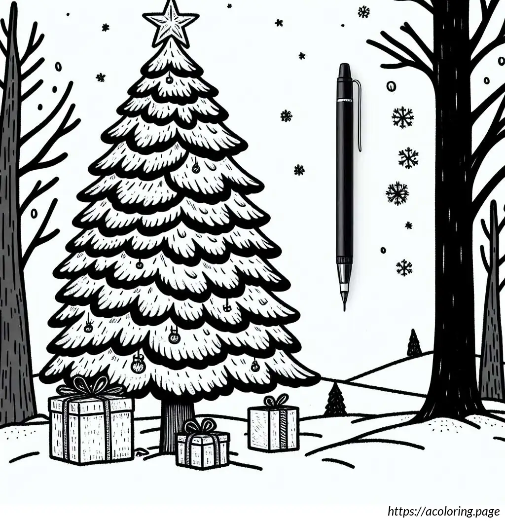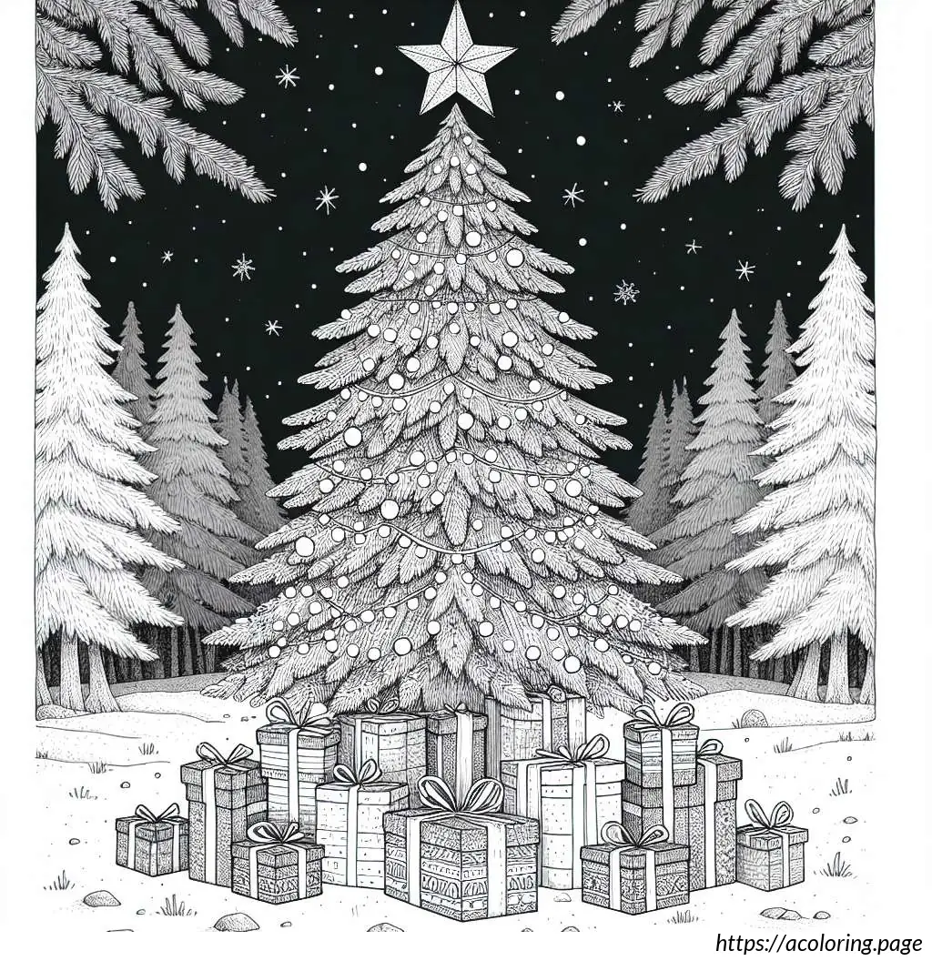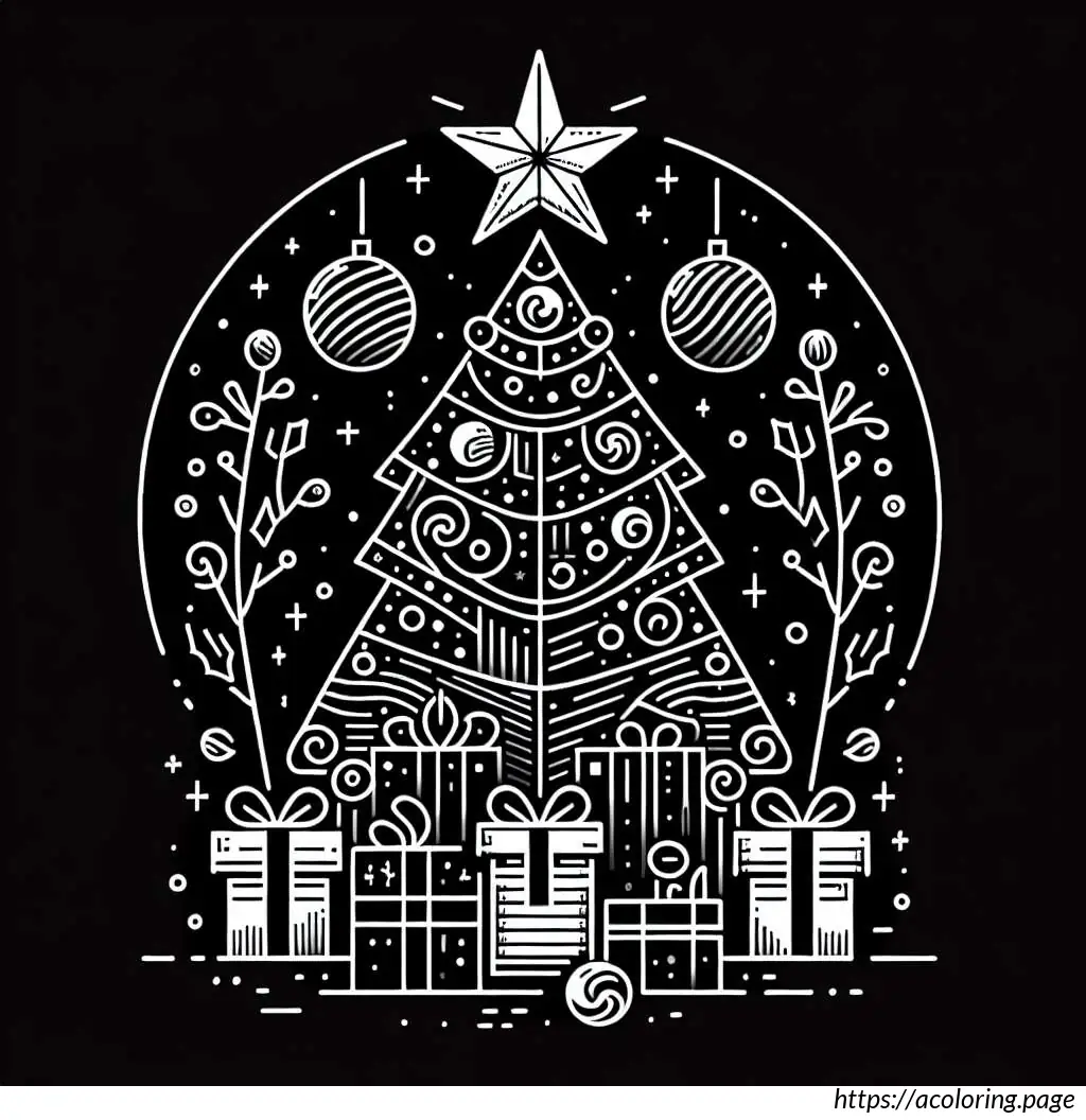This image depicts a simple, stylized drawing of a Christmas tree with various gift boxes placed at its base. The Christmas tree is adorned with a star on the top and features tiered, curved branches that give it a full and lush appearance. Around the base of the tree, there are six gift boxes of varying sizes, each with a distinct ribbon tied neatly around it, suggesting the boxes are wrapped presents. The drawing is a black-and-white line art style, ideal for coloring activities.