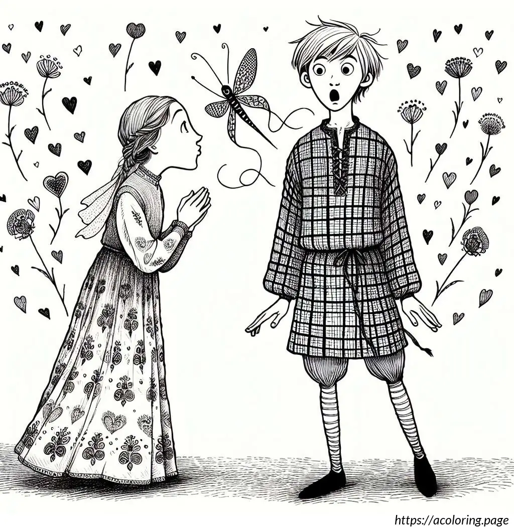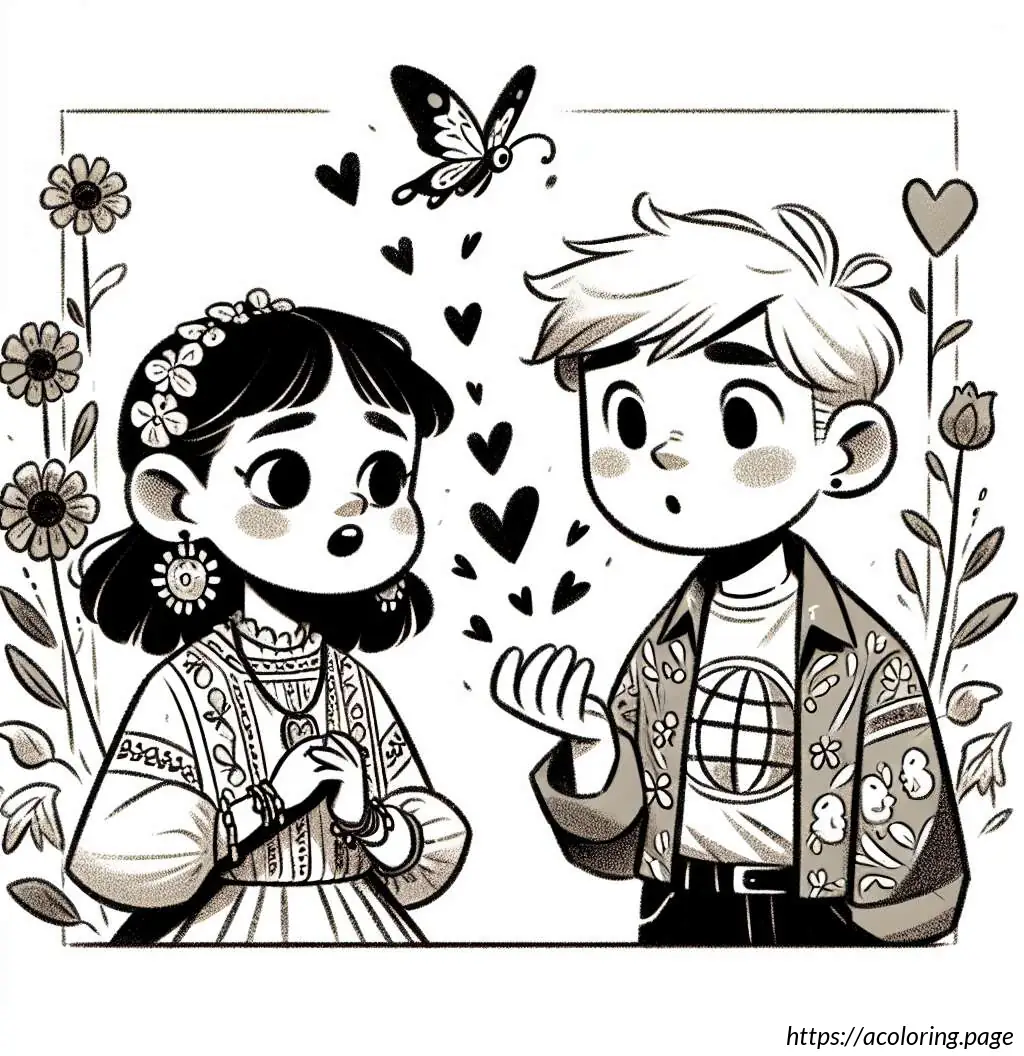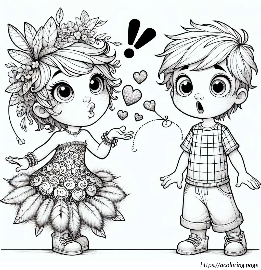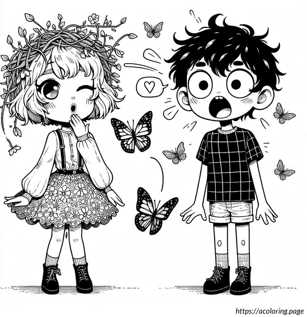 This is a black-and-white illustration depicting two cartoon characters in what appears to be a scene of surprise or enchantment. On the left, there is a character with short, messy hair and decorations that resemble leaves or flowers in their hair and on their outfit. This character has closed eyes, puckered lips, and is surrounded by small heart shapes, giving the appearance of blowing kisses. The outfit is decorated with flower motifs.On the right, there is another character, apparently startled or taken aback by the first character”s actions. This character has wide, round eyes and an open mouth suggesting surprise. They wear a t-shirt with a grid or net-like design and plain shorts.Above the second character, there”s a butterfly hanging in the air, seemingly being lowered from above on a string, which adds to the whimsical and playful nature of the scene. The first character seems unaware or indifferent to the butterfly, while the second one notices it with an expression of alarm, accentuated by an exclamation mark above their head.Overall, the illustration conveys a lighthearted and possibly romantic or affectionate interaction, though one character seems much more enthusiastic than the other.