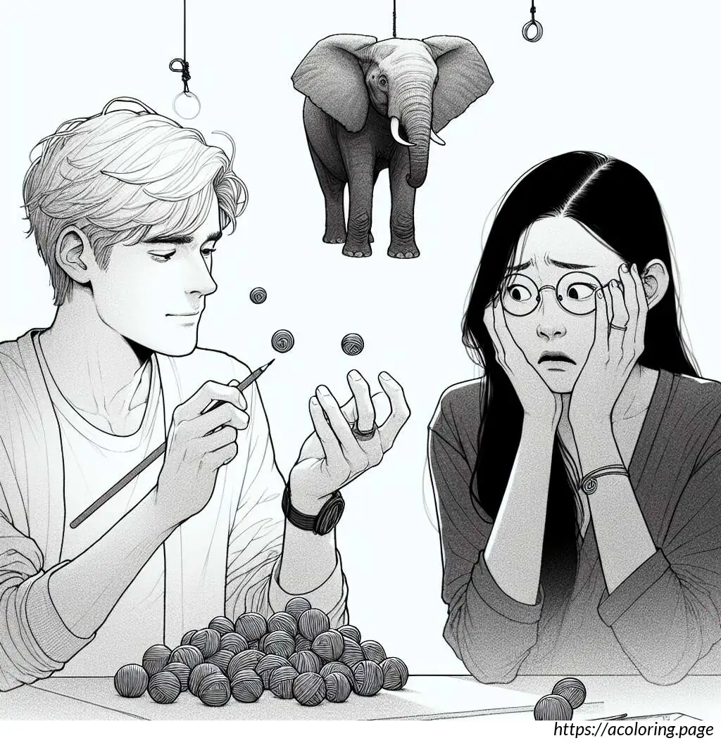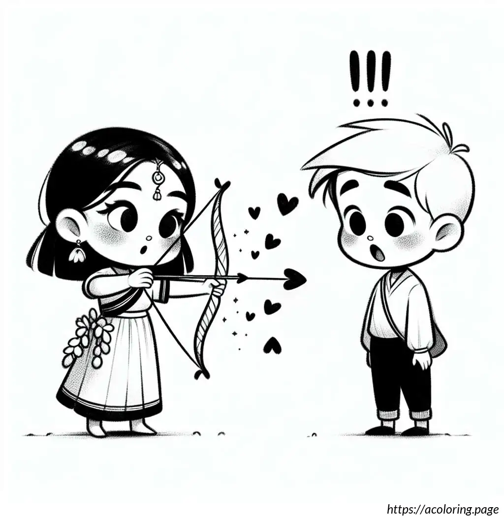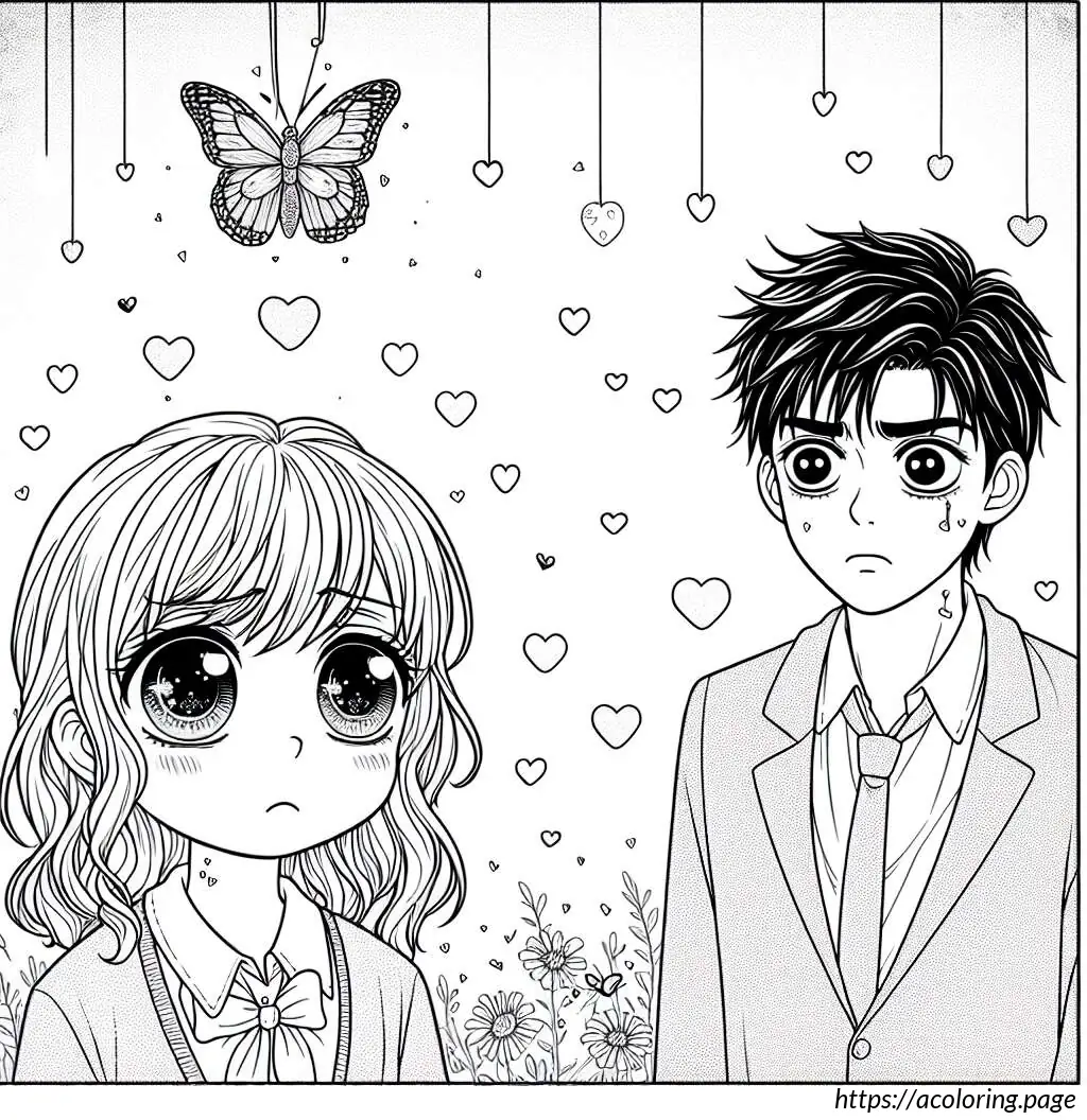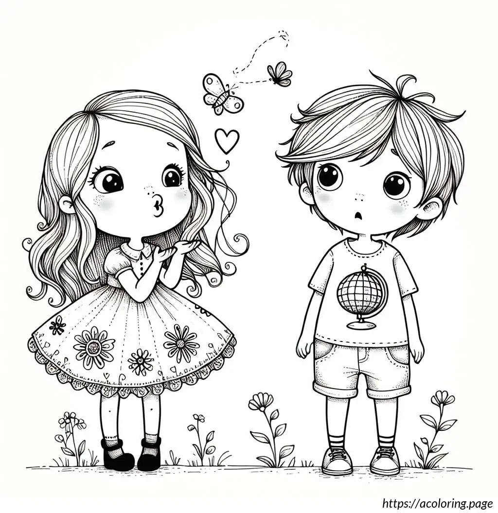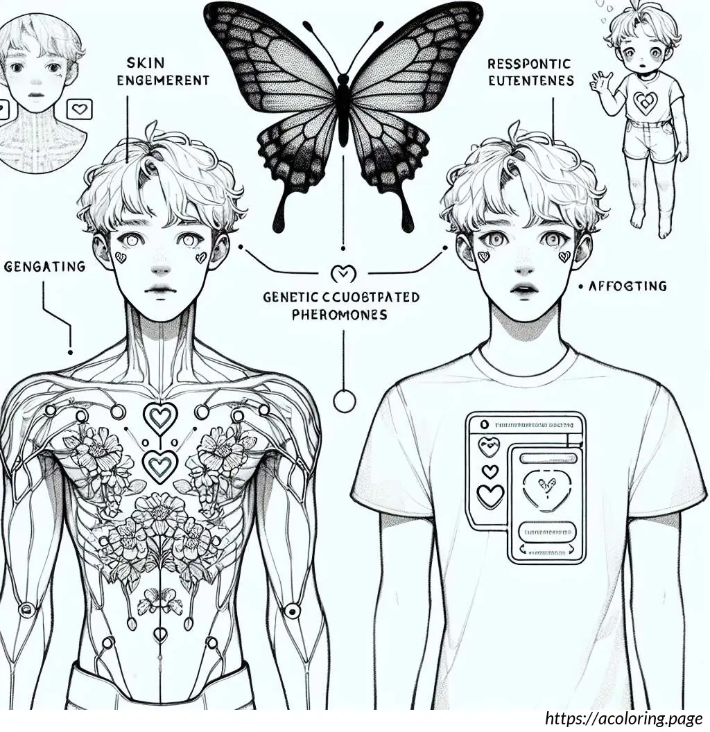 This is a black-and-white illustration depicting two cartoon characters in what appears to be a scene of surprise or enchantment. On the left, there is a character with short, messy hair and decorations that resemble leaves or flowers in their hair and on their outfit. This character has closed eyes, puckered lips, and is surrounded by small heart shapes, giving the appearance of blowing kisses. The outfit is decorated with flower motifs.On the right, there is another character, apparently startled or taken aback by the first character”s actions. This character has wide, round eyes and an open mouth suggesting surprise. They wear a t-shirt with a grid or net-like design and plain shorts.Above the second character, there”s a butterfly hanging in the air, seemingly being lowered from above on a string, which adds to the whimsical and playful nature of the scene. The first character seems unaware or indifferent to the butterfly, while the second one notices it with an expression of alarm, accentuated by an exclamation mark above their head.Overall, the illustration conveys a lighthearted and possibly romantic or affectionate interaction, though one character seems much more enthusiastic than the other.