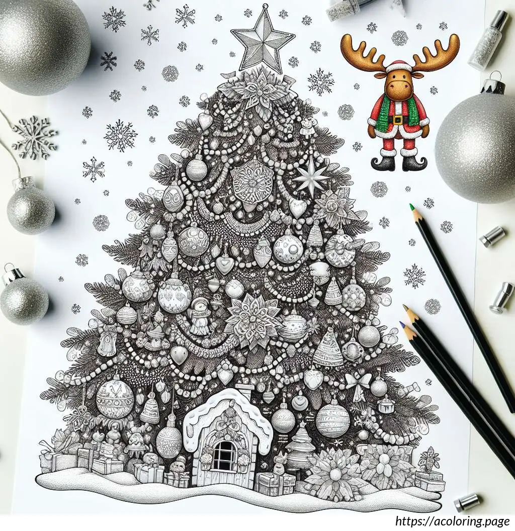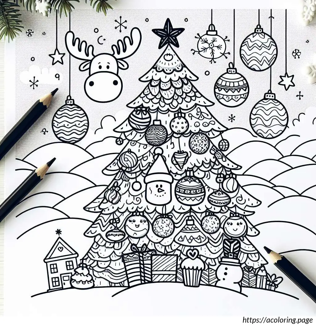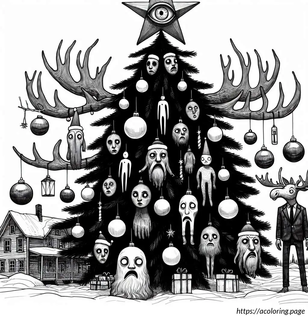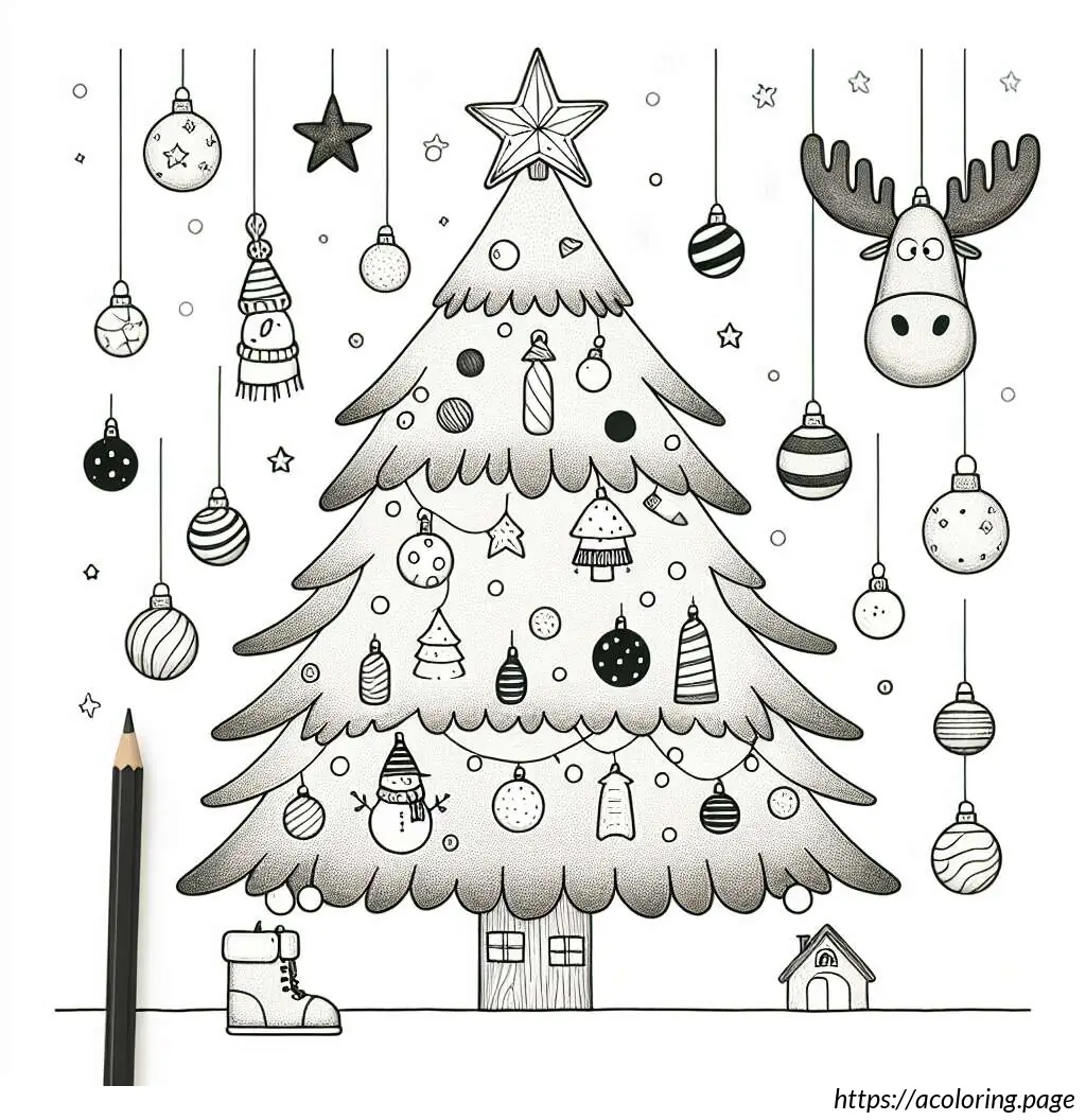This image is a playful and whimsical line art drawing of a Christmas tree, adorned with a variety of cute and festive decorations. At the top of the tree, there is a large star with an eye in the center. Below the star, hanging from the tree branches, are various ornaments including a moose head with a neutral expression, striped balls, a snowman wearing a hat, and a couple of character faces wearing party hats. One of the ornaments looks like a beehive. Additionally, the bottom of the tree extends over a simplified depiction of a house roof, suggesting that the tree is very large in relation to the house. The drawing is quite stylized and appears to be designed for coloring or educational purposes, as it features bold, clear lines suitable for such activities.