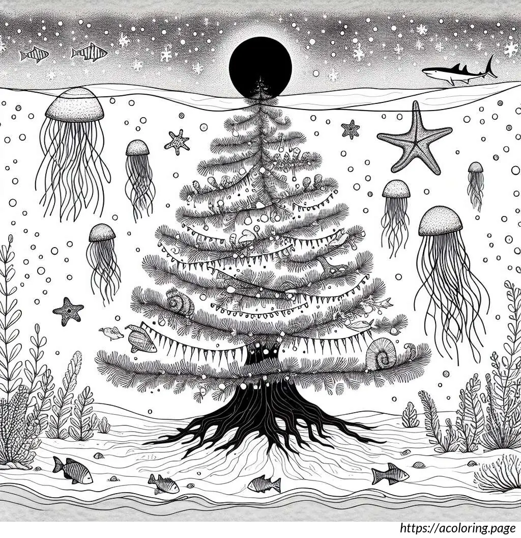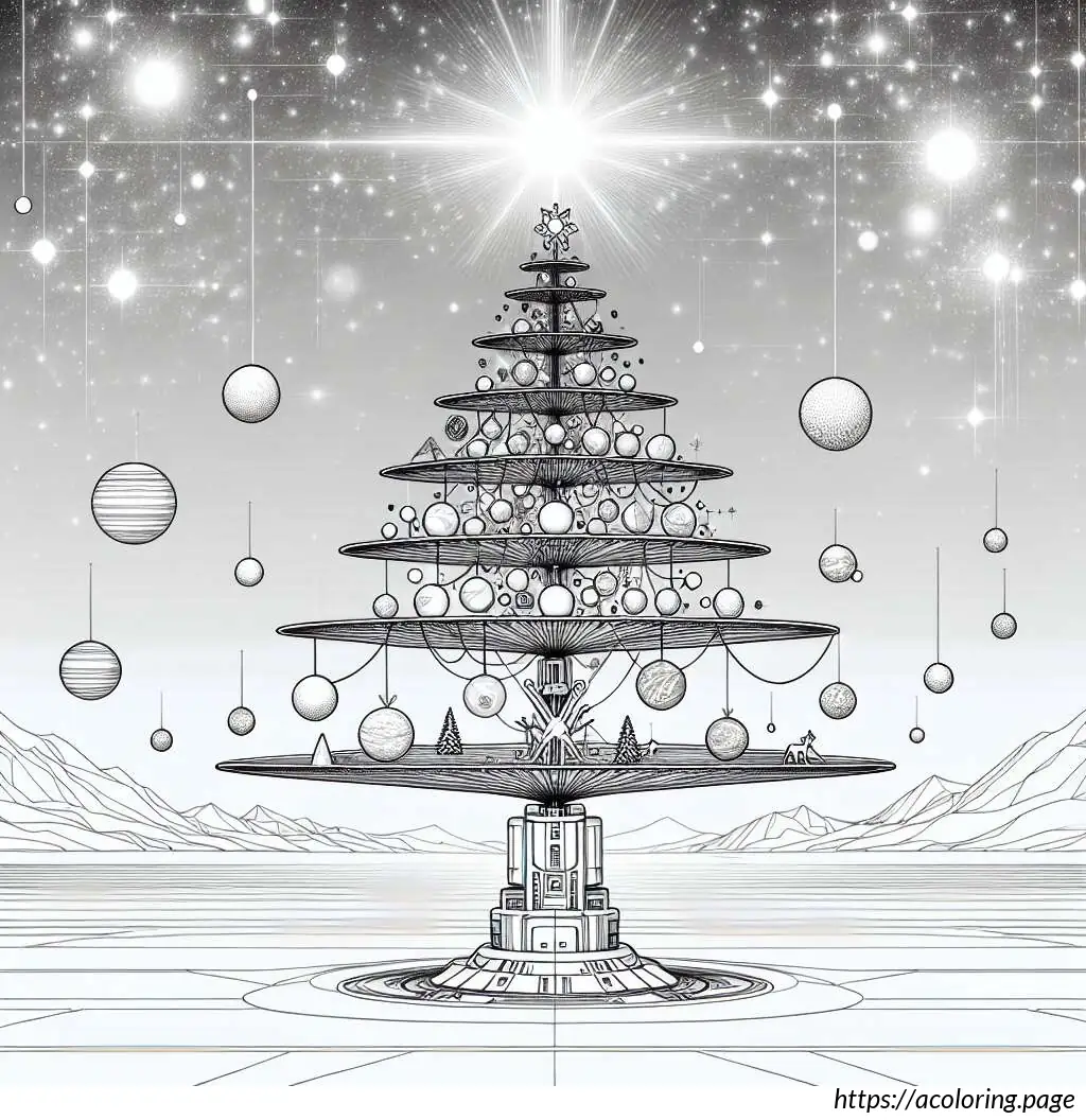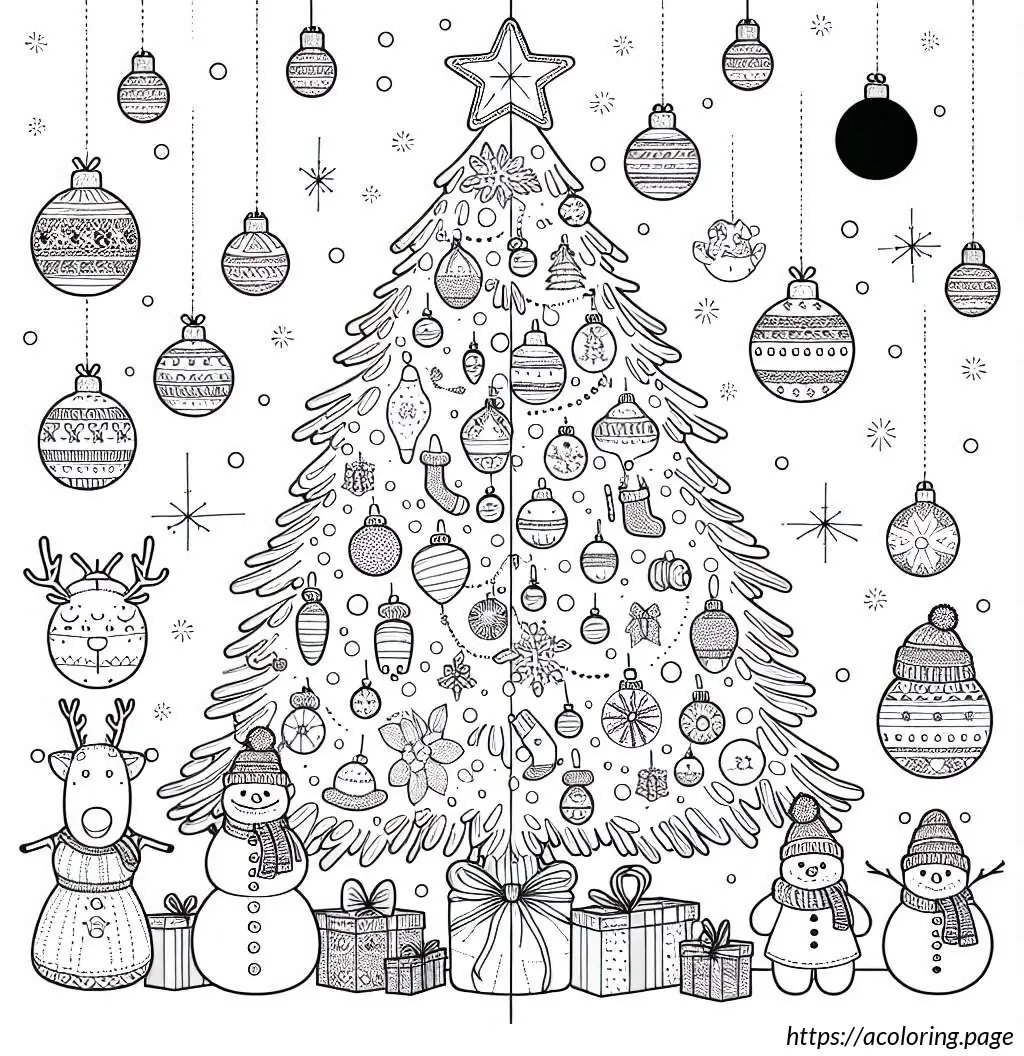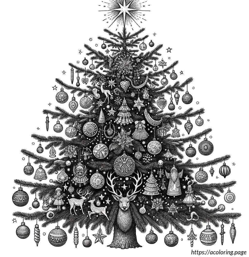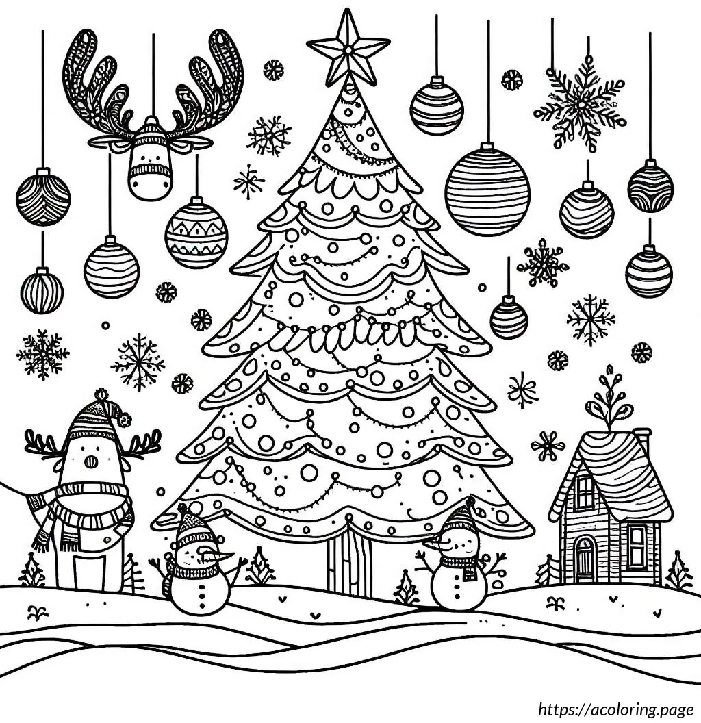 This image is a playful and whimsical line art drawing of a Christmas tree, adorned with a variety of cute and festive decorations. At the top of the tree, there is a large star with an eye in the center. Below the star, hanging from the tree branches, are various ornaments including a moose head with a neutral expression, striped balls, a snowman wearing a hat, and a couple of character faces wearing party hats. One of the ornaments looks like a beehive. Additionally, the bottom of the tree extends over a simplified depiction of a house roof, suggesting that the tree is very large in relation to the house. The drawing is quite stylized and appears to be designed for coloring or educational purposes, as it features bold, clear lines suitable for such activities.