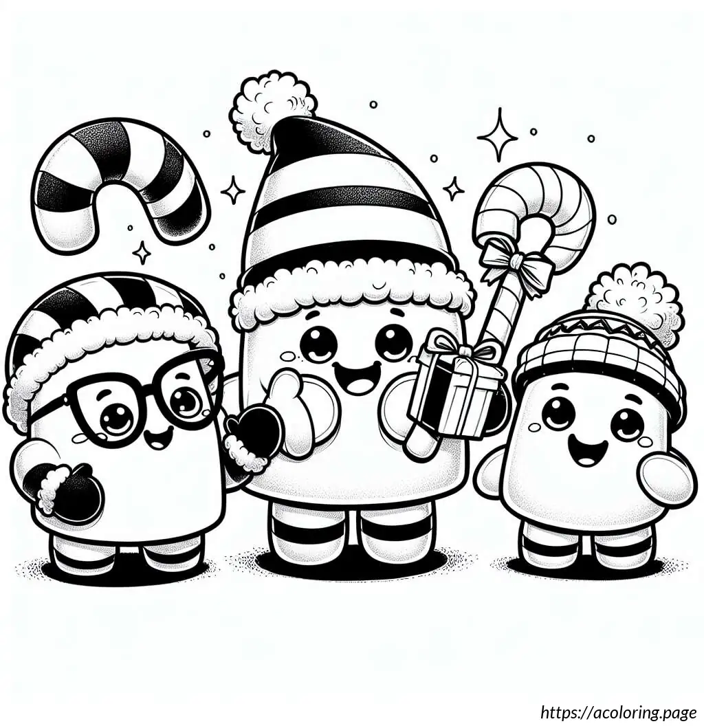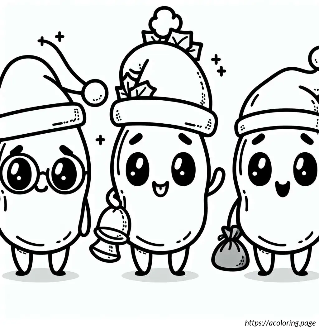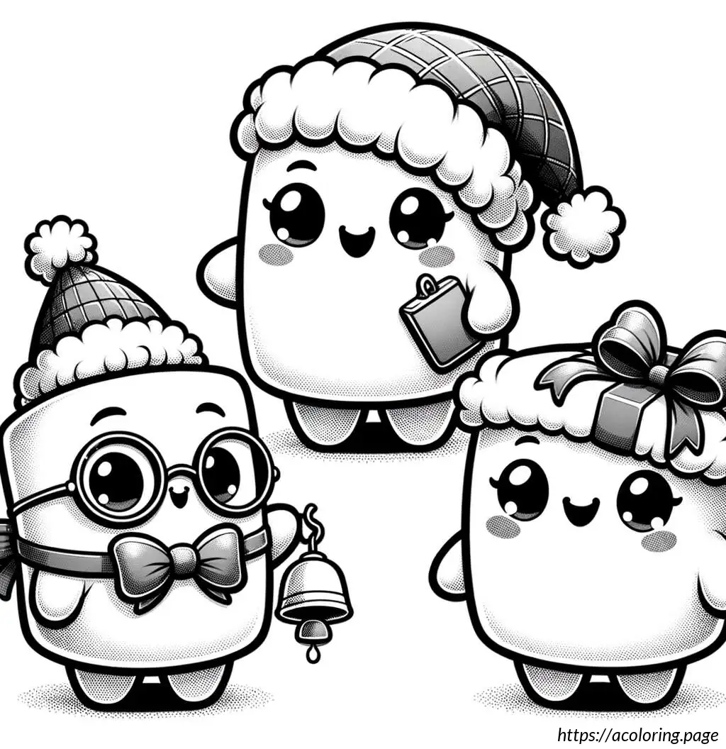This image features three cartoon characters that appear to be stylized as playful versions of holiday themed creatures, possibly marshmallows, given their shape and simple features. Each character is adorned with a Santa hat, and they exhibit various accessories and poses: