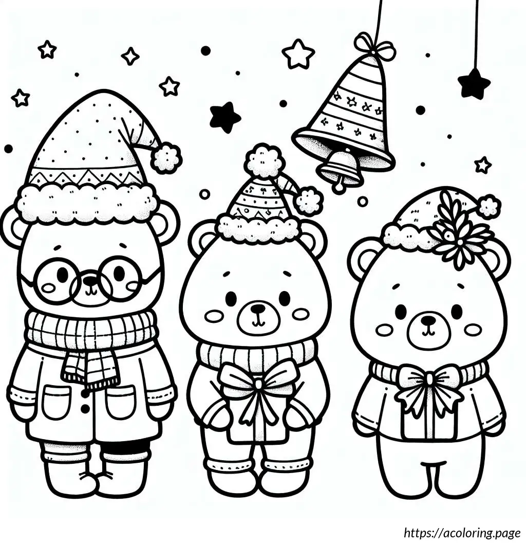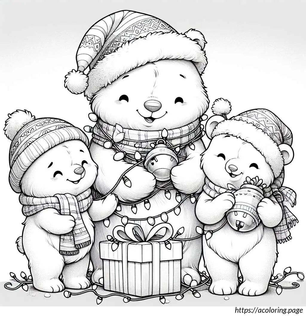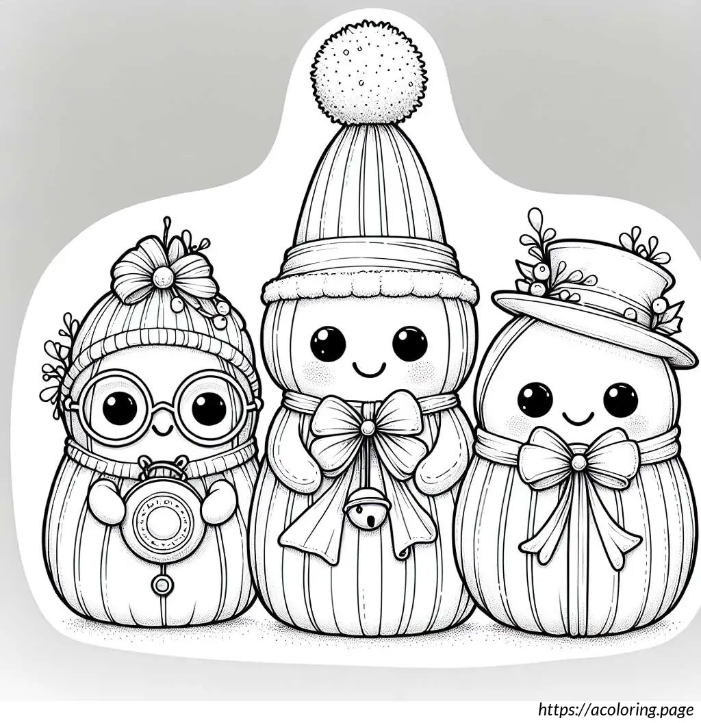 All the characters are outlined in black, giving a bold, cartoonish look suitable for coloring activities. The scene is festive, emphasizing a joyful, holiday spirit.