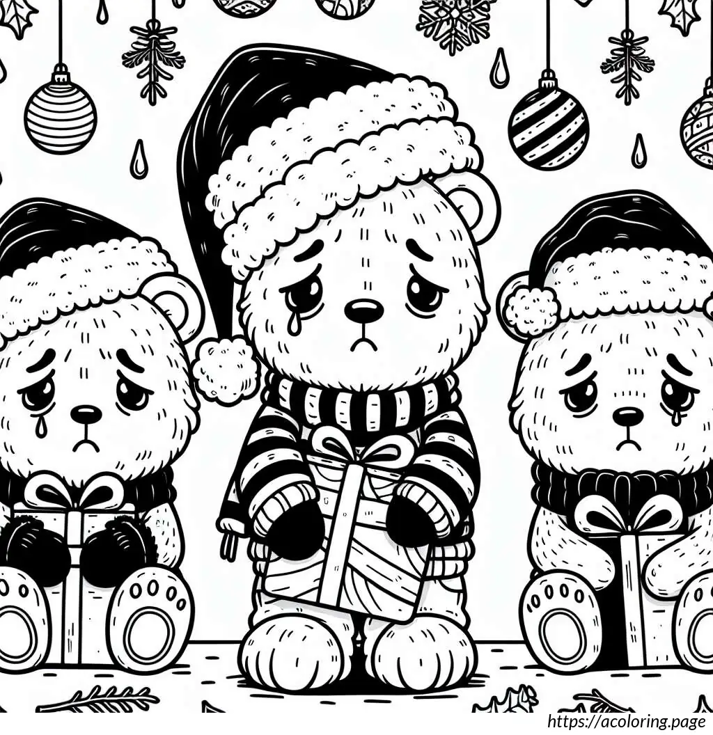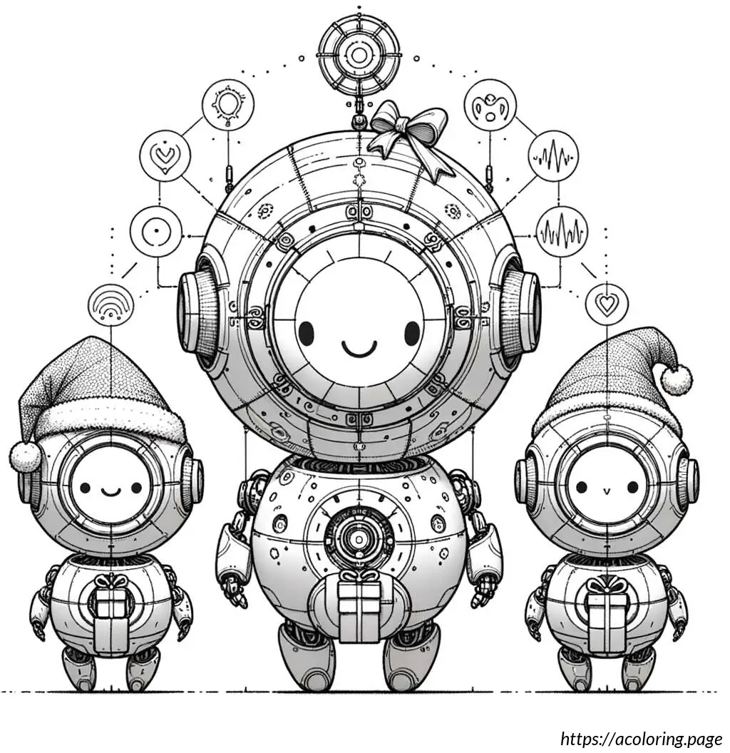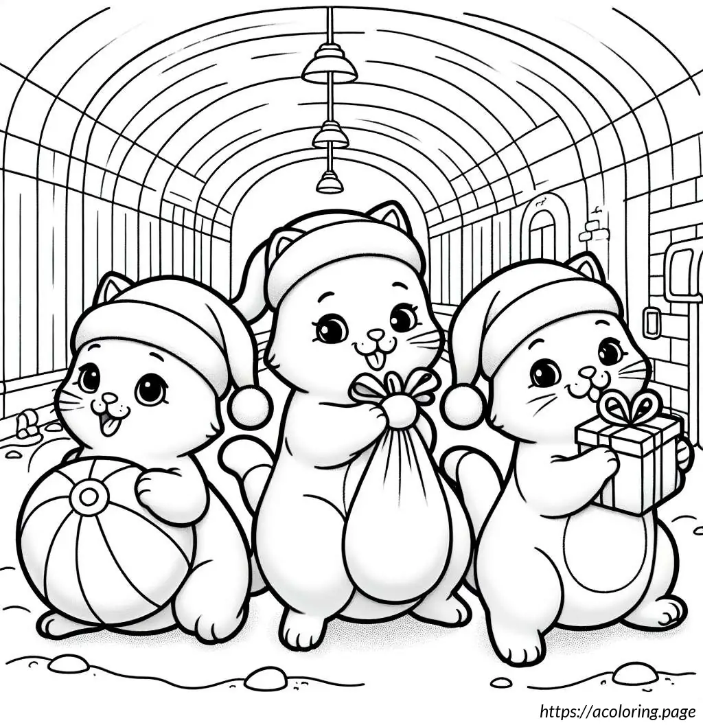 All the characters are outlined in black, giving a bold, cartoonish look suitable for coloring activities. The scene is festive, emphasizing a joyful, holiday spirit.