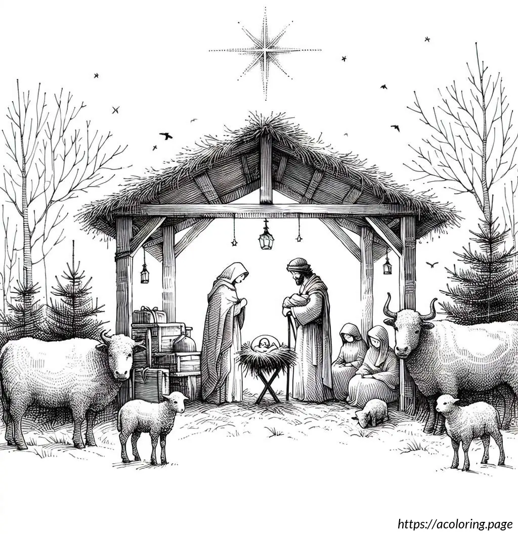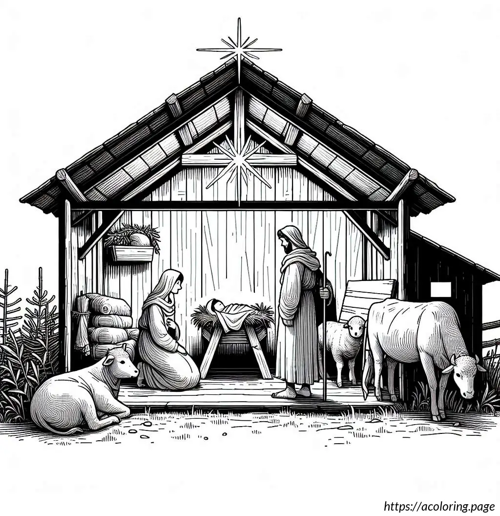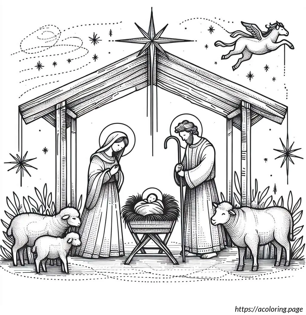 The image is a line drawing depicting a traditional Nativity scene, which includes the following elements:
