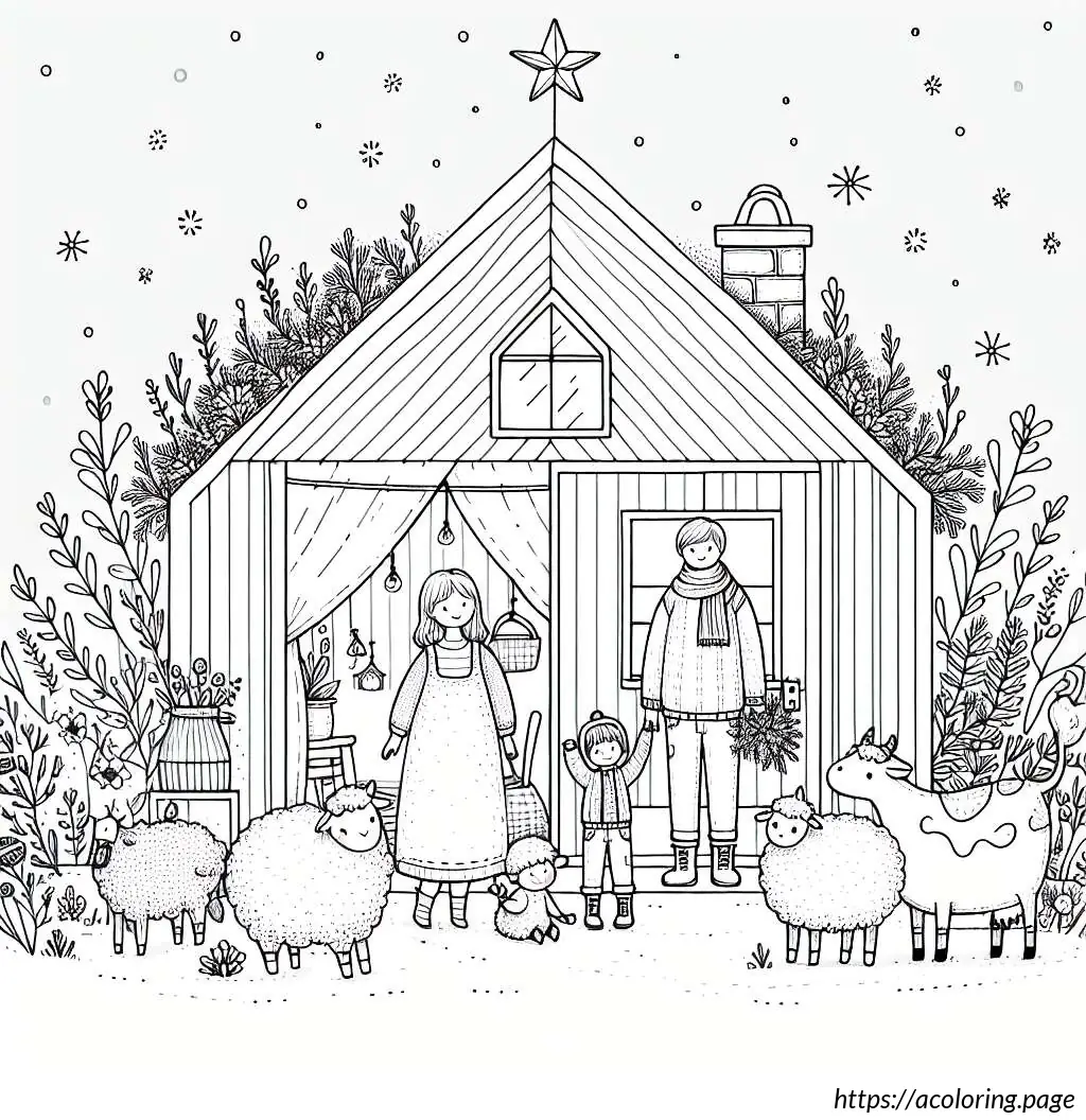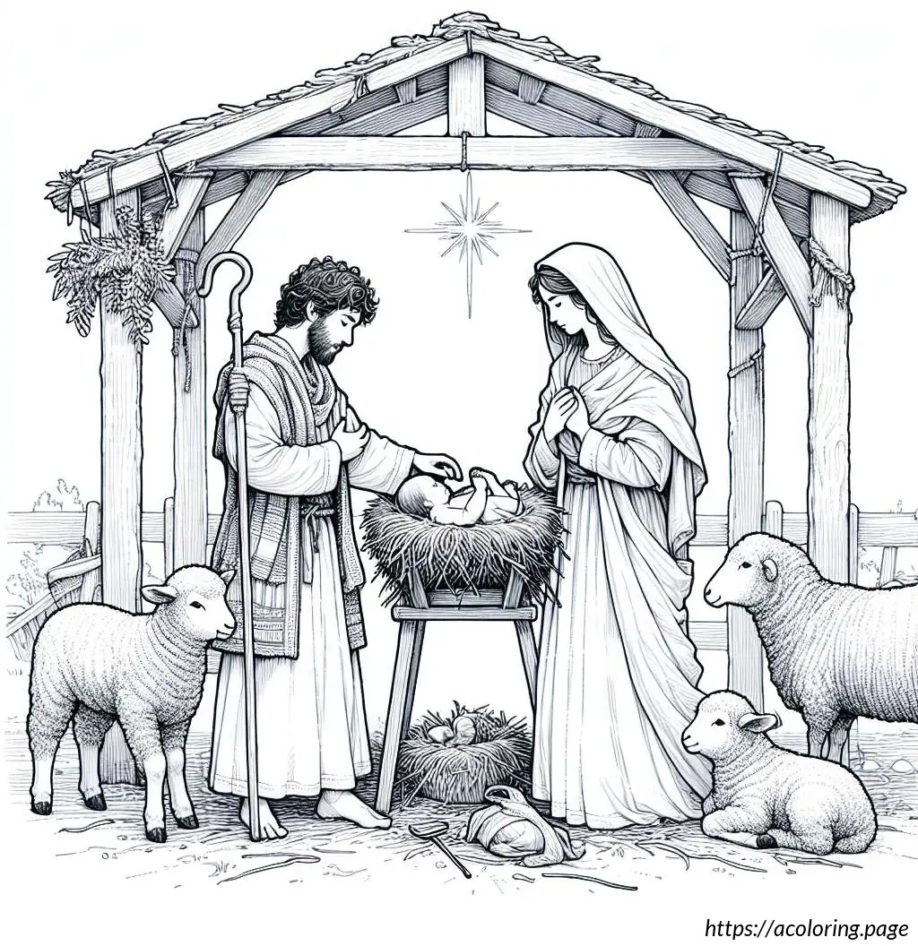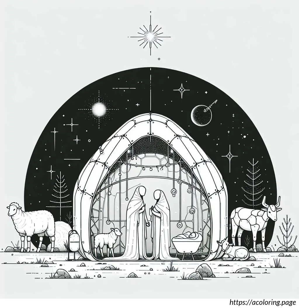 The image is a line drawing depicting a traditional Nativity scene, which includes the following elements: