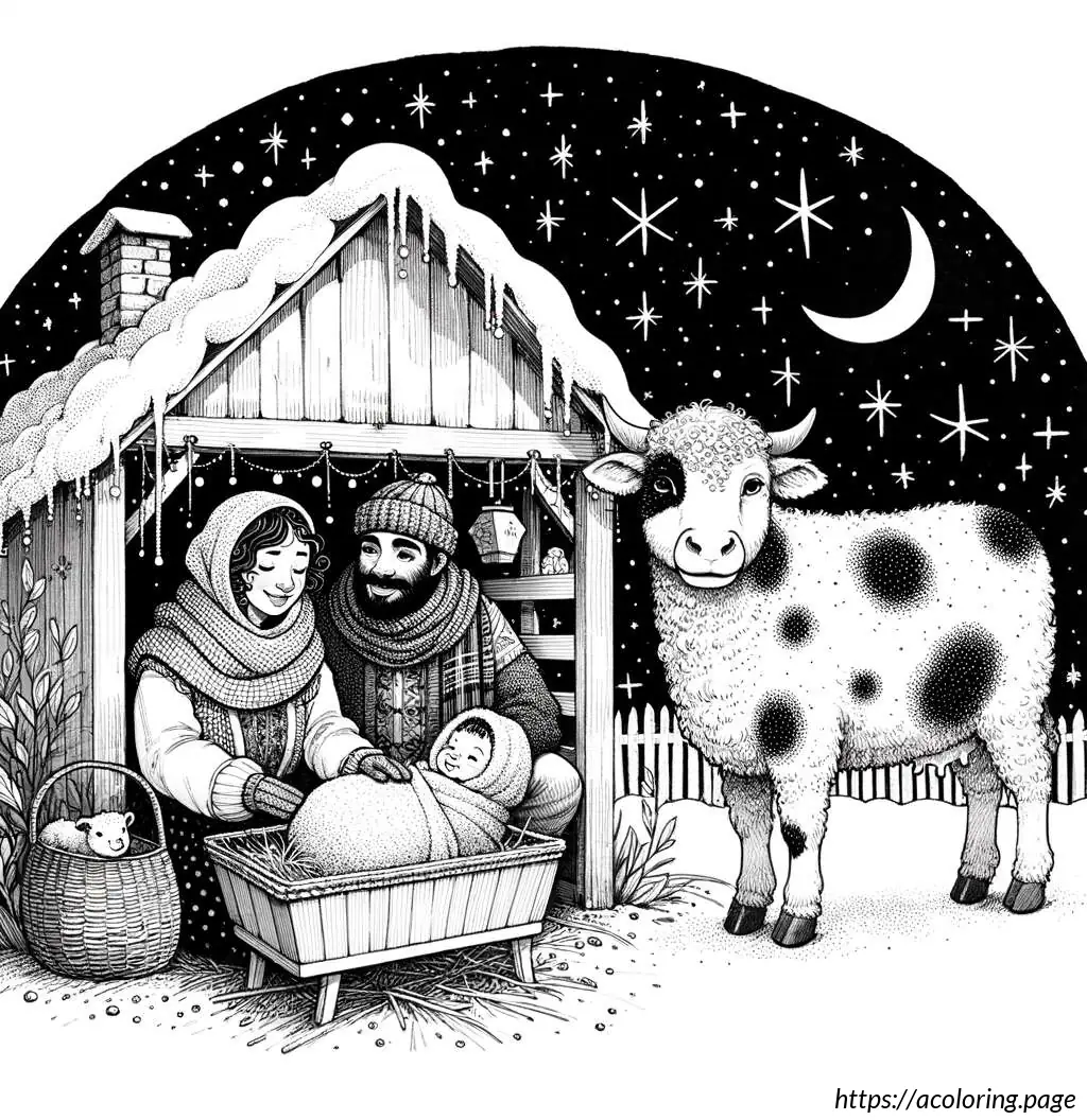 - A cow on the right side of the scene, standing and also facing the center where the baby is placed.