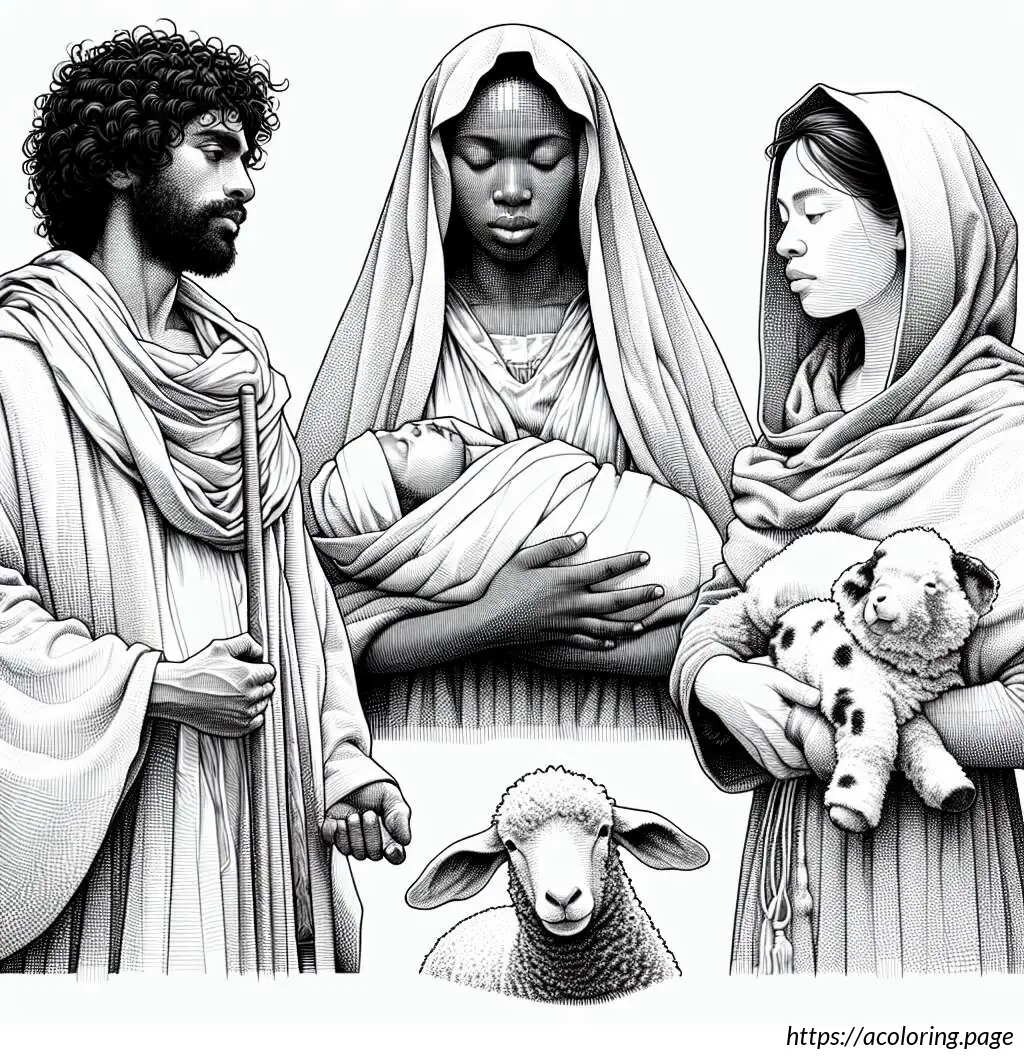 - A sheep on the left side of the scene, standing and facing towards the baby.