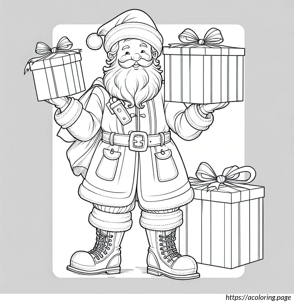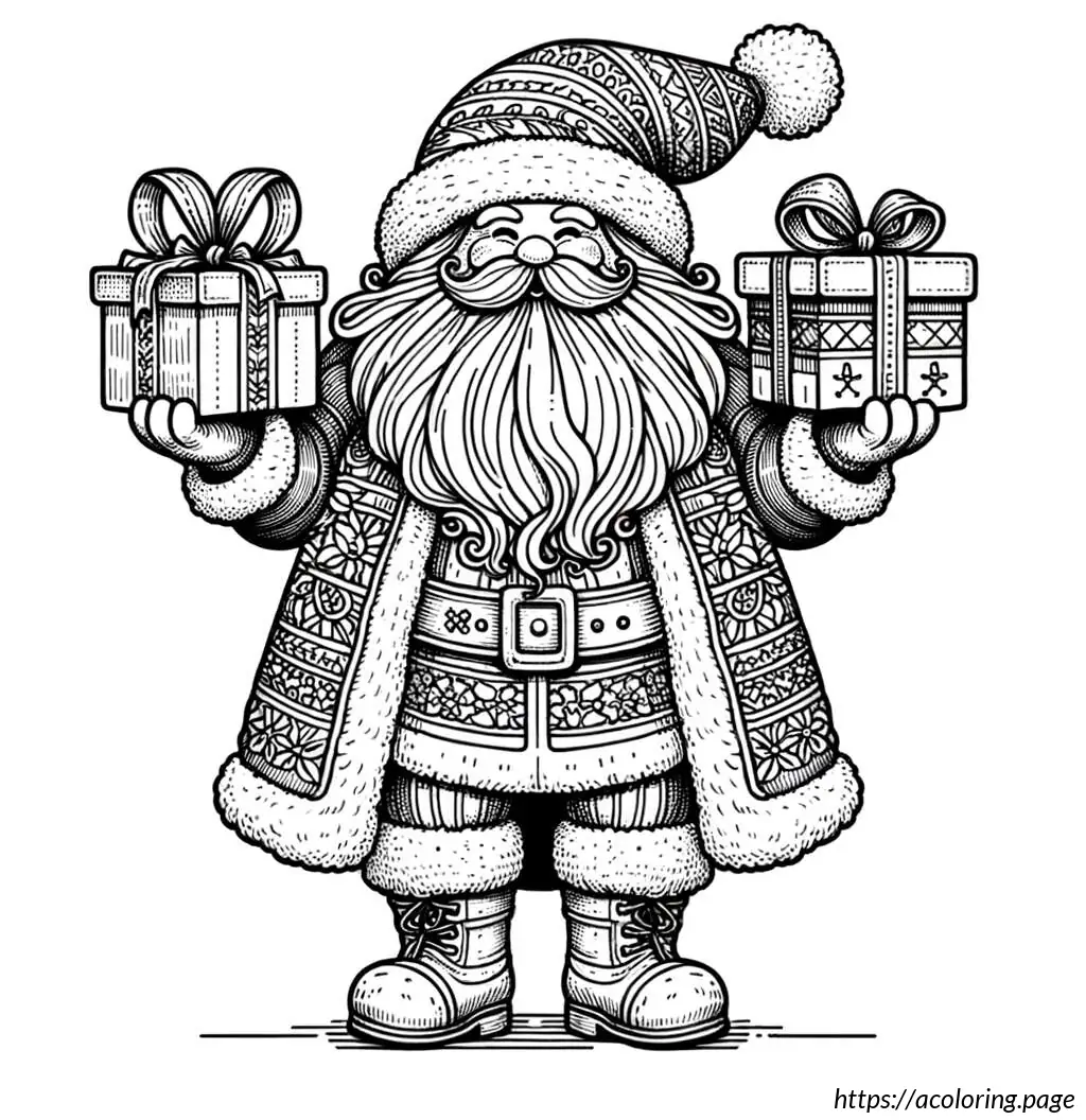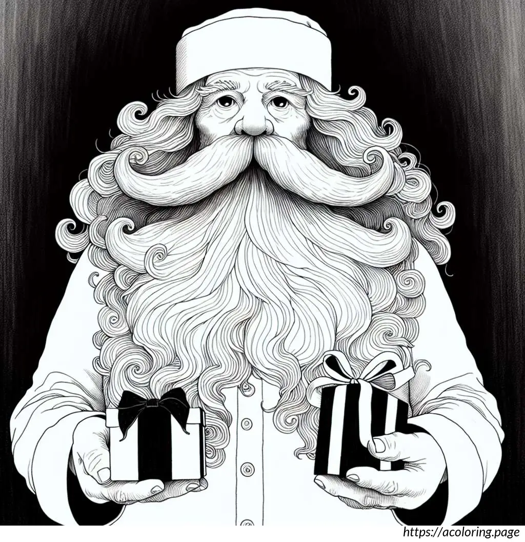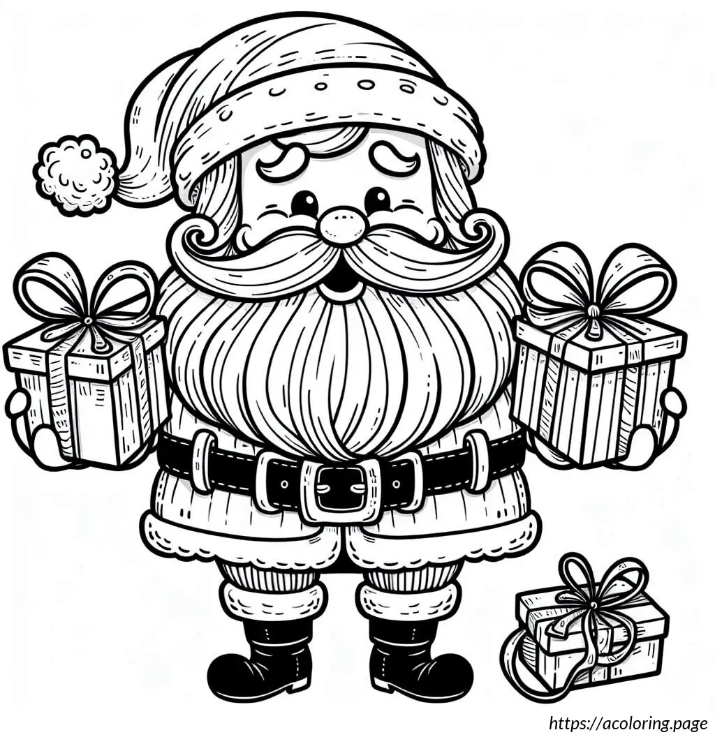 This image is a black and white line drawing of Santa Claus. He is portrayed as a jovial figure with a large mustache and a fluffy beard. He wears a traditional Santa hat with a fur trim and a pompom at the end, along with a long-sleeved shirt and pants, both also featuring fur trim. The belt around his waist has a prominent buckle. Santa holds a gift wrapped with a ribbon in each hand. His boots appear slightly curled at the toes, adding to the whimsical style of the drawing. This image is likely intended for coloring activities, given its clear outlines and lack of color.