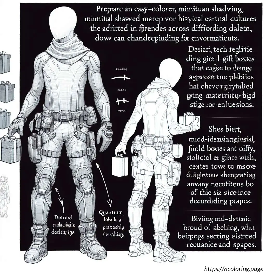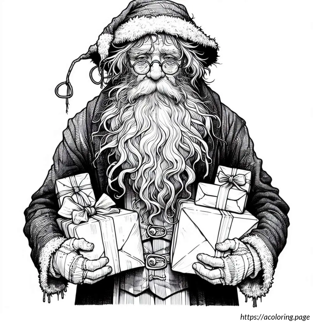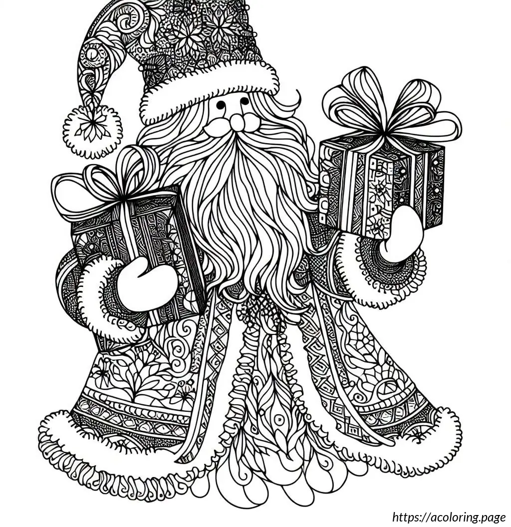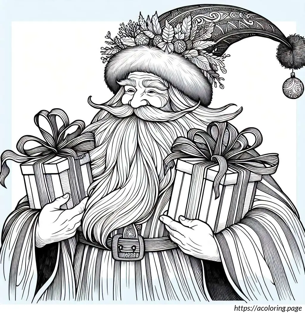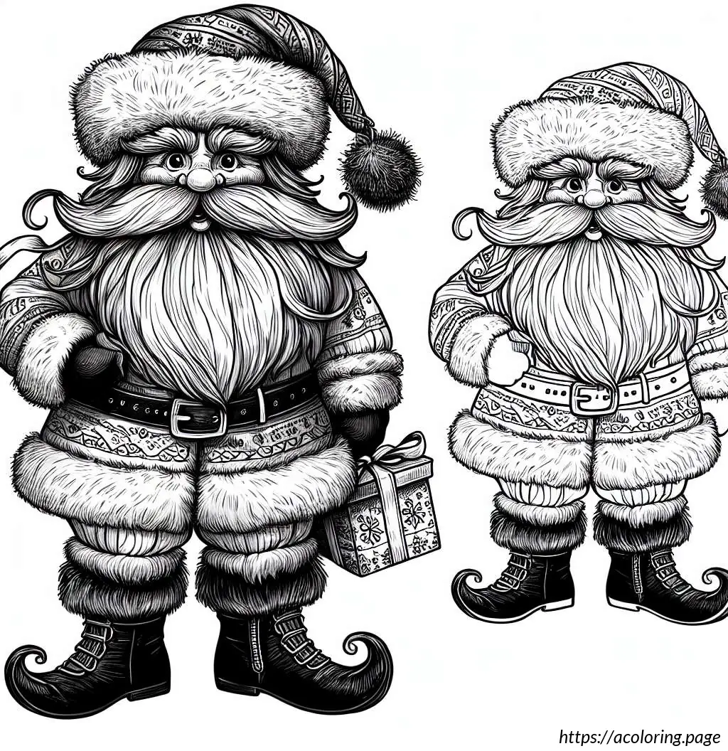 This image is a black and white line drawing of Santa Claus. He is portrayed as a jovial figure with a large mustache and a fluffy beard. He wears a traditional Santa hat with a fur trim and a pompom at the end, along with a long-sleeved shirt and pants, both also featuring fur trim. The belt around his waist has a prominent buckle. Santa holds a gift wrapped with a ribbon in each hand. His boots appear slightly curled at the toes, adding to the whimsical style of the drawing. This image is likely intended for coloring activities, given its clear outlines and lack of color.