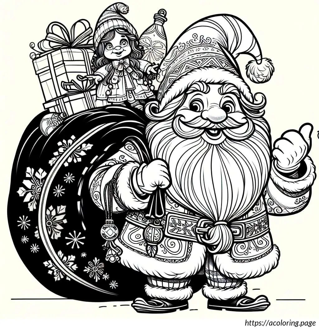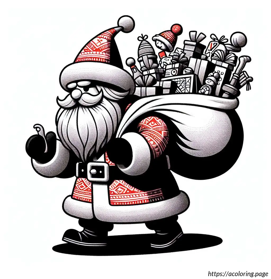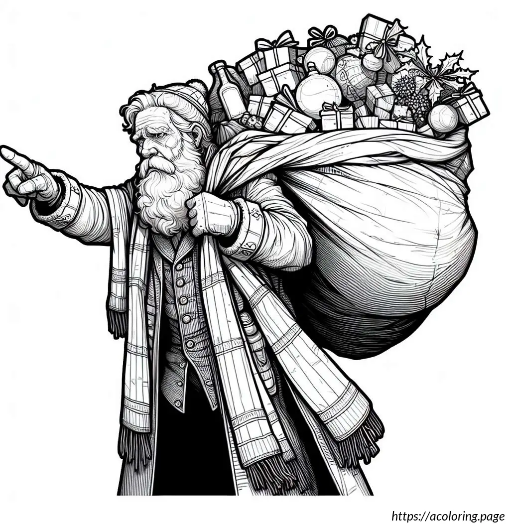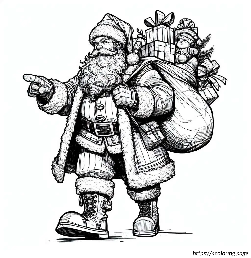 This is a black and white drawing of a cartoon character resembling Santa Claus. The character is depicted with a large, bushy beard and a friendly facial expression, wearing a traditional Santa hat, jacket, gloves, belt, and boots. He is carrying an oversized sack on his back, overflowing with various gifts. One of the gifts, a toy resembling a doll, is visible on top of the sack. The Santa figure is pointing forward with his right hand as if guiding or indicating direction. The style is simple and bold, typical of cartoon illustrations, which makes it ideal for coloring.
