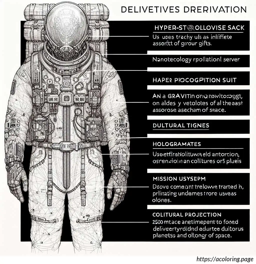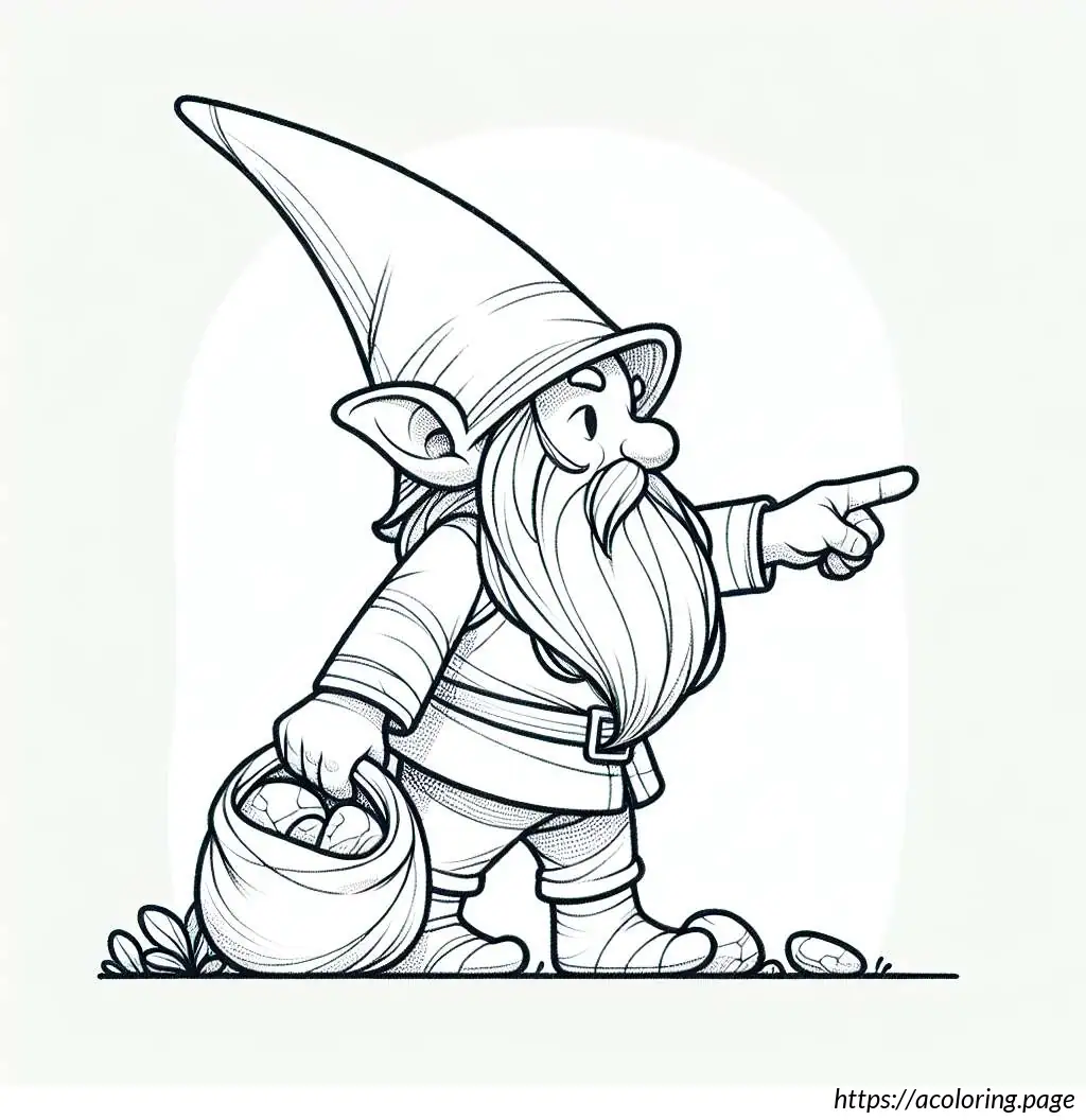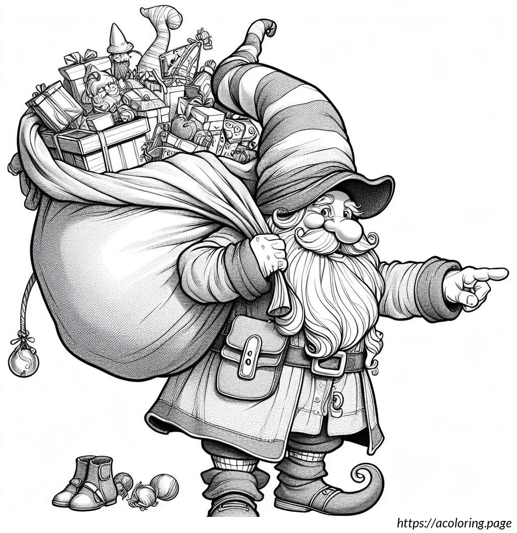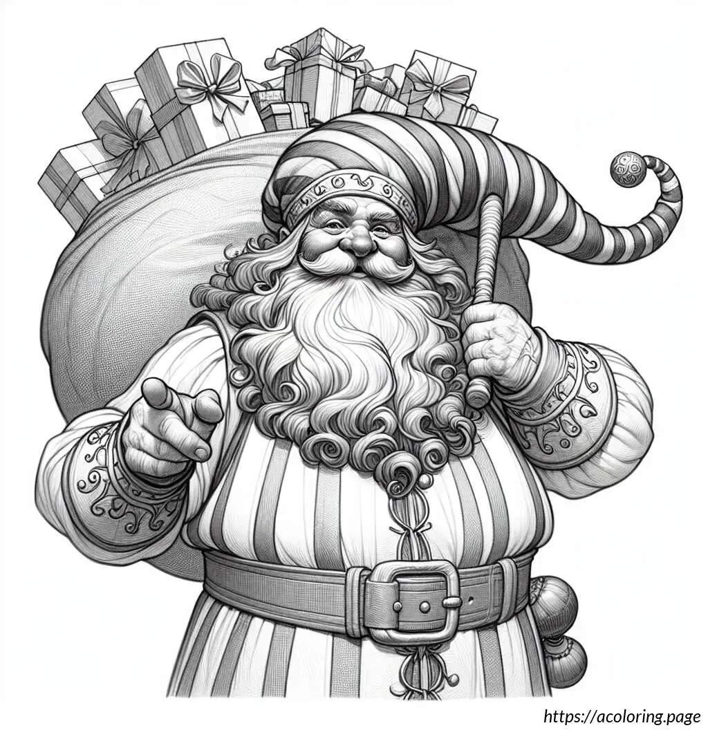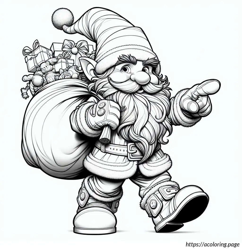 This is a black and white drawing of a cartoon character resembling Santa Claus. The character is depicted with a large, bushy beard and a friendly facial expression, wearing a traditional Santa hat, jacket, gloves, belt, and boots. He is carrying an oversized sack on his back, overflowing with various gifts. One of the gifts, a toy resembling a doll, is visible on top of the sack. The Santa figure is pointing forward with his right hand as if guiding or indicating direction. The style is simple and bold, typical of cartoon illustrations, which makes it ideal for coloring.
