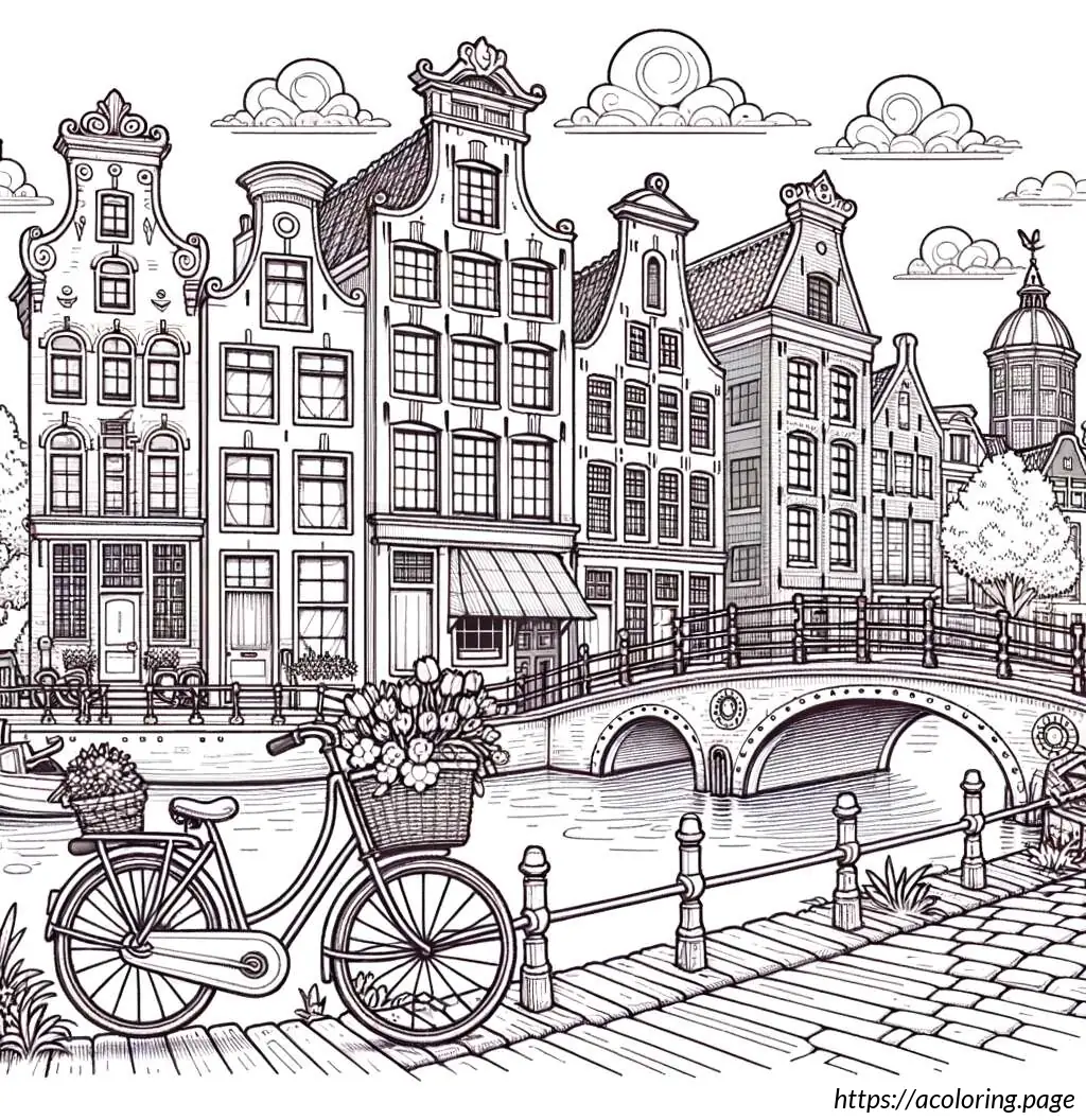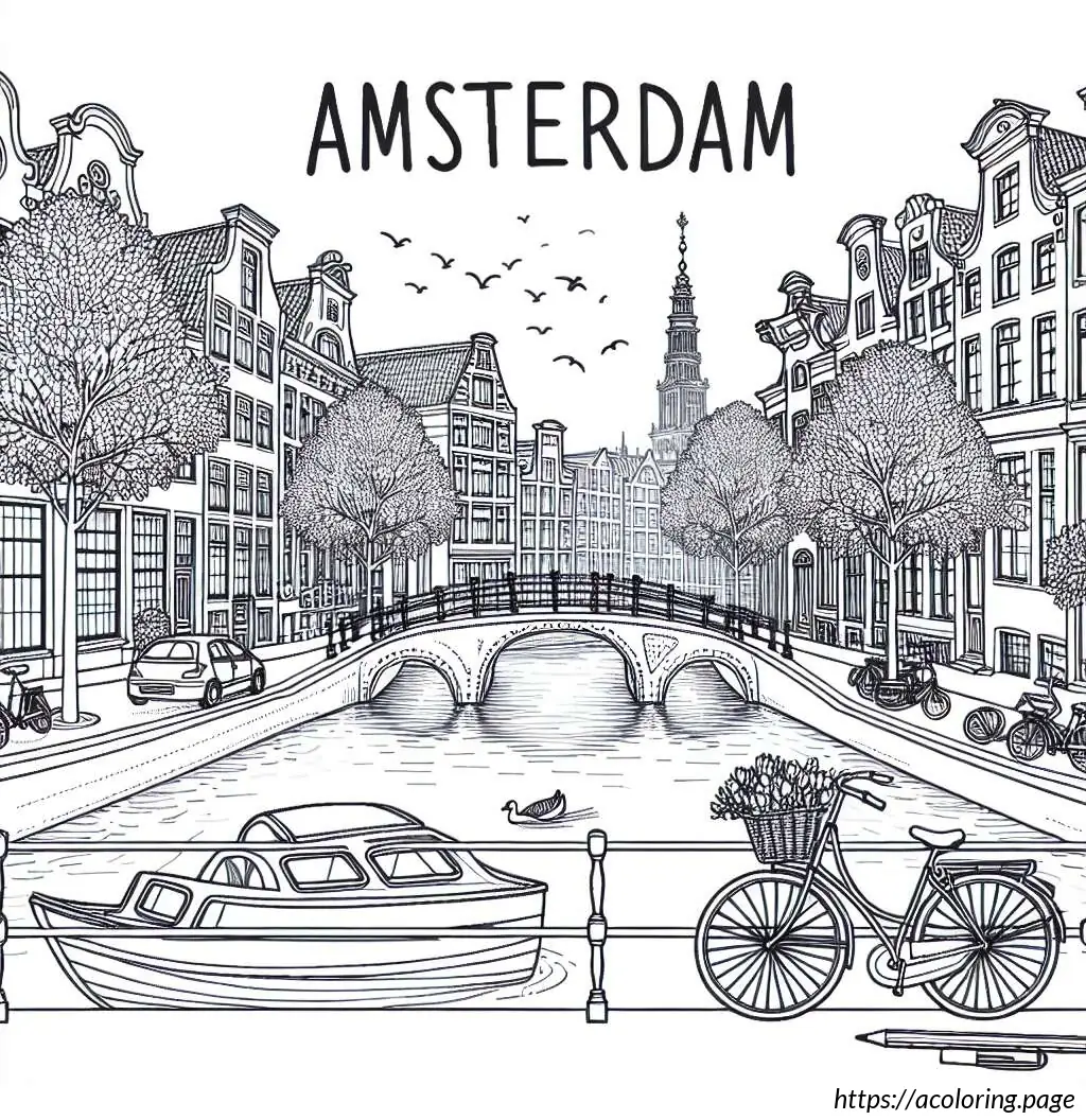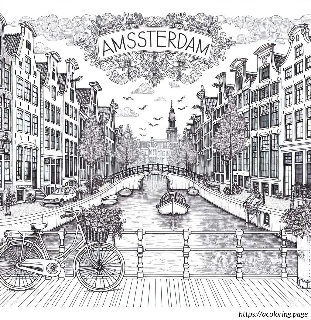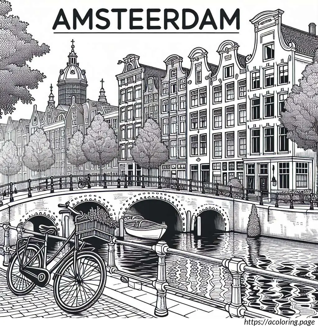 This is a black and white drawing depicting a scenic view of Amsterdam. The image features traditional Dutch architecture with narrow, tall houses that have distinctive stepped gable rooftops. There”s a canal in the foreground with a quaint bridge arching over it, and a houseboat can be seen partially in the scene to the right.In the foreground, there is a beautifully decorated bicycle, a common mode of transport in the city, positioned on the left side. The bike has a front basket filled with flowers, adding a charming, personal touch typical of the vibrant, everyday life in Amsterdam. A path and a fence run along the canal”s edge. The word “AMSTERDAM” is prominently displayed at the top of the image in bold, cartoonish letters, framed by a slightly cloudy sky. The overall style is clear and illustrative, likely intended for use as a coloring page or a tourist souvenir design.