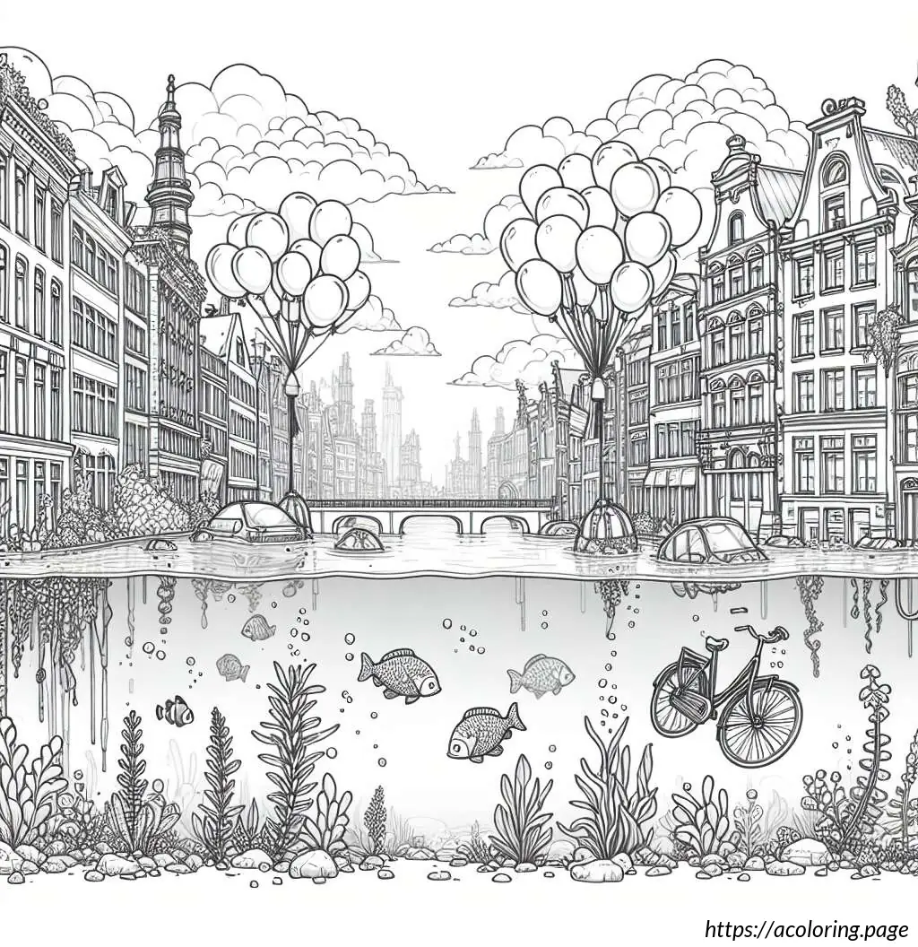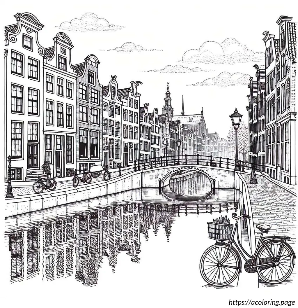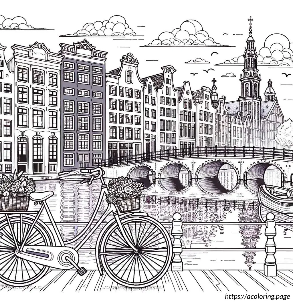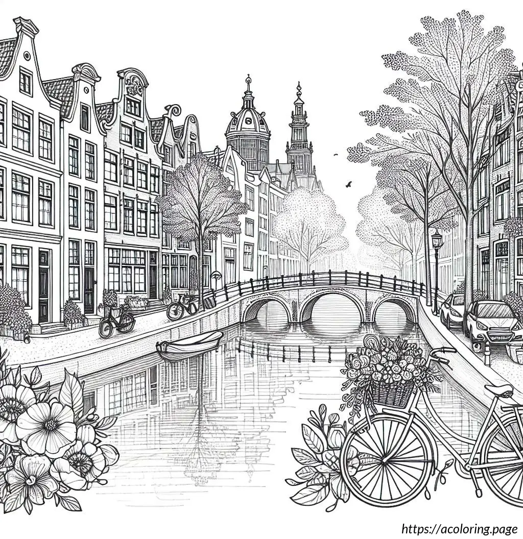 This is a black and white drawing depicting a scenic view of Amsterdam. The image features traditional Dutch architecture with narrow, tall houses that have distinctive stepped gable rooftops. There”s a canal in the foreground with a quaint bridge arching over it, and a houseboat can be seen partially in the scene to the right.In the foreground, there is a beautifully decorated bicycle, a common mode of transport in the city, positioned on the left side. The bike has a front basket filled with flowers, adding a charming, personal touch typical of the vibrant, everyday life in Amsterdam. A path and a fence run along the canal”s edge. The word “AMSTERDAM” is prominently displayed at the top of the image in bold, cartoonish letters, framed by a slightly cloudy sky. The overall style is clear and illustrative, likely intended for use as a coloring page or a tourist souvenir design.