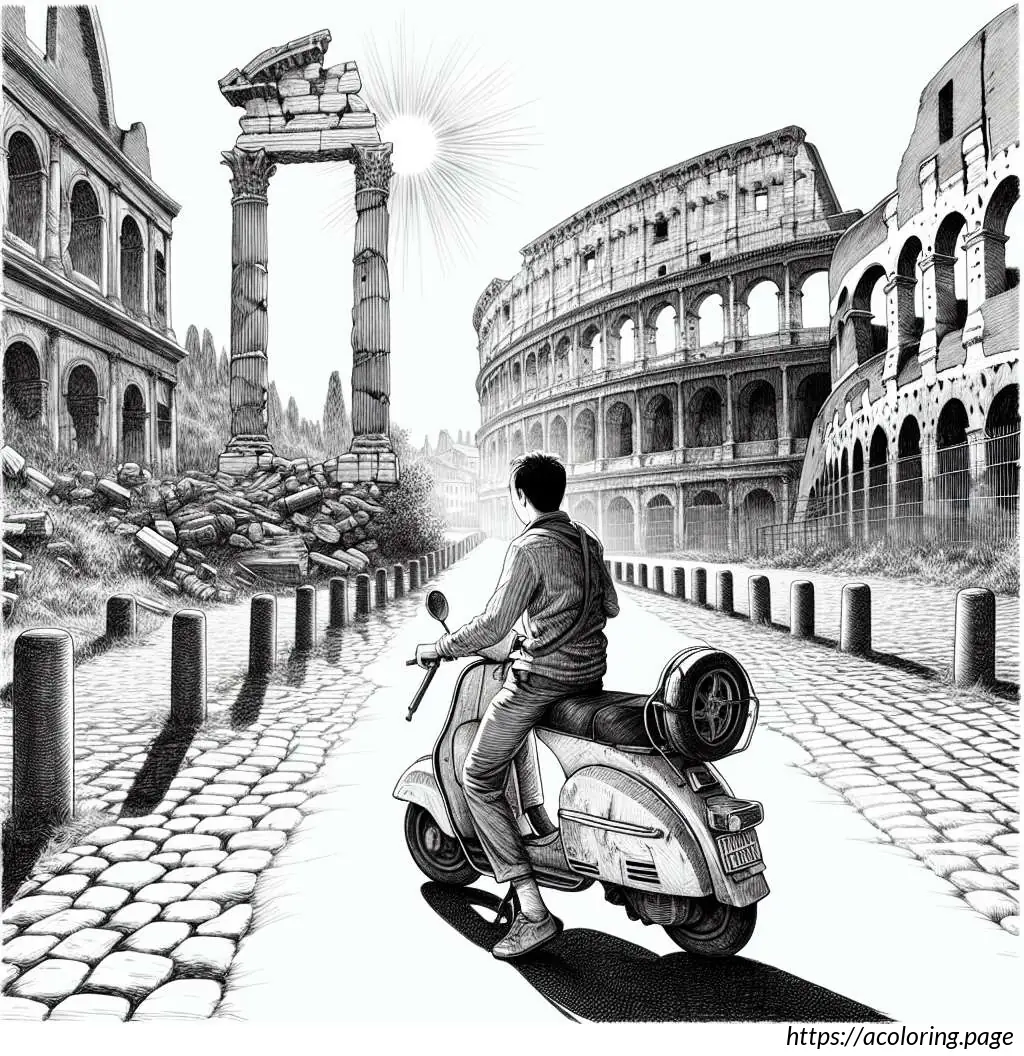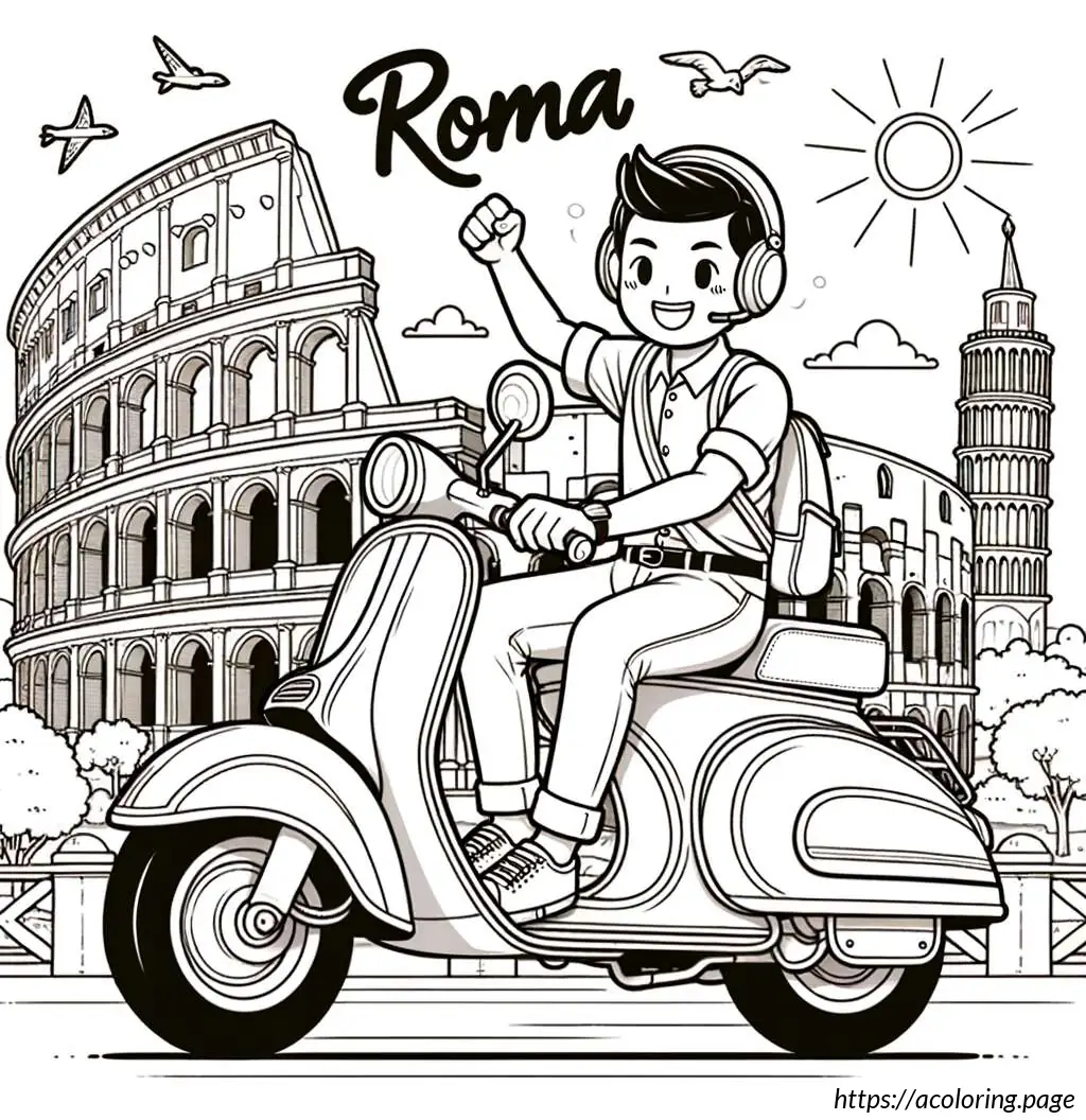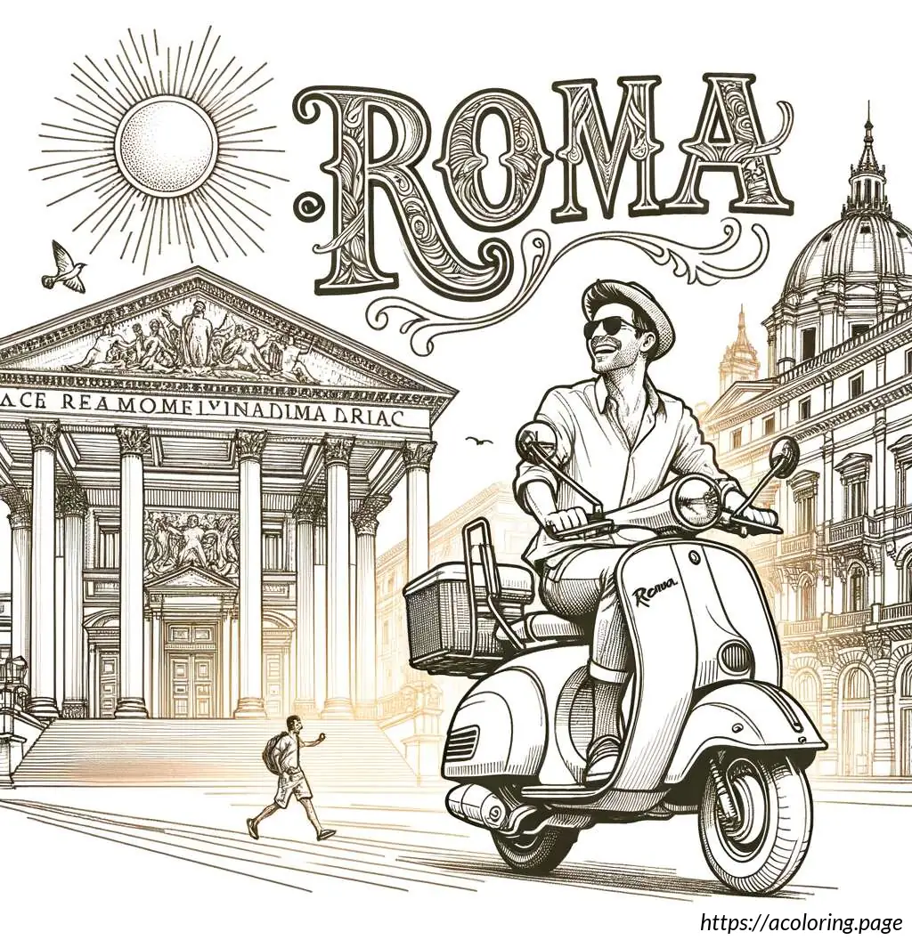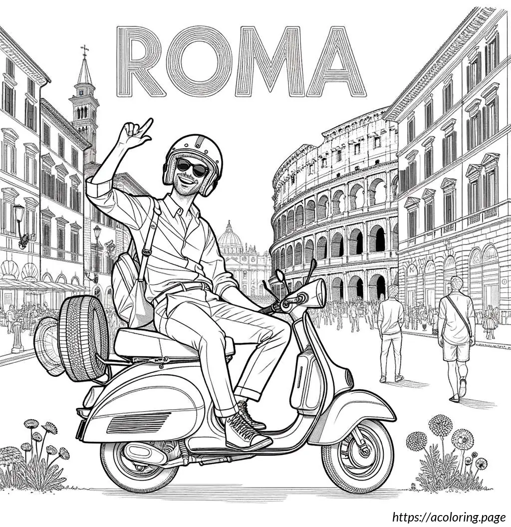 This image is a black and white line drawing that captures a lively scene set in Rome, as indicated by the word “ROMA” in large, bold letters at the top. The scene includes notable landmarks such as the Colosseum, which is partially visible in the background, suggesting a typical Roman street view.Foregrounded in the image is a happy and relaxed character, presumably a young man, sitting on a classic-style scooter, which seems to be parked. He”s wearing a casual outfit consisting of a short-sleeve shirt and trousers, along with a helmet on his head, suggesting readiness for a ride or safety consciousness. His left arm is raised in a cheerful gesture, possibly waving or simply expressing enjoyment.The background, besides the Colosseum, features hints of other architectural elements which might represent typical Italian buildings and windows. There are also a few simple flowers sketched onto the sidewalk, adding a touch of nature to the urban setting.The overall vibe of the illustration is jovial and touristic, emphasizing the charm and historic appeal of Rome.