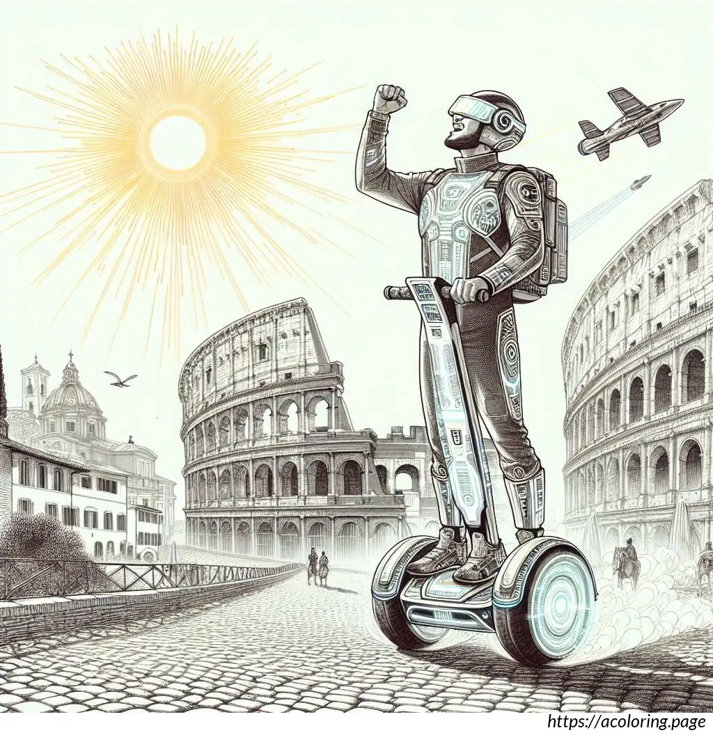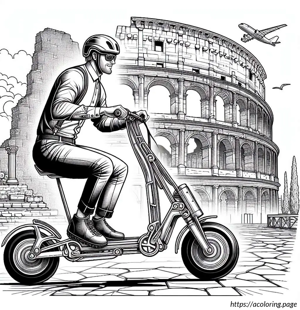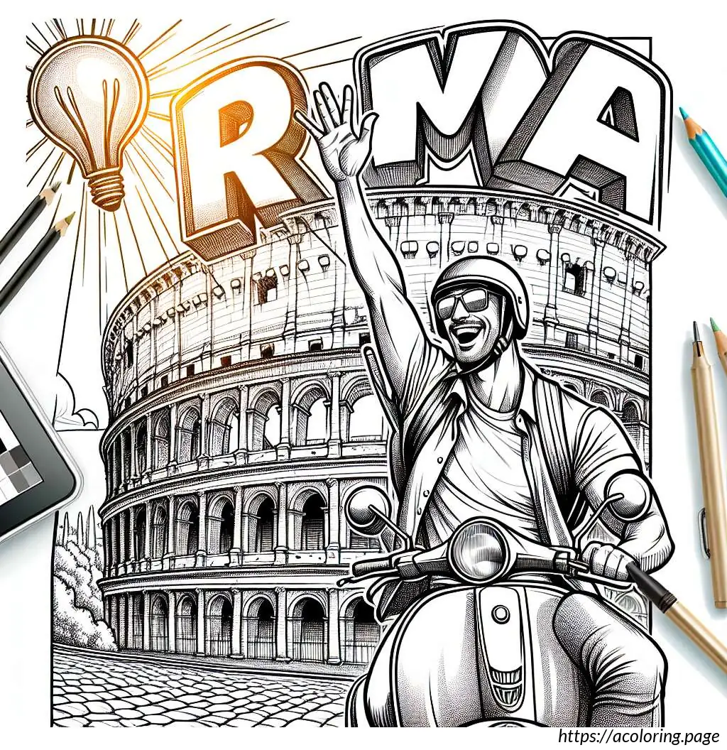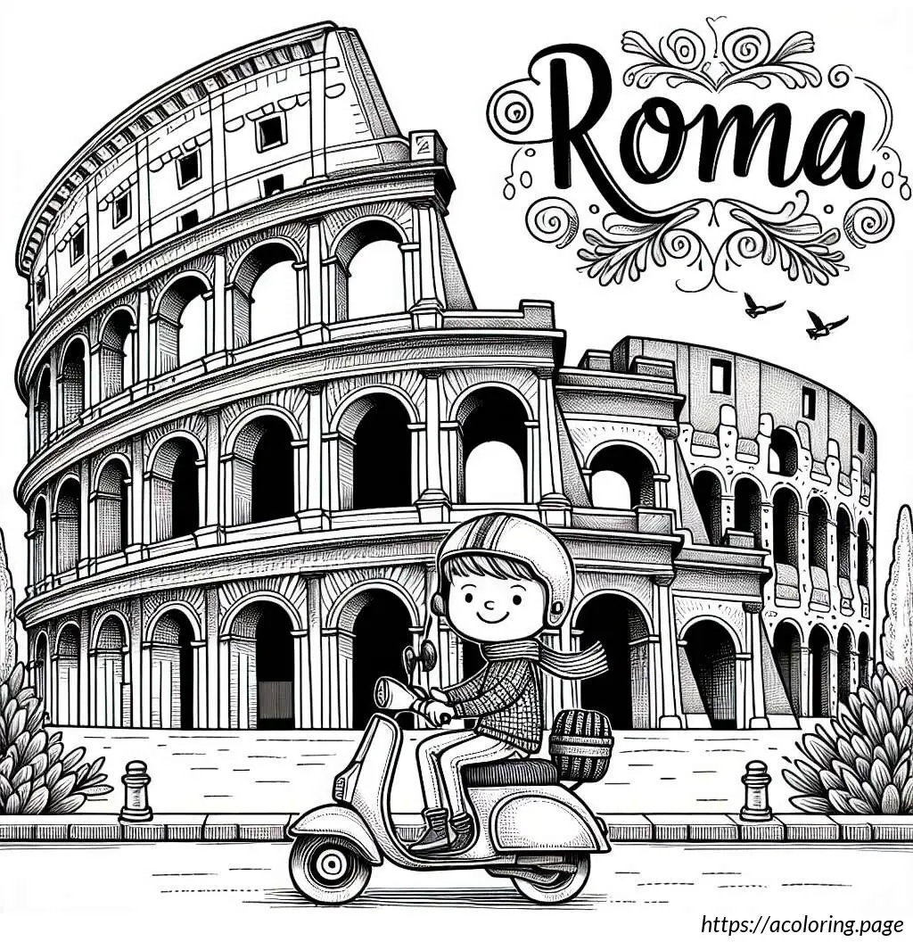 This image is a black and white line drawing that captures a lively scene set in Rome, as indicated by the word “ROMA” in large, bold letters at the top. The scene includes notable landmarks such as the Colosseum, which is partially visible in the background, suggesting a typical Roman street view.Foregrounded in the image is a happy and relaxed character, presumably a young man, sitting on a classic-style scooter, which seems to be parked. He”s wearing a casual outfit consisting of a short-sleeve shirt and trousers, along with a helmet on his head, suggesting readiness for a ride or safety consciousness. His left arm is raised in a cheerful gesture, possibly waving or simply expressing enjoyment.The background, besides the Colosseum, features hints of other architectural elements which might represent typical Italian buildings and windows. There are also a few simple flowers sketched onto the sidewalk, adding a touch of nature to the urban setting.The overall vibe of the illustration is jovial and touristic, emphasizing the charm and historic appeal of Rome.