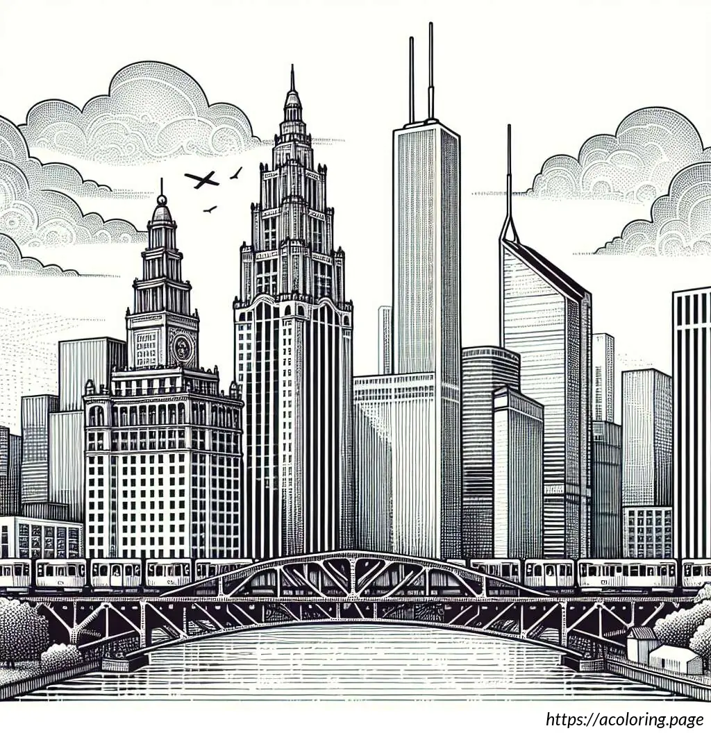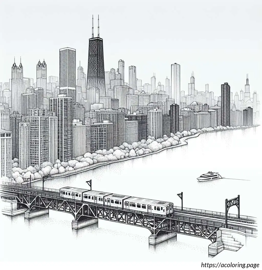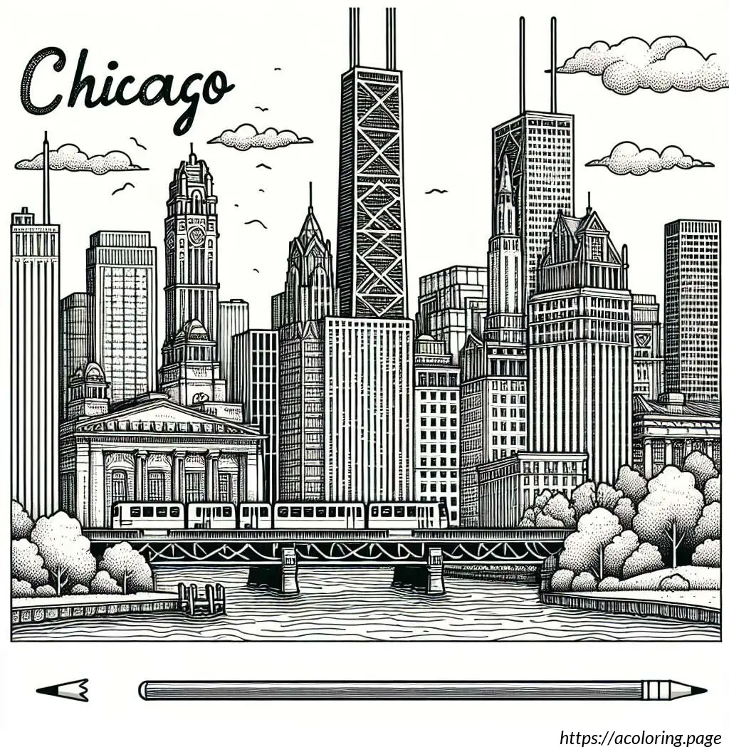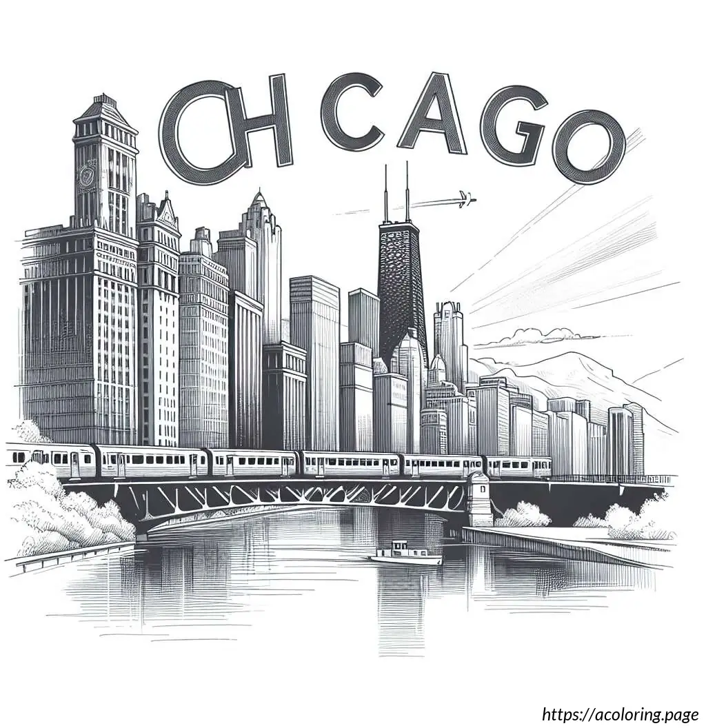 The image is a black and white line drawing, illustrated in the style suitable for coloring. It features a scenic view of Chicago”s iconic cityscape. At the top of the image, the word “CHICAGO” is prominently displayed in bold, block letters, decorated with a simple shading effect to give it a 3D appearance.The skyline includes recognizable buildings such as a tall, slender skyscraper which suggests the inspiration of the John Hancock Center, and a diamond-shaped building that resembles the top of the Crain Communications Building. Additionally, a historiated architectural structure similar to the Chicago Water Tower can be seen to the left side of the image.The foreground shows a depiction of a bridge over a body of water which resembles the bridges over the Chicago River. A train, possibly a representation of the Chicago “L” (elevated train), is captured crossing the bridge, adding a dynamic urban element to the scene.Below the buildings and the bridge, there are simplified representations of trees and clouds, adding to the city”s landscape and providing a balanced composition between the built environment and natural elements. The entire scene is lined along the bottom by a body of water which likely represents Lake Michigan or the Chicago River. Overall, the drawing captures key elements of Chicago”s famous architecture and transportation system with a playful and illustrative charm, ideal for an educational or recreational coloring activity.