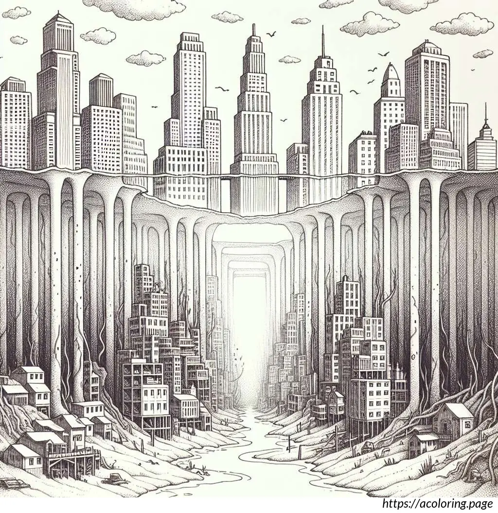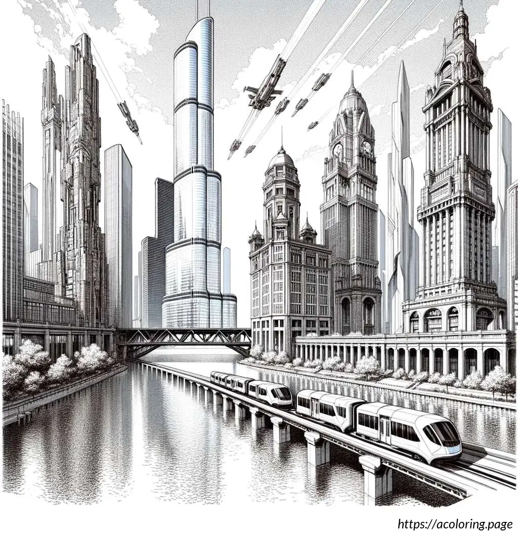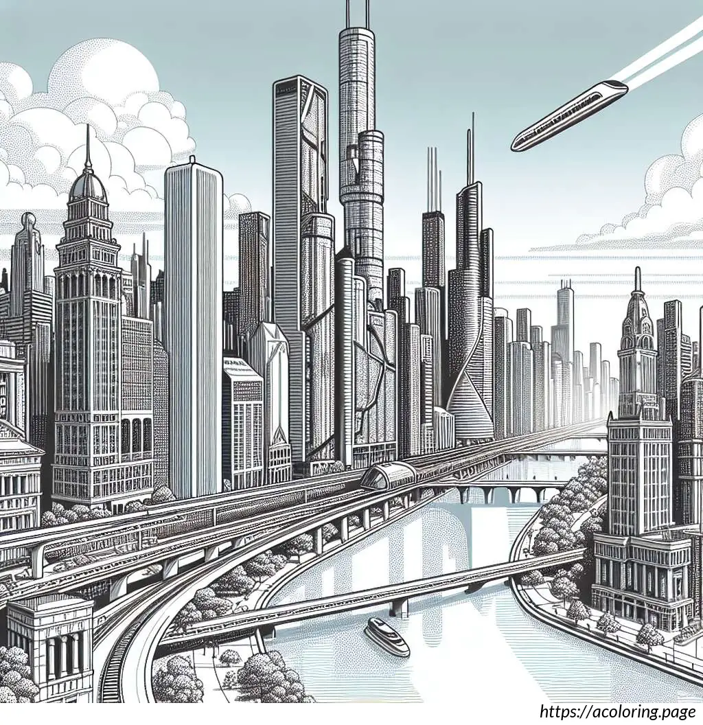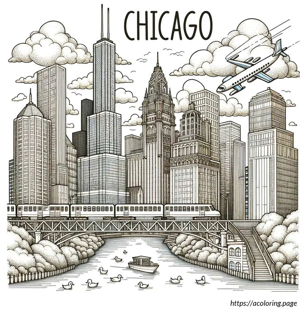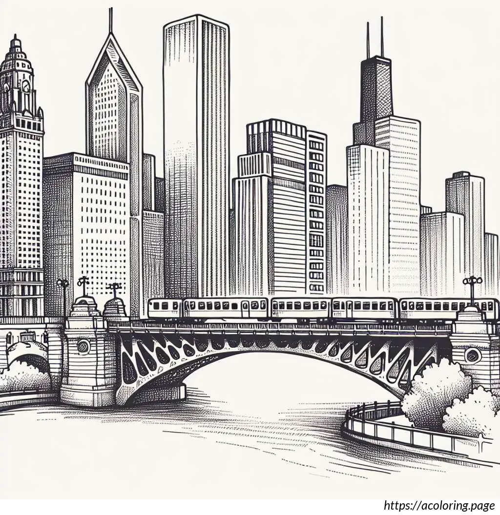 The image is a black and white line drawing, illustrated in the style suitable for coloring. It features a scenic view of Chicago”s iconic cityscape. At the top of the image, the word “CHICAGO” is prominently displayed in bold, block letters, decorated with a simple shading effect to give it a 3D appearance.The skyline includes recognizable buildings such as a tall, slender skyscraper which suggests the inspiration of the John Hancock Center, and a diamond-shaped building that resembles the top of the Crain Communications Building. Additionally, a historiated architectural structure similar to the Chicago Water Tower can be seen to the left side of the image.The foreground shows a depiction of a bridge over a body of water which resembles the bridges over the Chicago River. A train, possibly a representation of the Chicago “L” (elevated train), is captured crossing the bridge, adding a dynamic urban element to the scene.Below the buildings and the bridge, there are simplified representations of trees and clouds, adding to the city”s landscape and providing a balanced composition between the built environment and natural elements. The entire scene is lined along the bottom by a body of water which likely represents Lake Michigan or the Chicago River. Overall, the drawing captures key elements of Chicago”s famous architecture and transportation system with a playful and illustrative charm, ideal for an educational or recreational coloring activity.