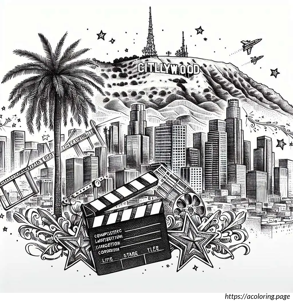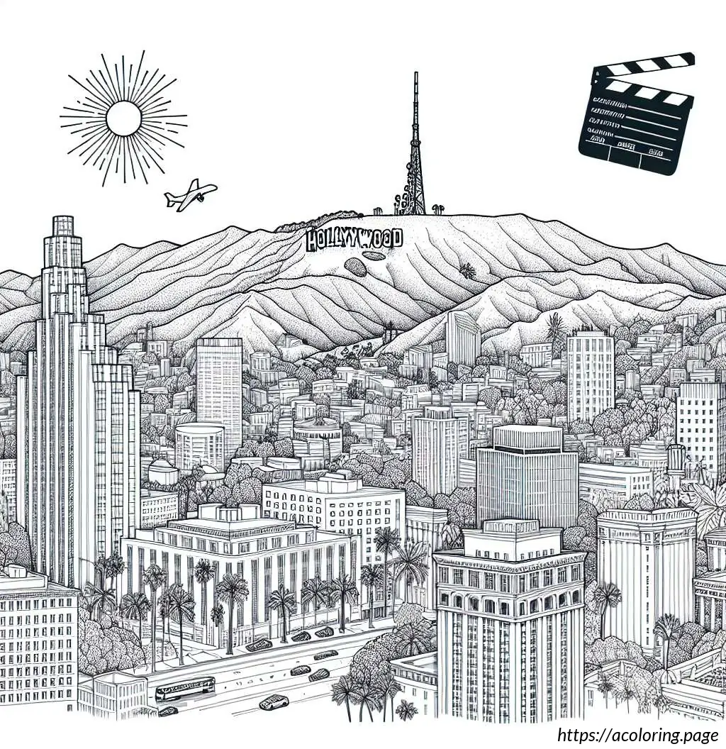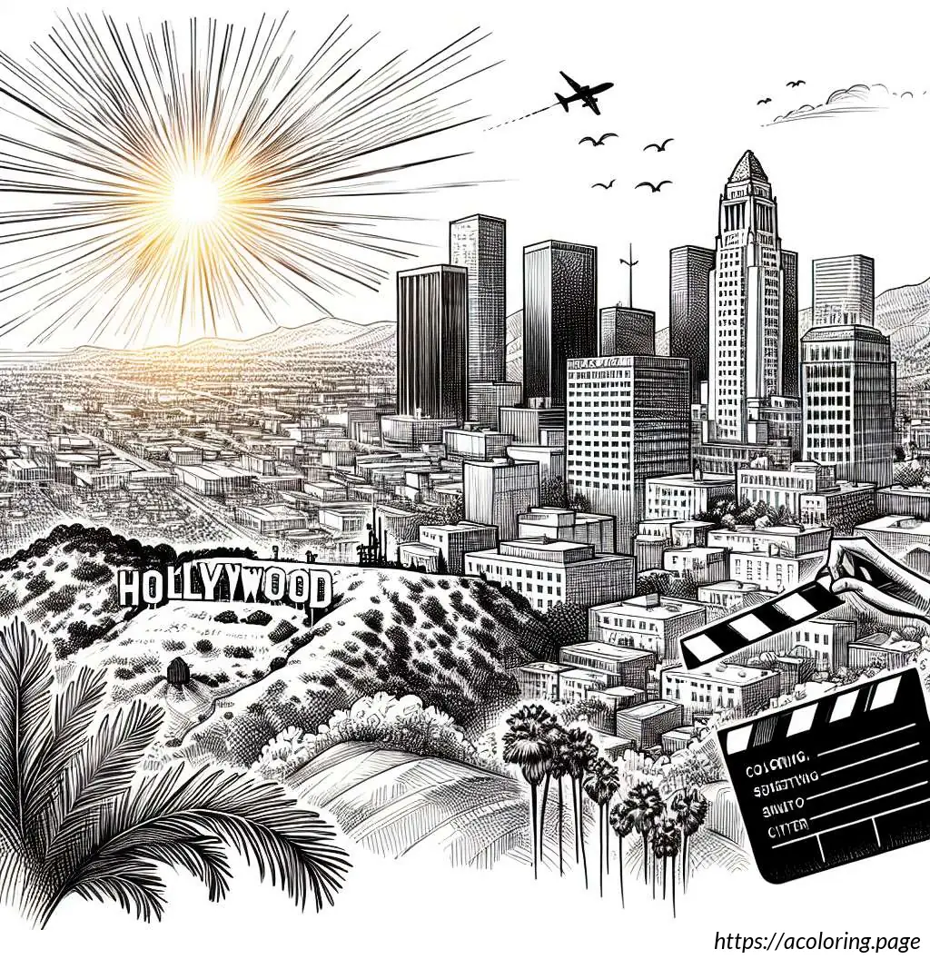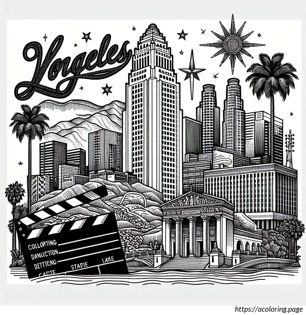 This image is a black-and-white line drawing that features iconic elements of Los Angeles. At the top of the image, the famous Hollywood Hills are depicted with the large “Hollywood” sign, and there”s a palm tree on the left side. “Los Angeles” is written in a bold and stylized font with stars embellishing the text.In the foreground, a prominent building resembling the Los Angeles City Hall, characterized by its tall, narrow tower and art deco architectural style, dominates the scene. Surrounding this building are other high-rise buildings, representative of the city”s skyline.There is also a depiction of a clapperboard, which is commonly used in film production, symbolizing the city”s strong association with the movie industry. The overall scene is sunlit, with a sun symbol shown above the skyline, suggesting a typical sunny day in Los Angeles. This artwork captures a blend of natural elements, distinctive architecture, and cultural symbols associated with Los Angeles.