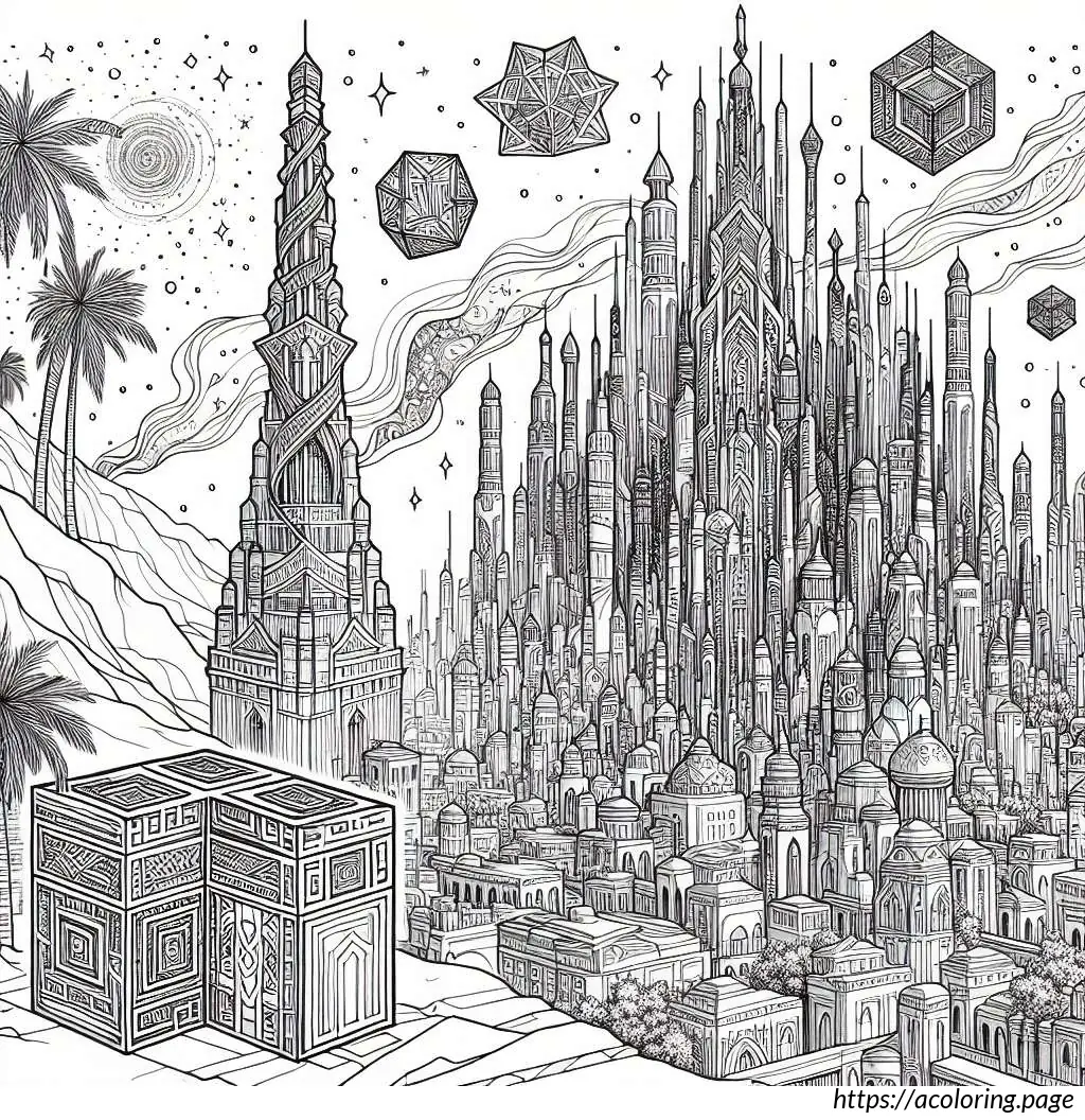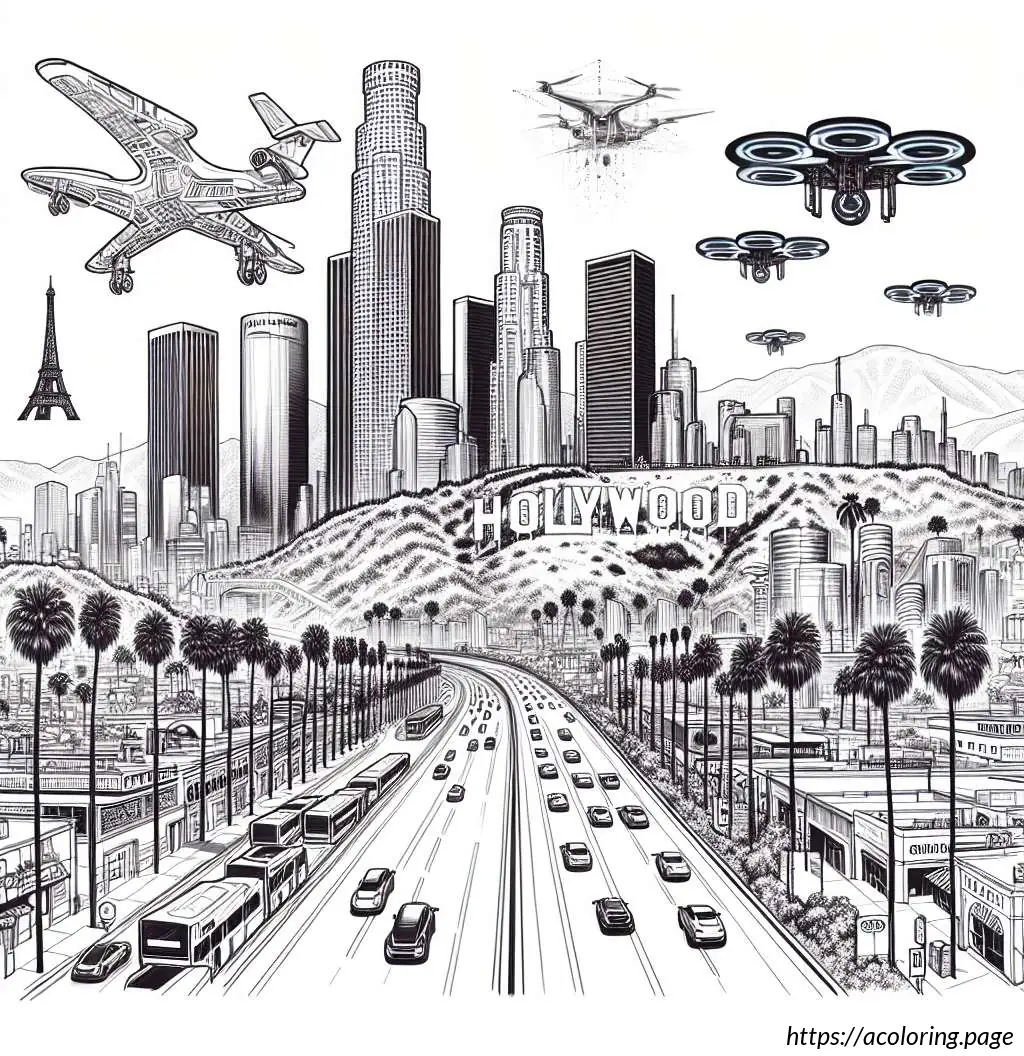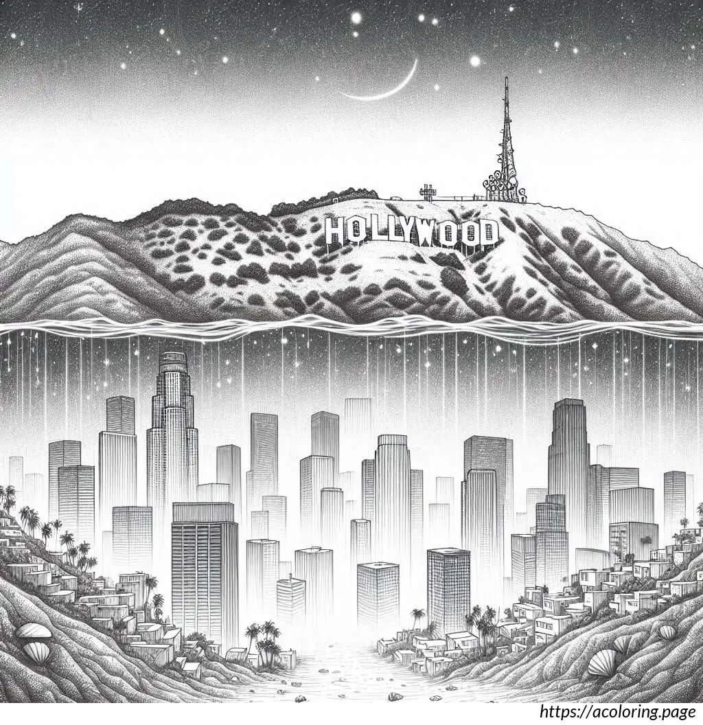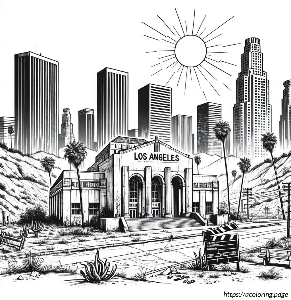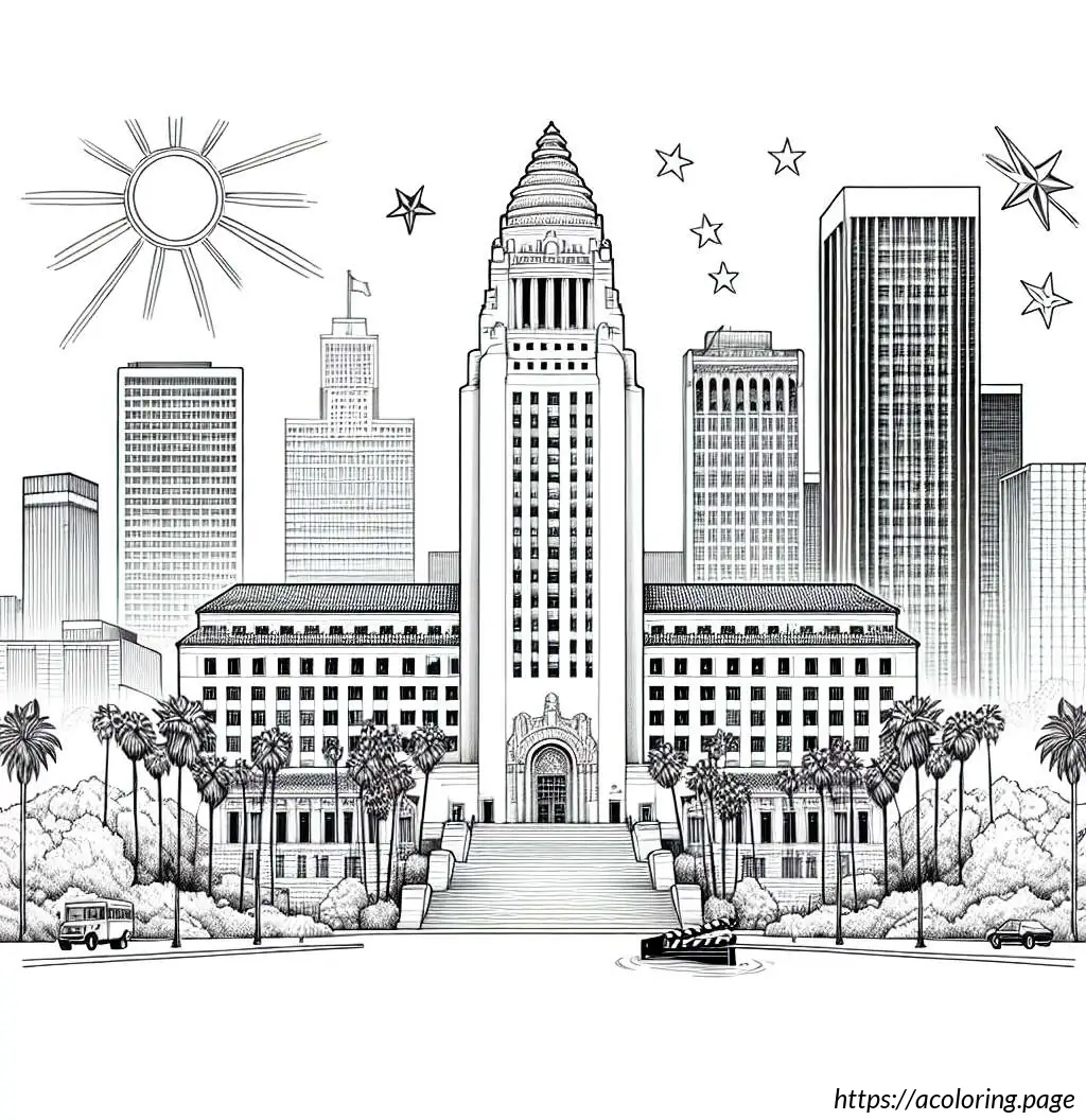 This image is a black-and-white line drawing that features iconic elements of Los Angeles. At the top of the image, the famous Hollywood Hills are depicted with the large “Hollywood” sign, and there”s a palm tree on the left side. “Los Angeles” is written in a bold and stylized font with stars embellishing the text.In the foreground, a prominent building resembling the Los Angeles City Hall, characterized by its tall, narrow tower and art deco architectural style, dominates the scene. Surrounding this building are other high-rise buildings, representative of the city”s skyline.There is also a depiction of a clapperboard, which is commonly used in film production, symbolizing the city”s strong association with the movie industry. The overall scene is sunlit, with a sun symbol shown above the skyline, suggesting a typical sunny day in Los Angeles. This artwork captures a blend of natural elements, distinctive architecture, and cultural symbols associated with Los Angeles.
