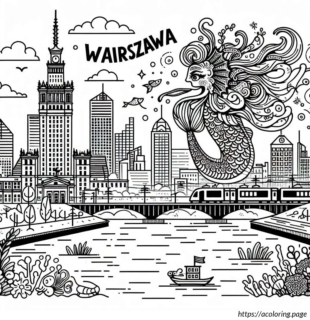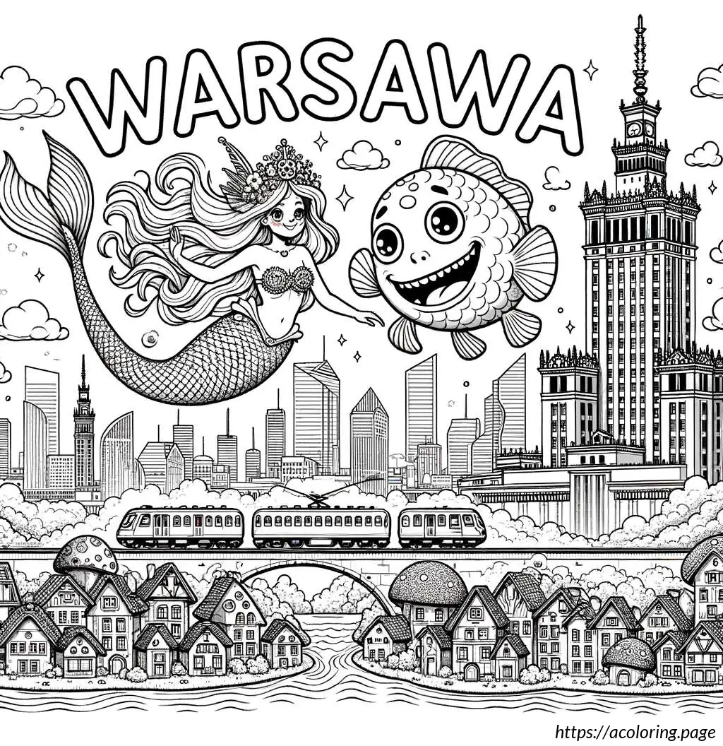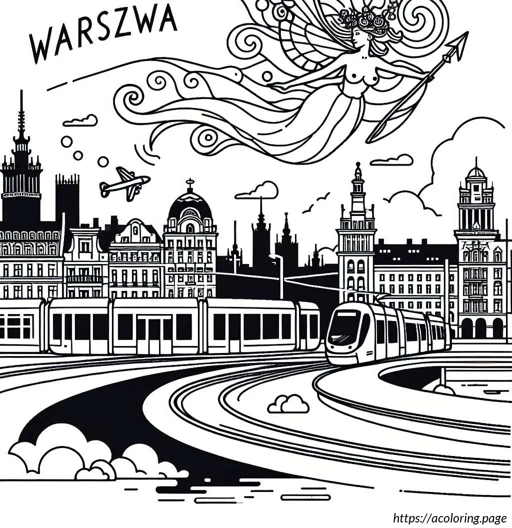 Overall, the illustration combines real elements of Warsaw’s urban environment with whimsical, artistic touches, presenting an engaging and dynamic portrayal of the city.