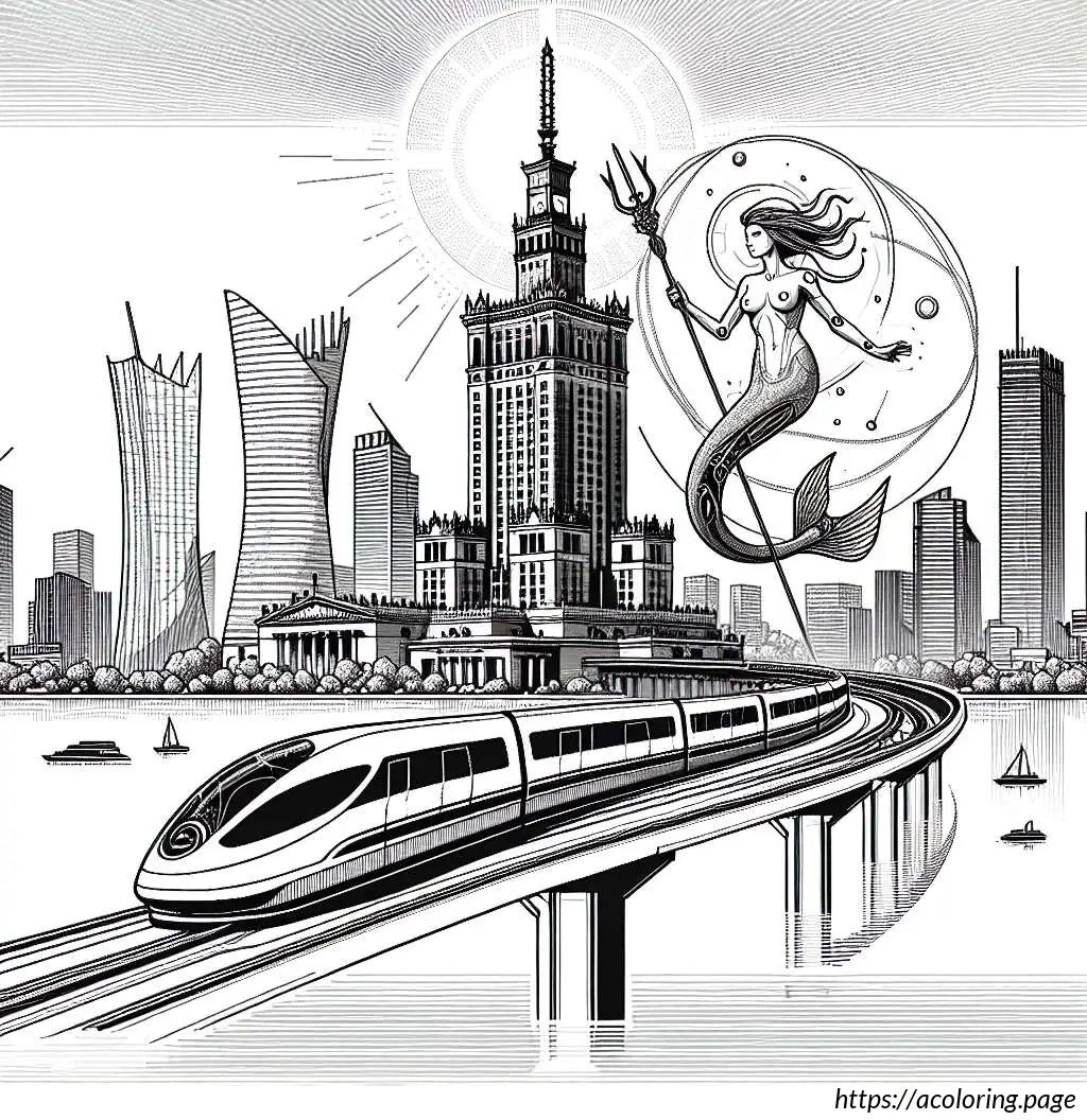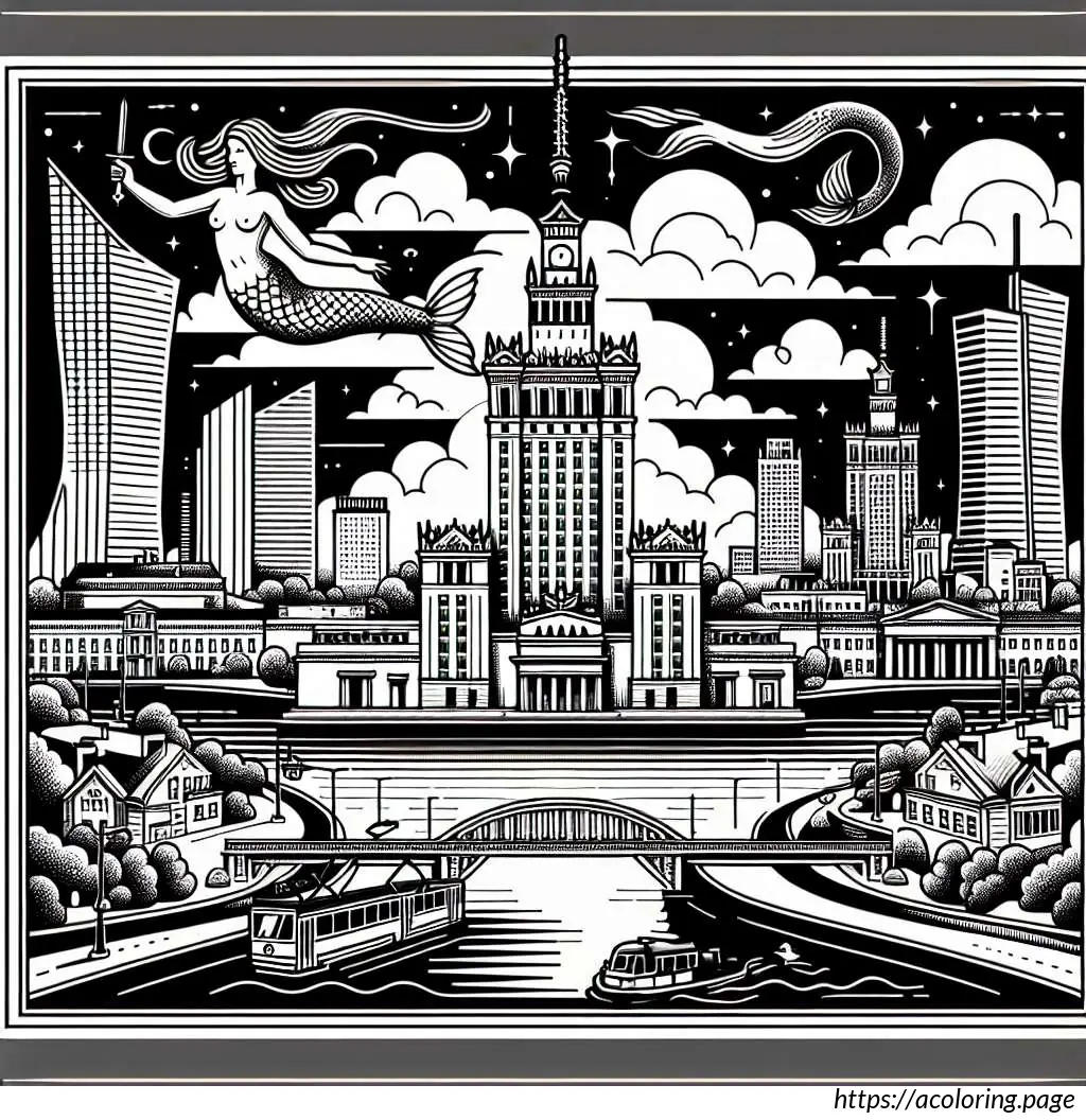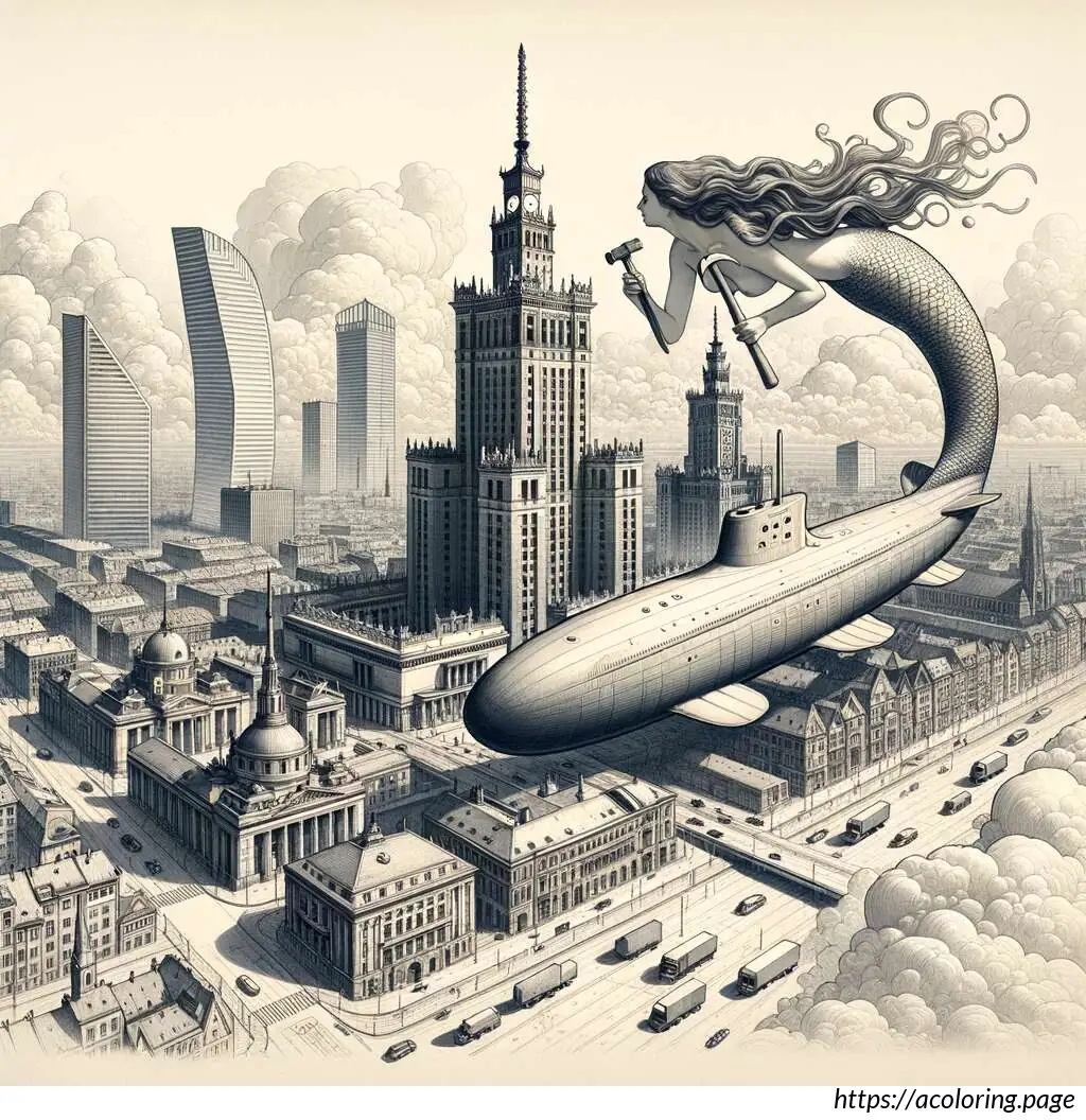 Overall, the illustration combines real elements of Warsaw’s urban environment with whimsical, artistic touches, presenting an engaging and dynamic portrayal of the city.